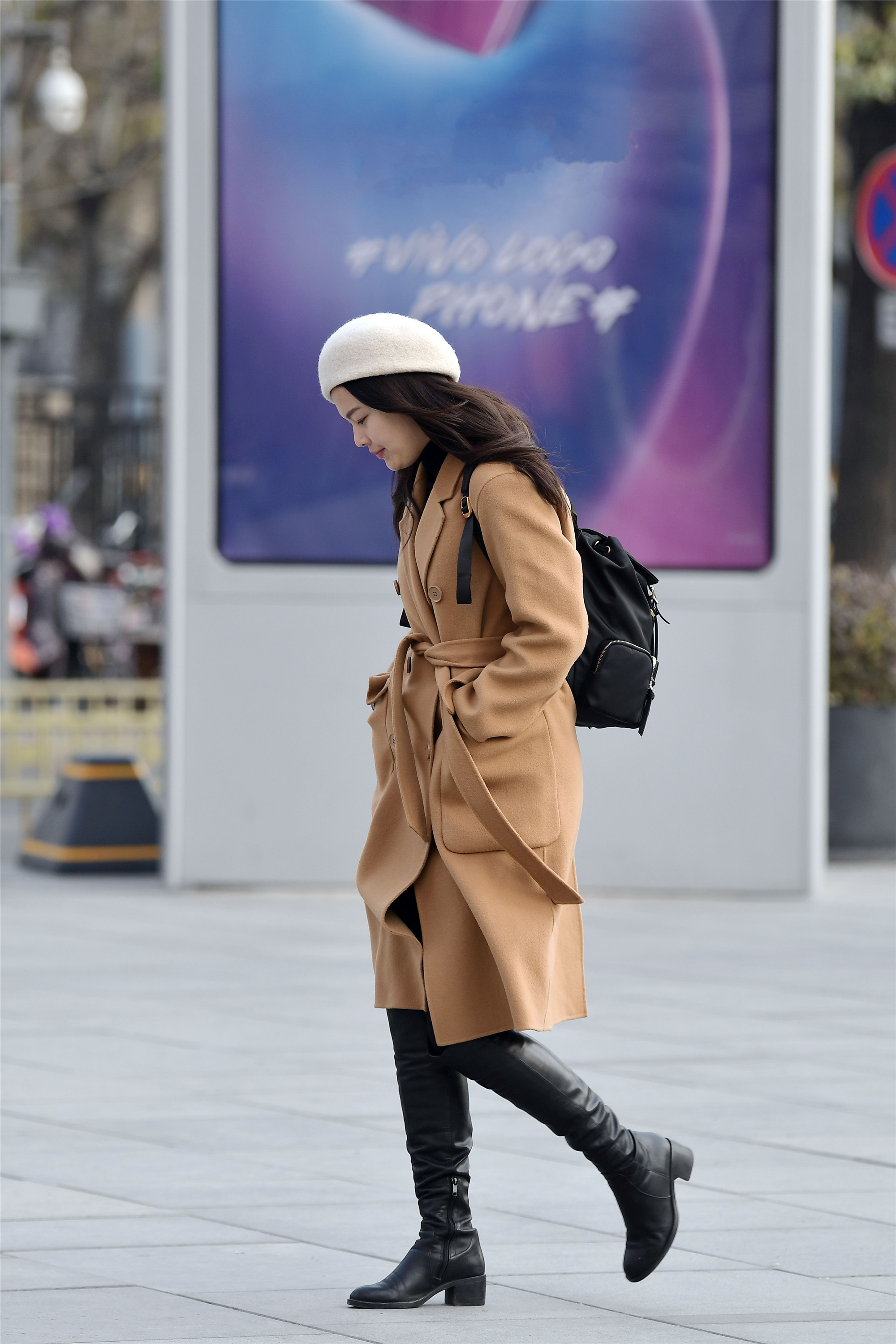 风衣搭配一双黑色过膝靴皮靴,鞋跟不高,粗跟的款式,非常舒适,这款靴子不挑身材,靴筒比较宽,所以可以穿搭着修身棉裤也是很好的,适合大多数姑娘穿搭,而且几乎平底的款式,对于那些不喜欢穿高跟鞋的女生都可以轻松驾驭。