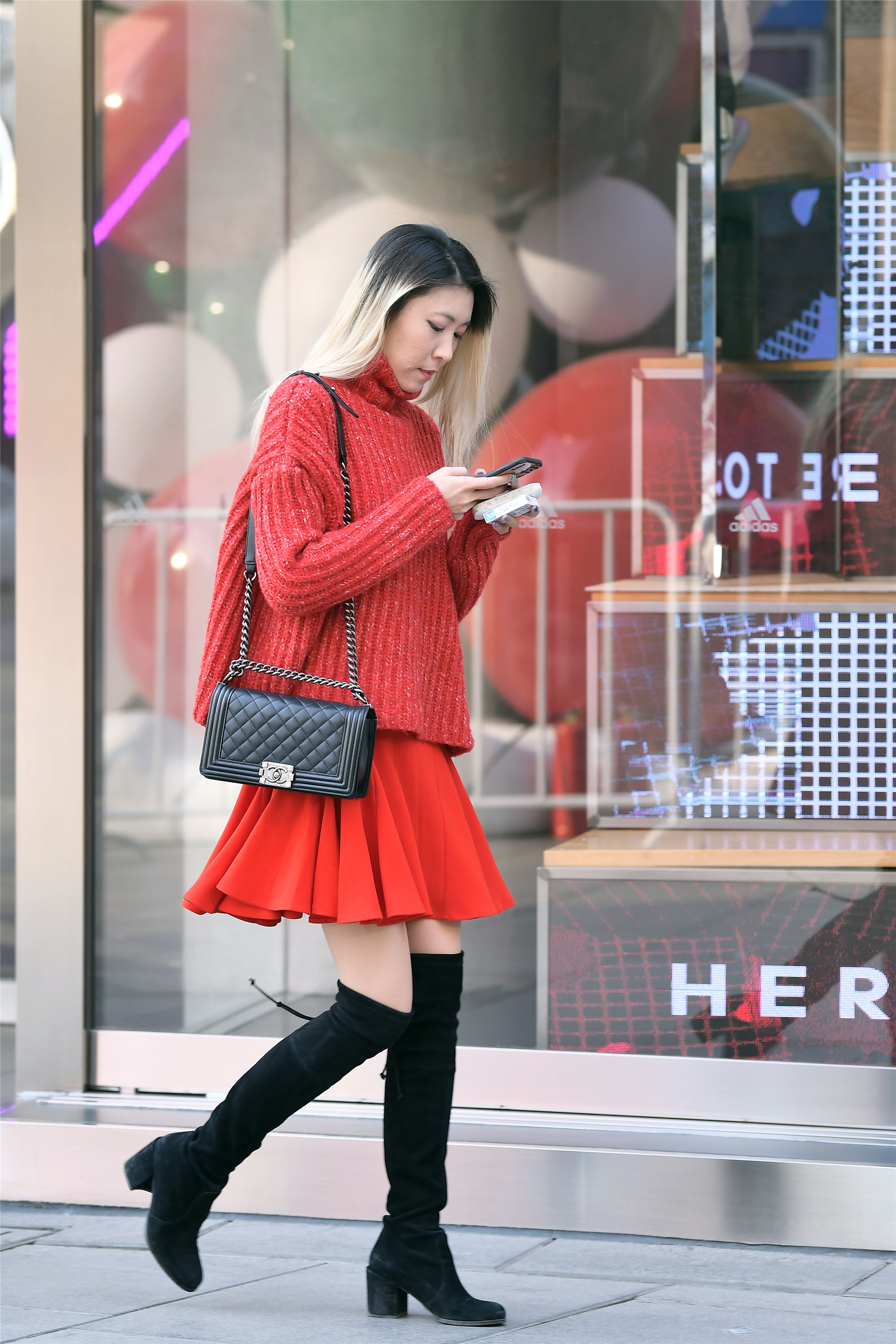 小姐姐穿着红色针织毛衣搭配一条红色A字裙,非常时尚漂亮,而且裙褶也增加层次感,搭配一双黑色绒面长靴,红色与黑色搭配的对比非常经典,而且也很闲身材的纤瘦与高挑。