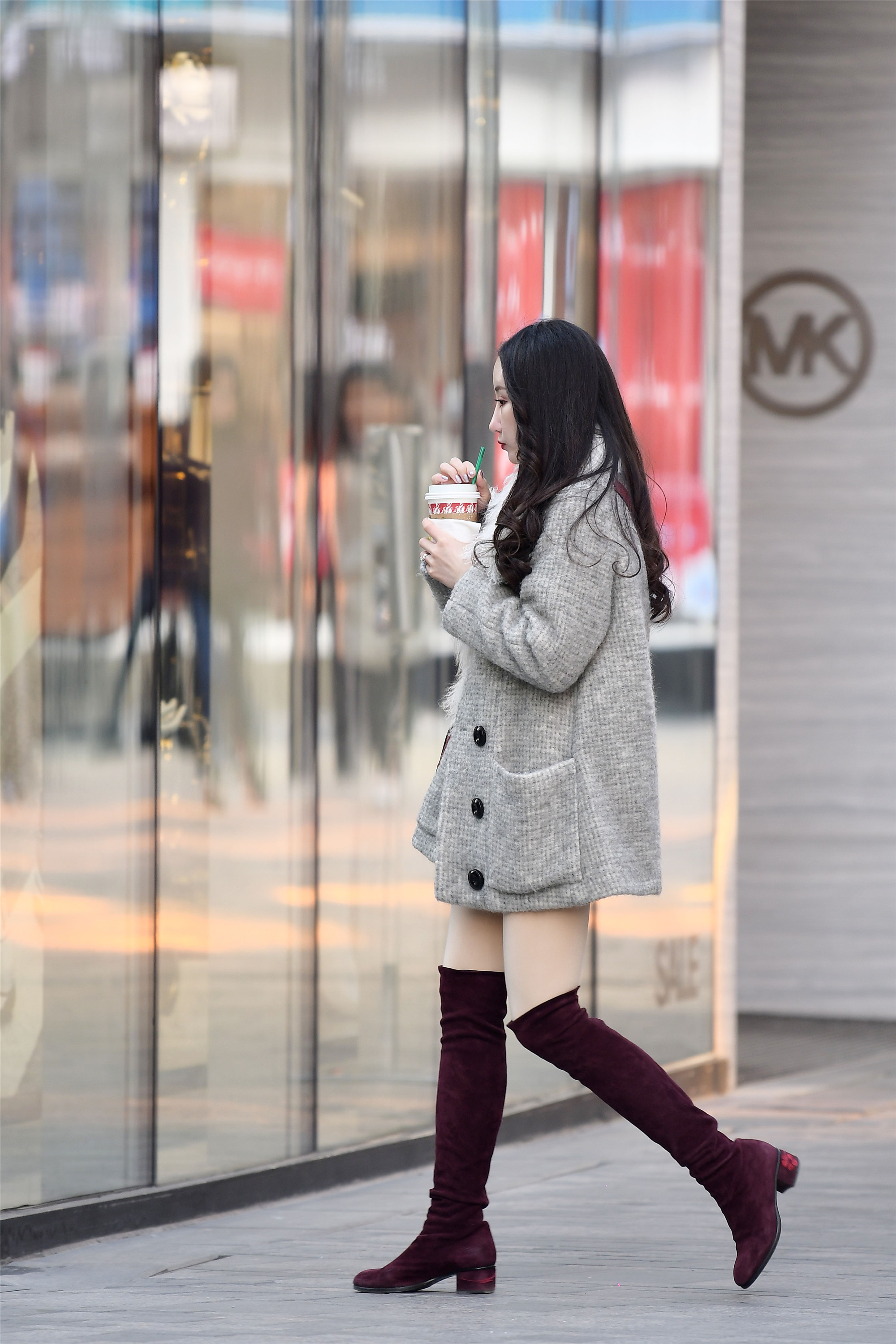 灰色针织半身大衣,搭配一双紫色绒面长靴,小姐姐身材非常匀称,所以这双靴子被衬托的非常漂亮,看着也非常养眼,简单的一身搭配,却需要好身材来衬托,所以选择这款靴子的姑娘要看一下自己身材,在决定是不是选择这款靴子。