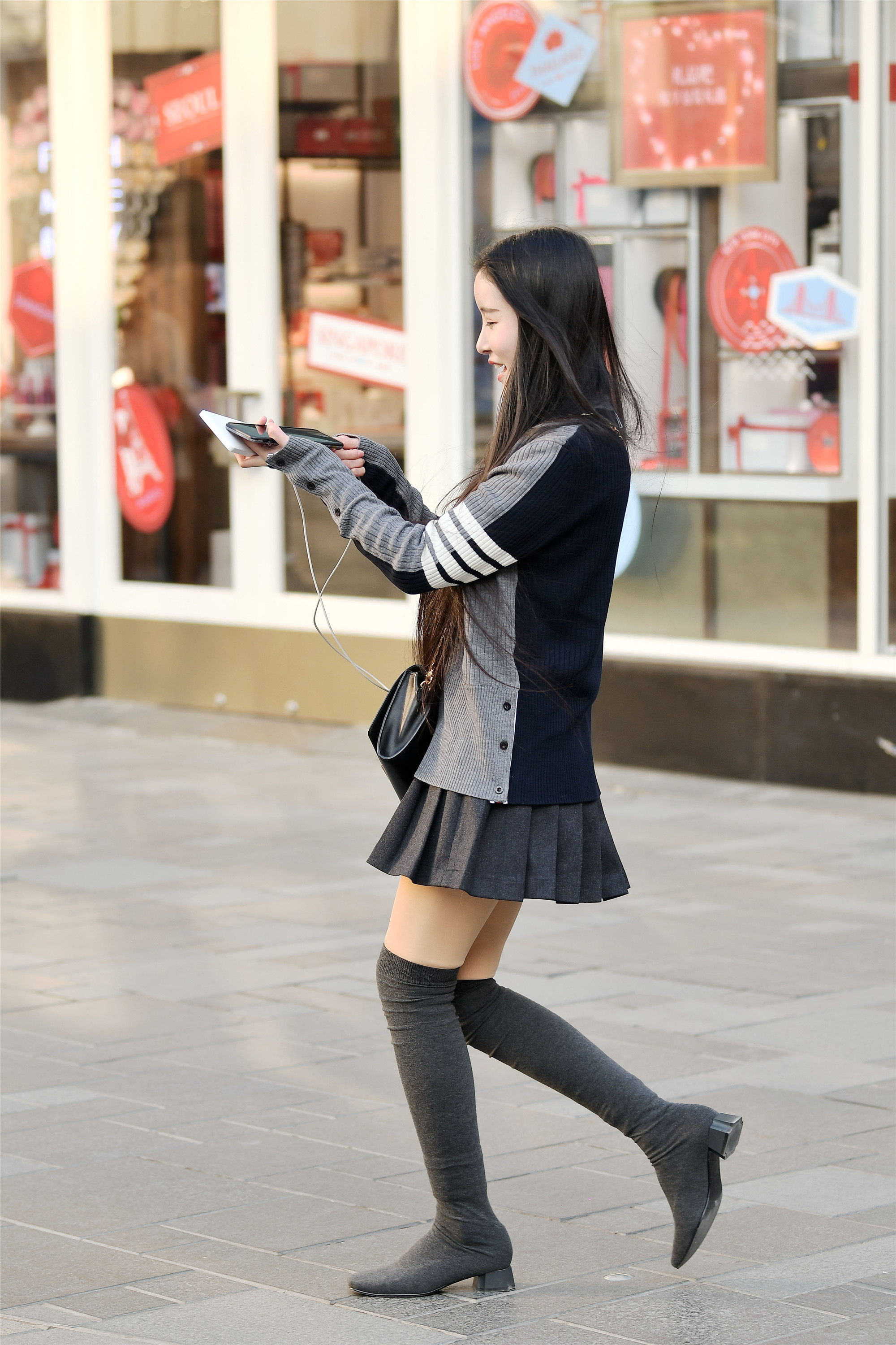 这款长靴是今年特别流行的袜靴,简单却很修身,弹力效果很不错,却很挑身材,需要那些小腿纤细修长的姑娘穿搭才漂亮,姑娘一身长袖针织衫搭配一件百褶裙,虽然没有秀腰线,但是依旧感觉感觉她身材纤瘦。