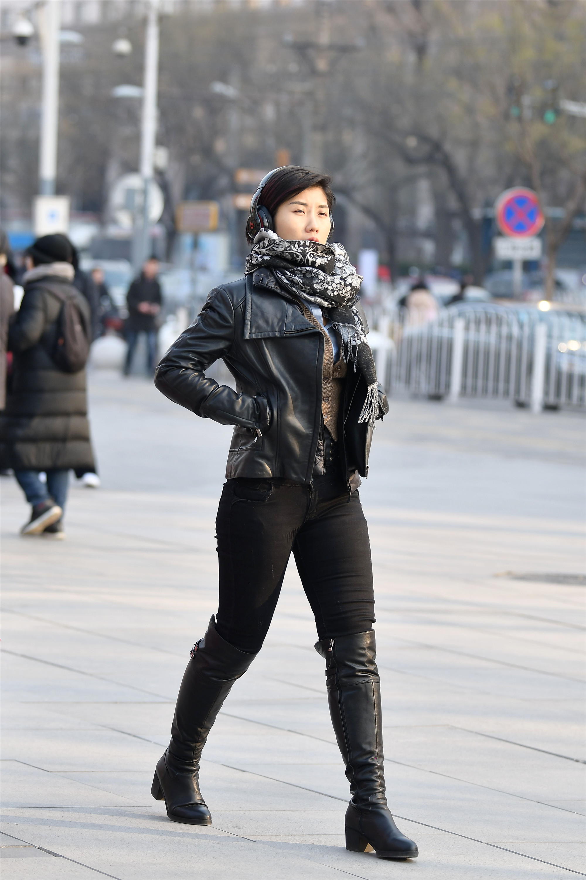 这位姐姐身材看着就像是锻炼过一样,腿部的肌肉粗壮却很匀称,属于那种很耐看的,她选择一双皮靴带着一点点跟,稍微比平底鞋高那么一点,却又不是很挑身材,适合很多姑娘选择,黑色修身牛仔裤搭配着黑色皮夹克,感觉有点酷酷的。
