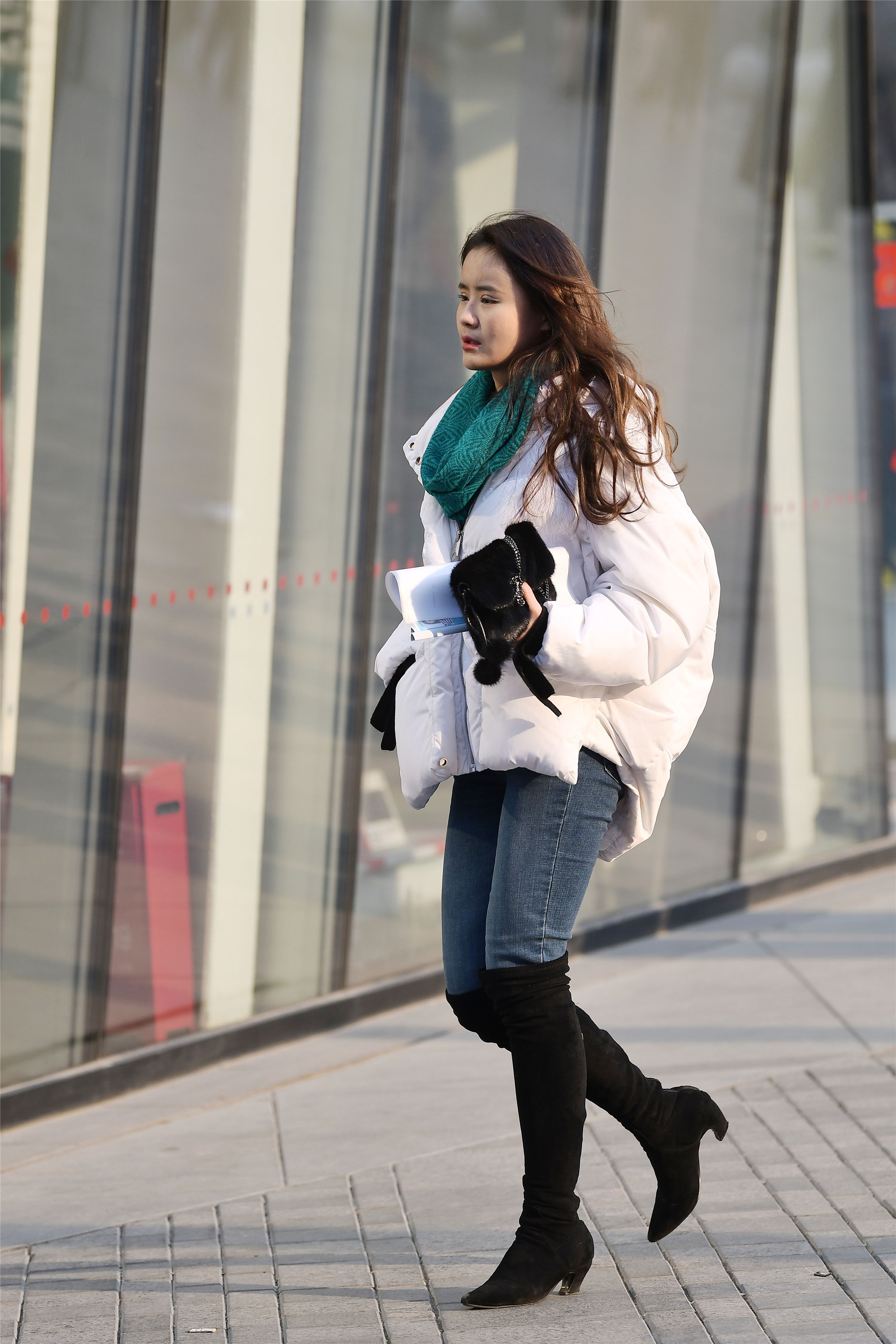 深蓝色修身牛仔裤搭配一双黑色绒面长靴,靴子鞋跟是异性的,带着一个小小的弧度,这样显得鞋跟更低一些,更好突出腿部线条修长的感觉,宽松的白色羽绒服更有个性,还非常保暖,冬天就要这样穿搭。