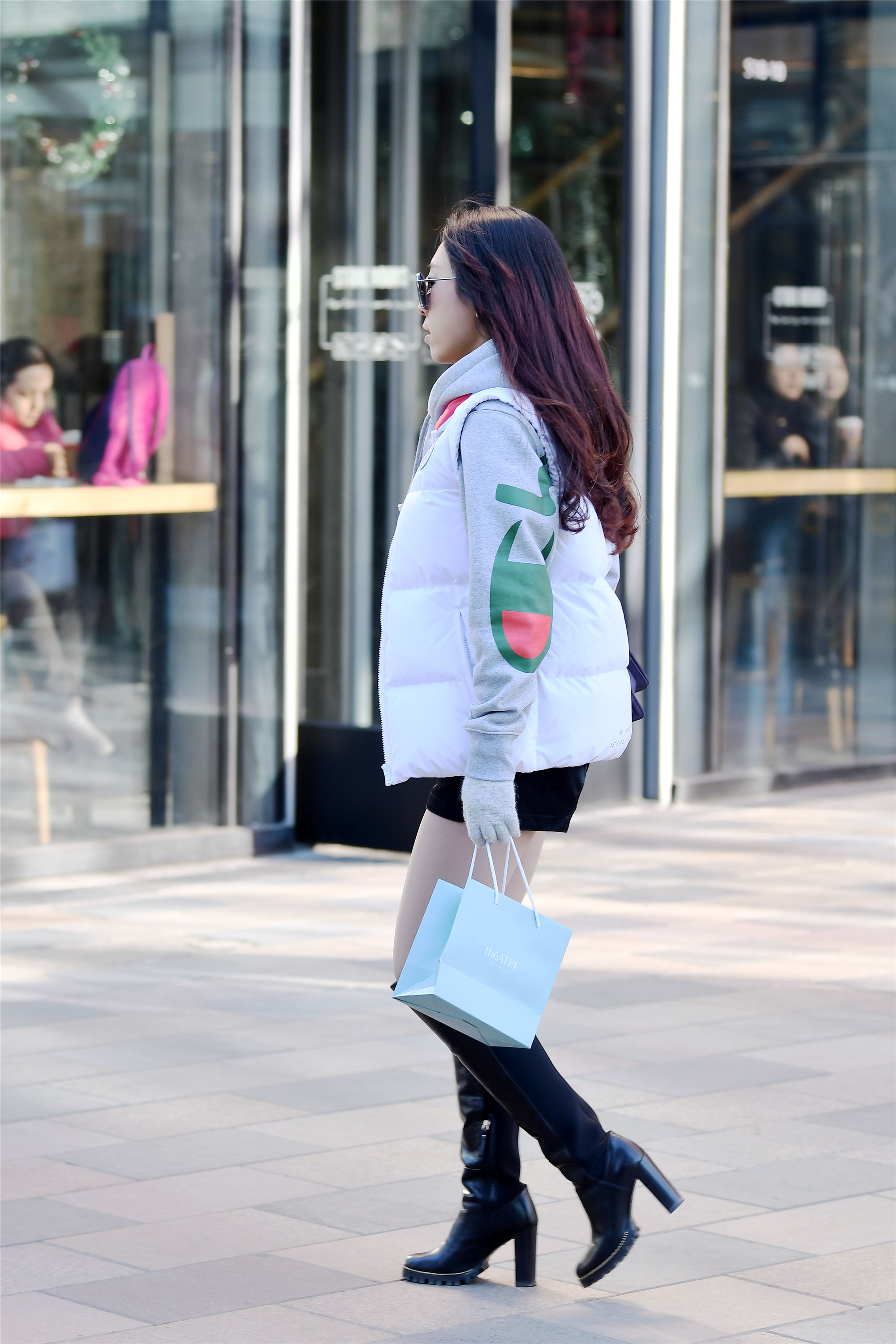 高跟鞋对于现在的时尚女士来说,是不可或缺的日常穿搭单品,即使到了冬季,她们依旧要穿着高跟鞋出来,这位小姐姐选择的高跟鞋是长靴款式的,粗跟让走路更平稳,厚底会起到很好的保暖作用,搭配着短裤羽绒服出来,保暖又好看。