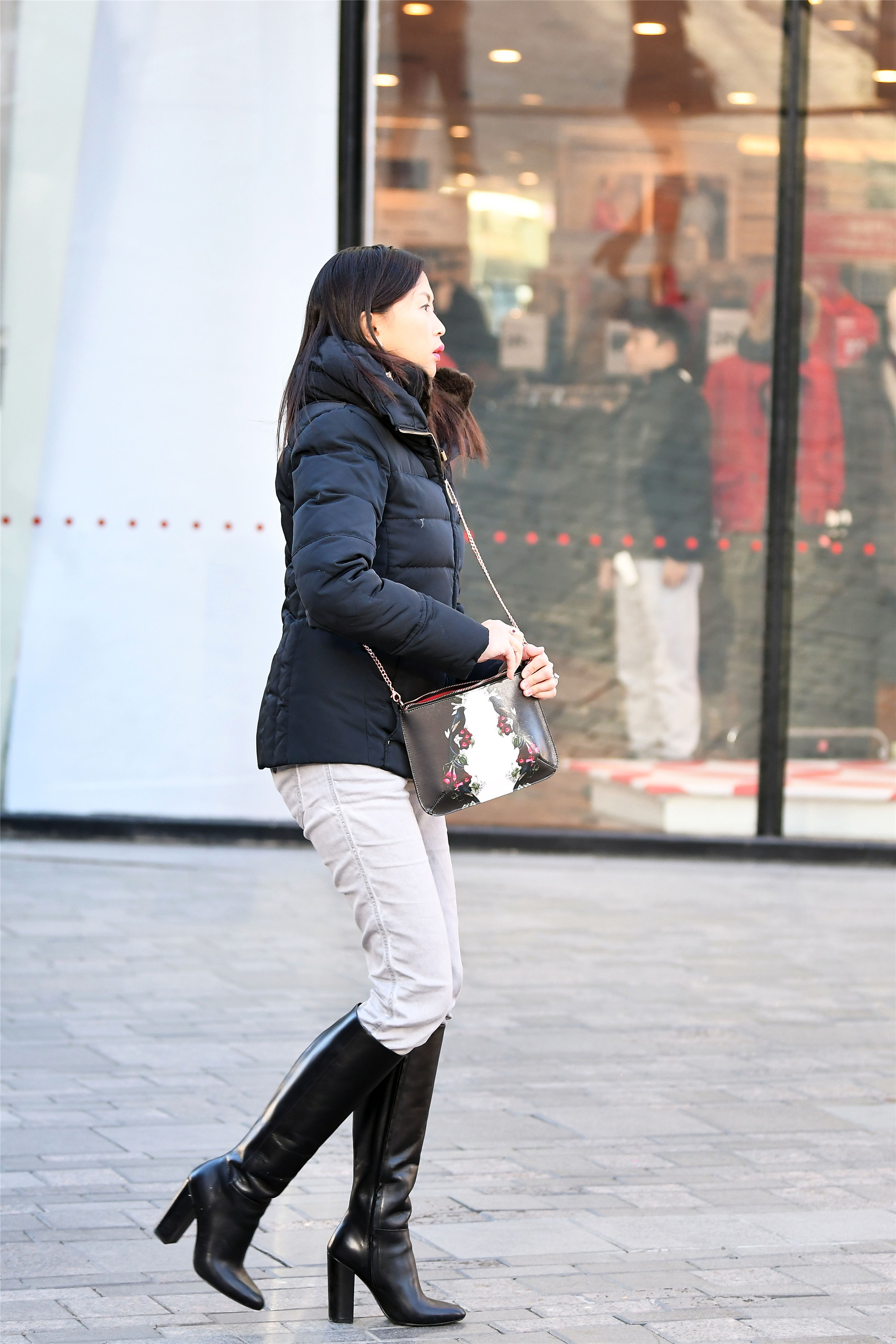 这一身搭配,算是中规中矩,如果羽绒服在小一点款式,蓬松起来,效果会更好,高跟的长筒靴,虽然是粗跟,但是靴面非常光亮,搭配着有点马裤款式的修身长裤,这样显得个性十足,就是这款黑色羽绒服选的大了一点点,要不然显身材,还很有个性。