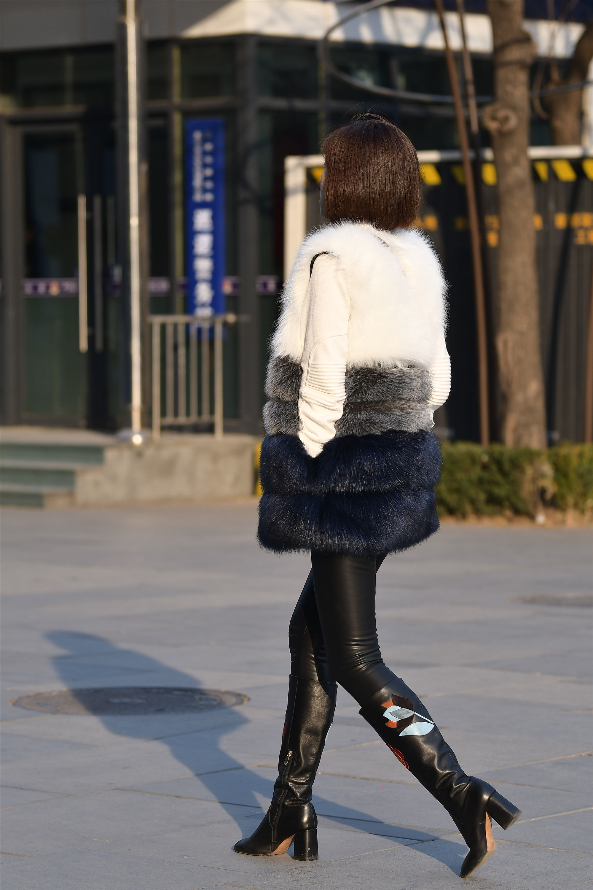 高跟鞋选择粗跟的,走路会很稳,对于很多人都喜欢,高筒靴又带着很好的保暖效果,在初冬时节很多人喜欢穿搭,黑色高筒靴百搭效果很好,一条修身皮裤搭配着渐变色皮草,白色灰色和深蓝色过度一下,整体色彩变化非常自然。