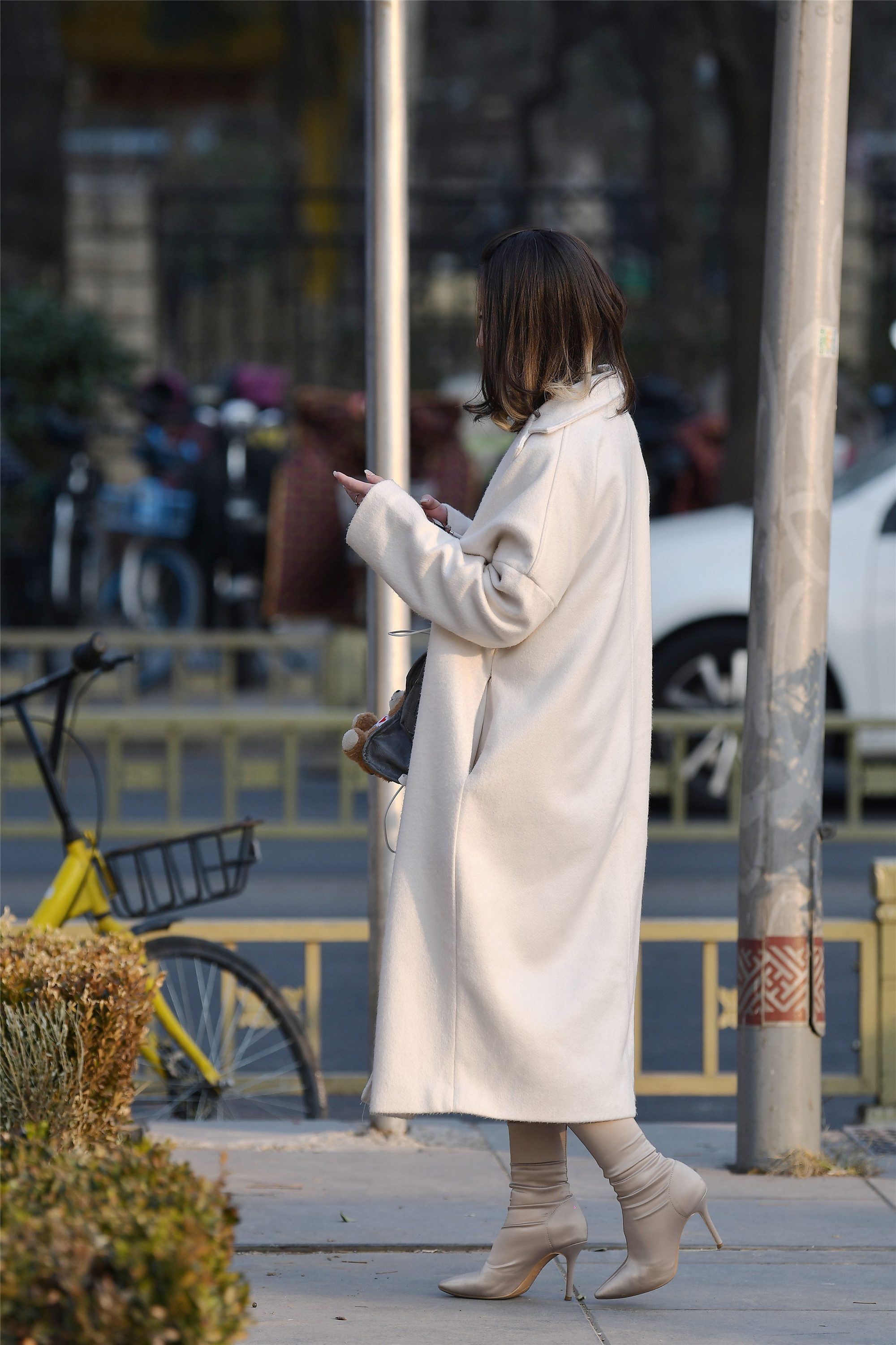 米白色长款大衣,恰好能够露出她脚下的尖头细跟袜靴,相近的色彩,看起来更加简约个性,而且这样的搭配很简单,不挑身材,因为脚下一双尖头细跟鞋,反而会很显纤瘦的感觉。