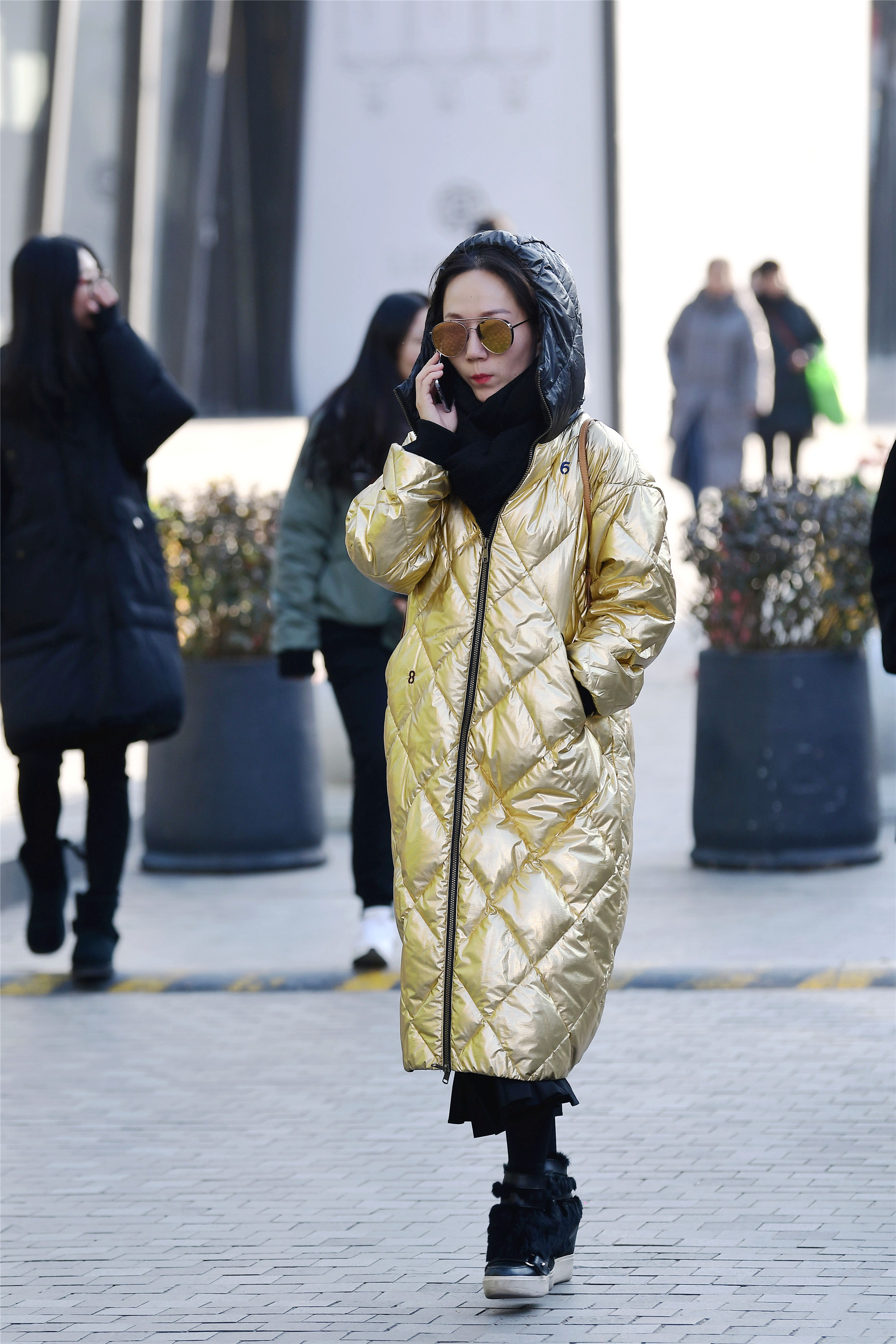 金色长款羽绒服,简单宽松的款式,不需要多余的配饰,也不需要高挑的身材,简单的穿搭出门就很精彩,其实冬天的搭配也可以很时尚舒适。
