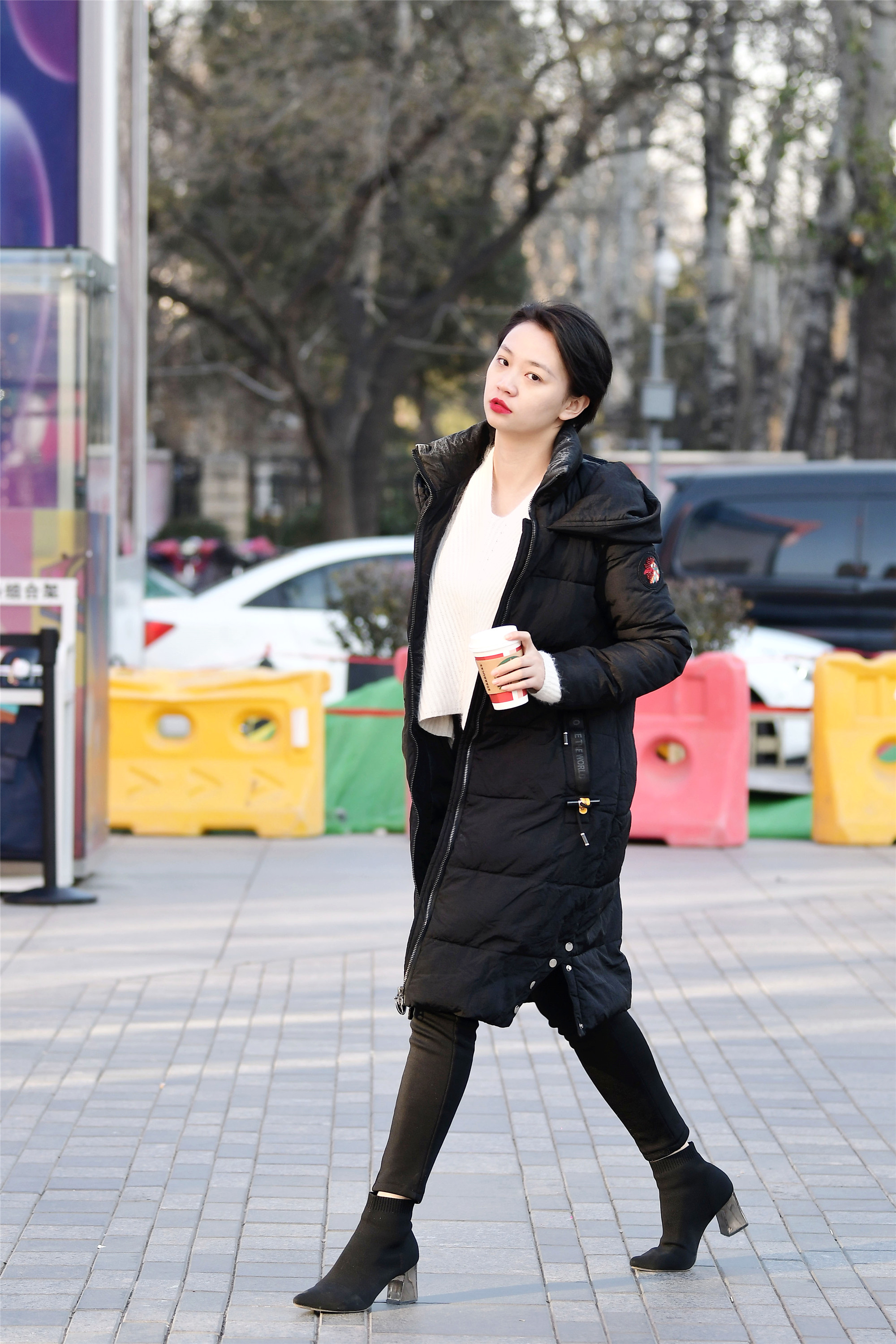 黑色中长款的羽绒服,一件白色针织衫来衬托一下,显得人很清秀,而且她留着一头短发,更显精神,修身打底裤搭配一双黑色短靴,穿搭也是非常简单的。