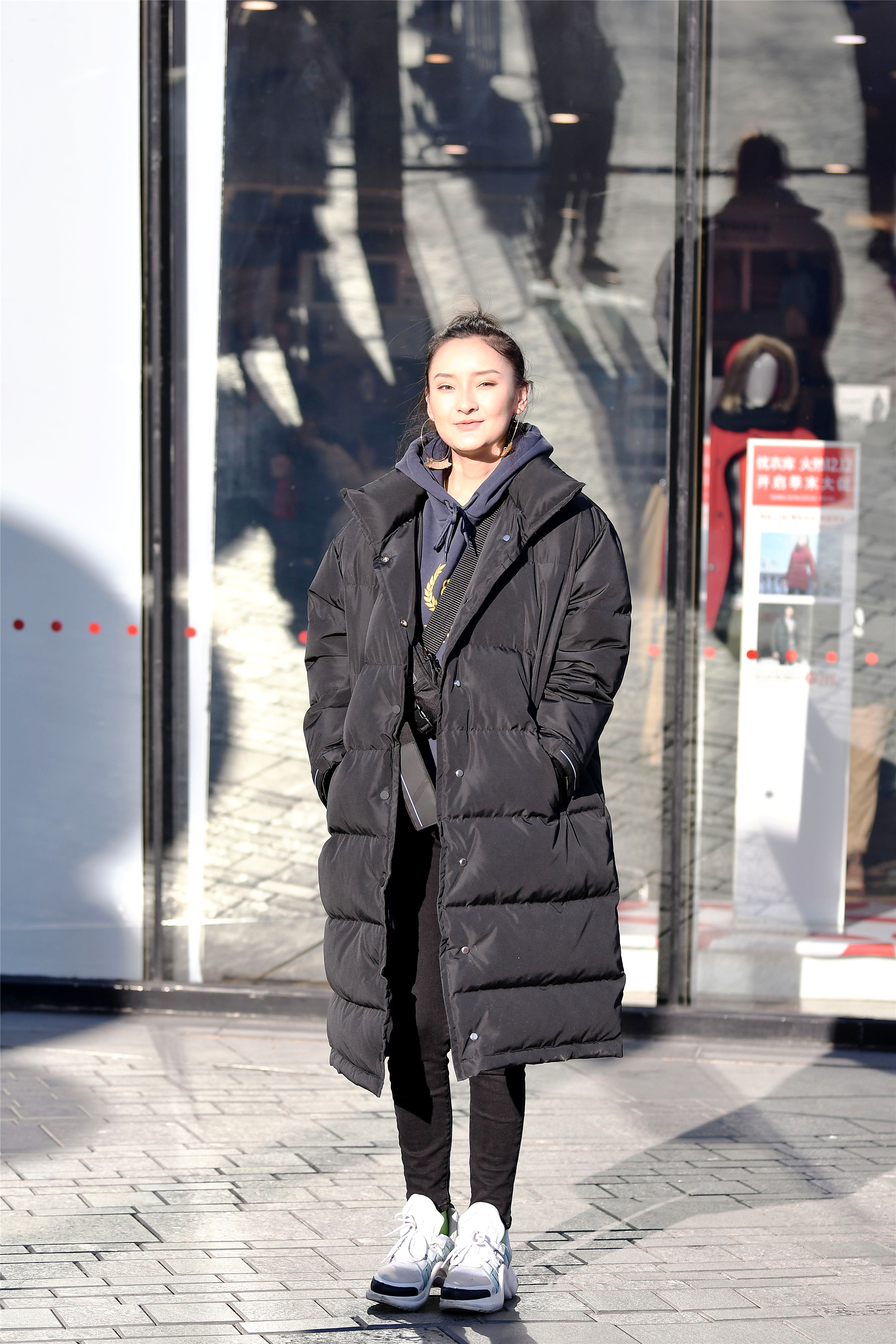 小姐姐穿着长款羽绒服更喜欢搭配一件卫衣,似乎这样更显休闲一些,当然也要配一双休闲的运动鞋才好,冬季的搭配就是要注意保暖。