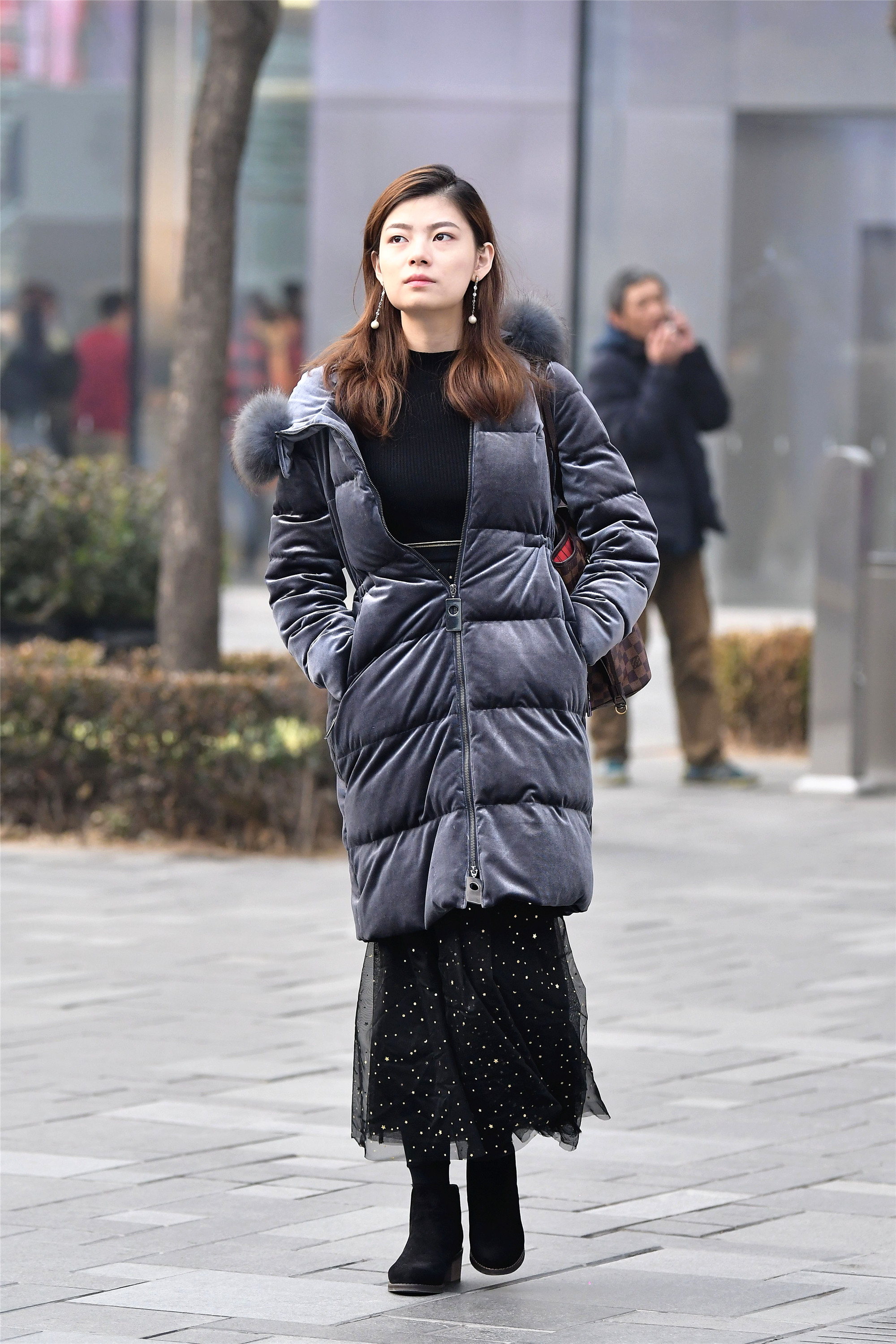 绒面的中长款羽绒服,深色系的款式,搭配着裙子出门,其实冬天穿裙子出来,怎么看都会觉得有些冷,还是有很多时尚姑娘喜欢穿着裙子出来,她们对于裙子非常喜爱,而长款的羽绒服又有着百搭的效果。