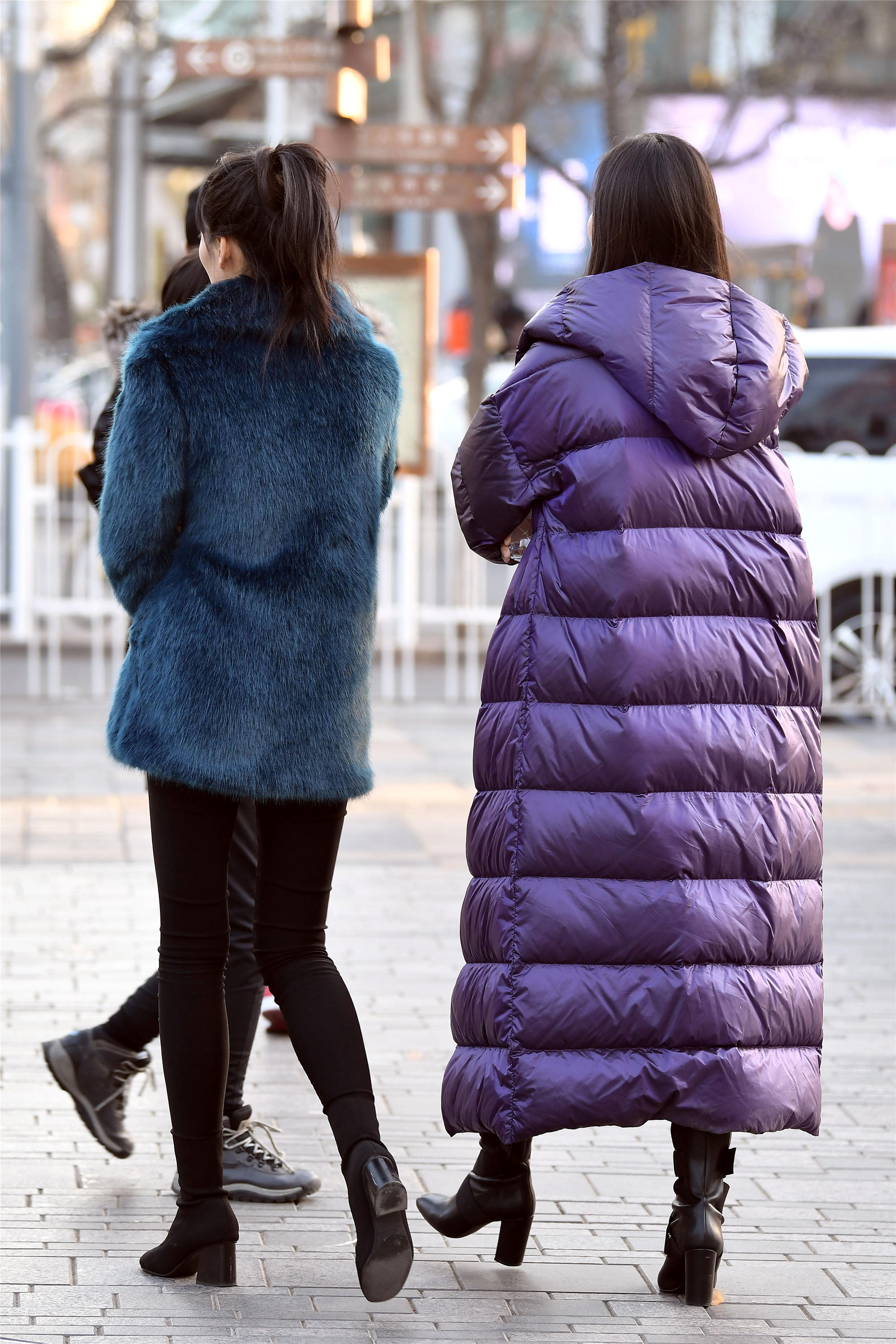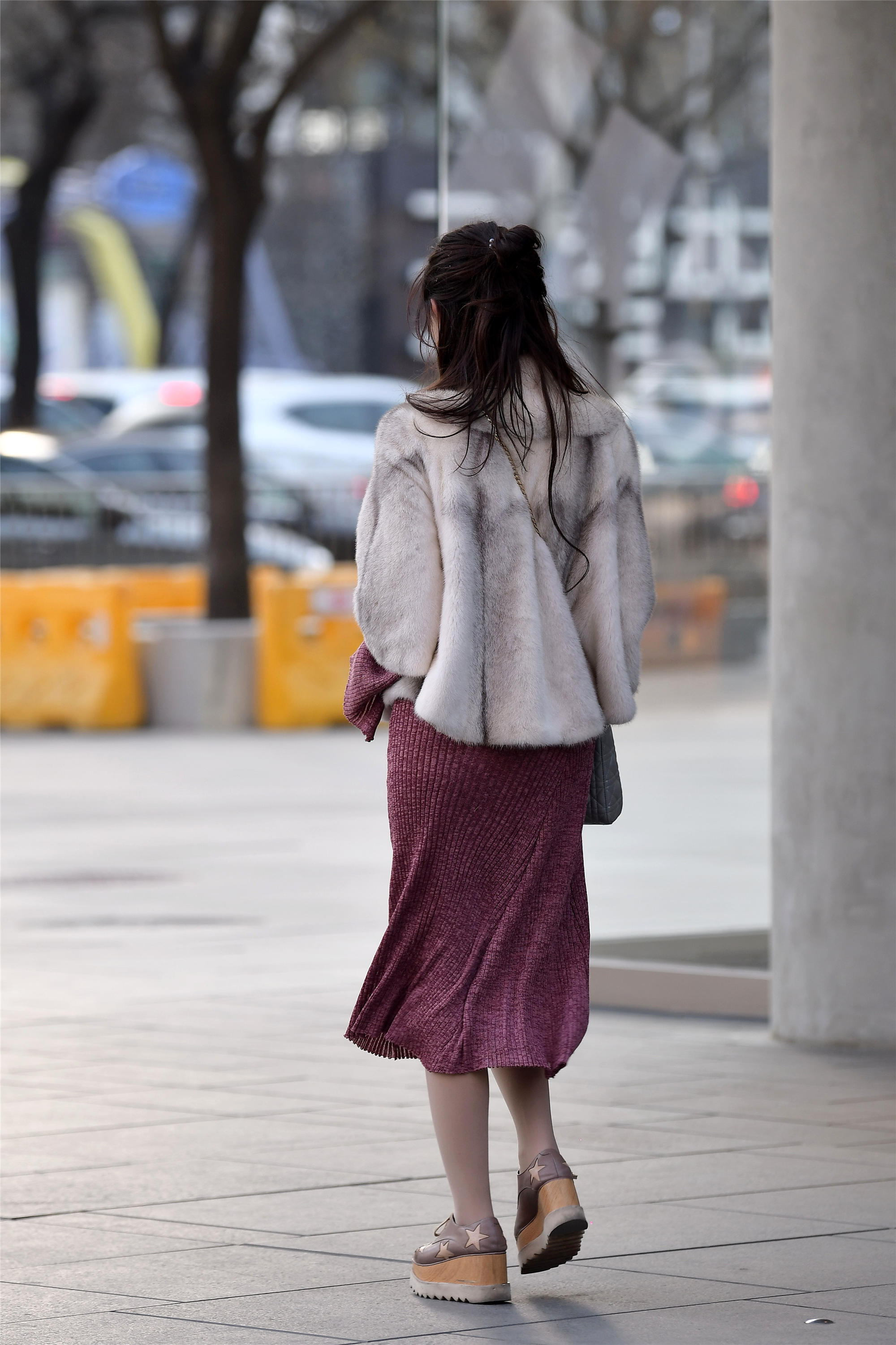 小姐姐这一身搭配非常精彩,特别是在阳光下,她的服装质感特别的漂亮,一双银色的尖头粗跟鞋,金属银色特别抢眼,搭配高腰皮裤,这样非常显身材比例,而且她身材非常匀称高挑,搭配短款长袖的皮草,黑白交替的袖口增加层次感,留下一个优雅的背影。