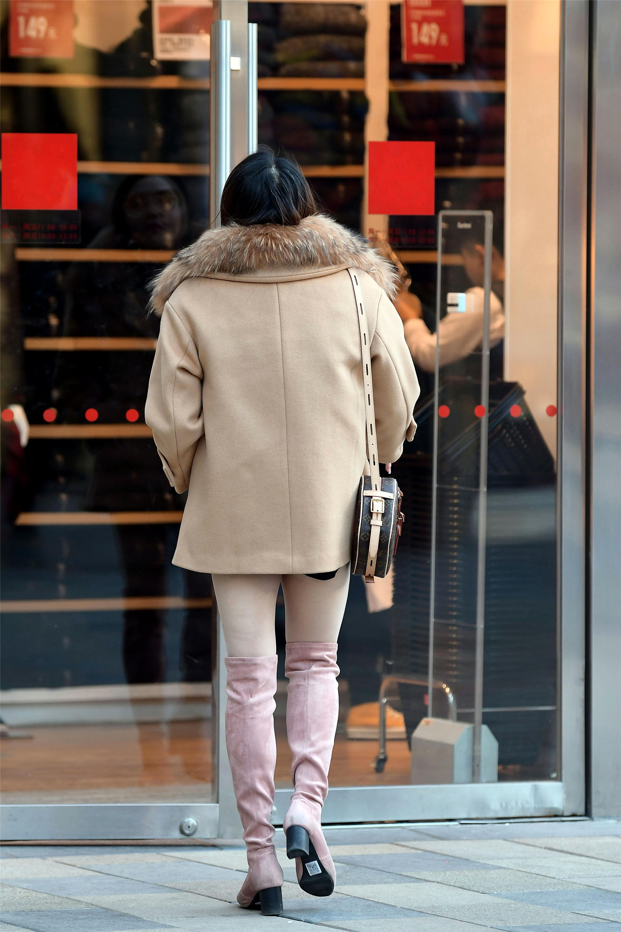 能够给你留下一个优雅背影的姑娘,她们的身材都是没得挑的,之所以想着她们能转过身来看一下,就是想知道身材这么好的顾念,到底是美成了什么样子,这位姐姐的米色中短款的大衣,不怎么显身材,冬天的上衣搭配就是这样,但是她的浅粉色过膝靴,却很好的展示了她修长的身材,一下子增加了她身材的修长纤细效果。