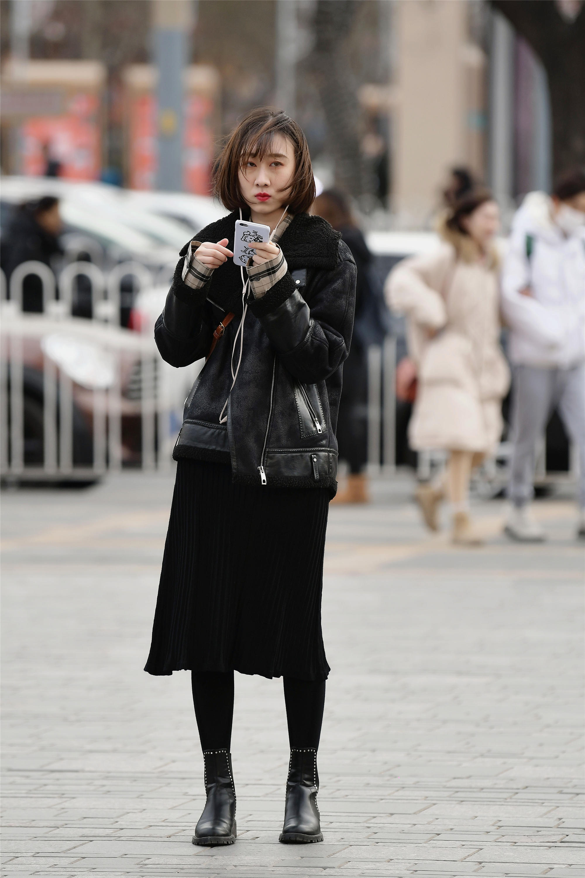 当然也有人喜欢裙子,在冬天搭配裙子出行,也是非常时尚的选择,姑娘一身黑色搭配的非常又层次感,皮夹克带着皮质反光和皮短靴相呼应,黑色裙子搭配着黑色修身棉裤,保暖又时尚。