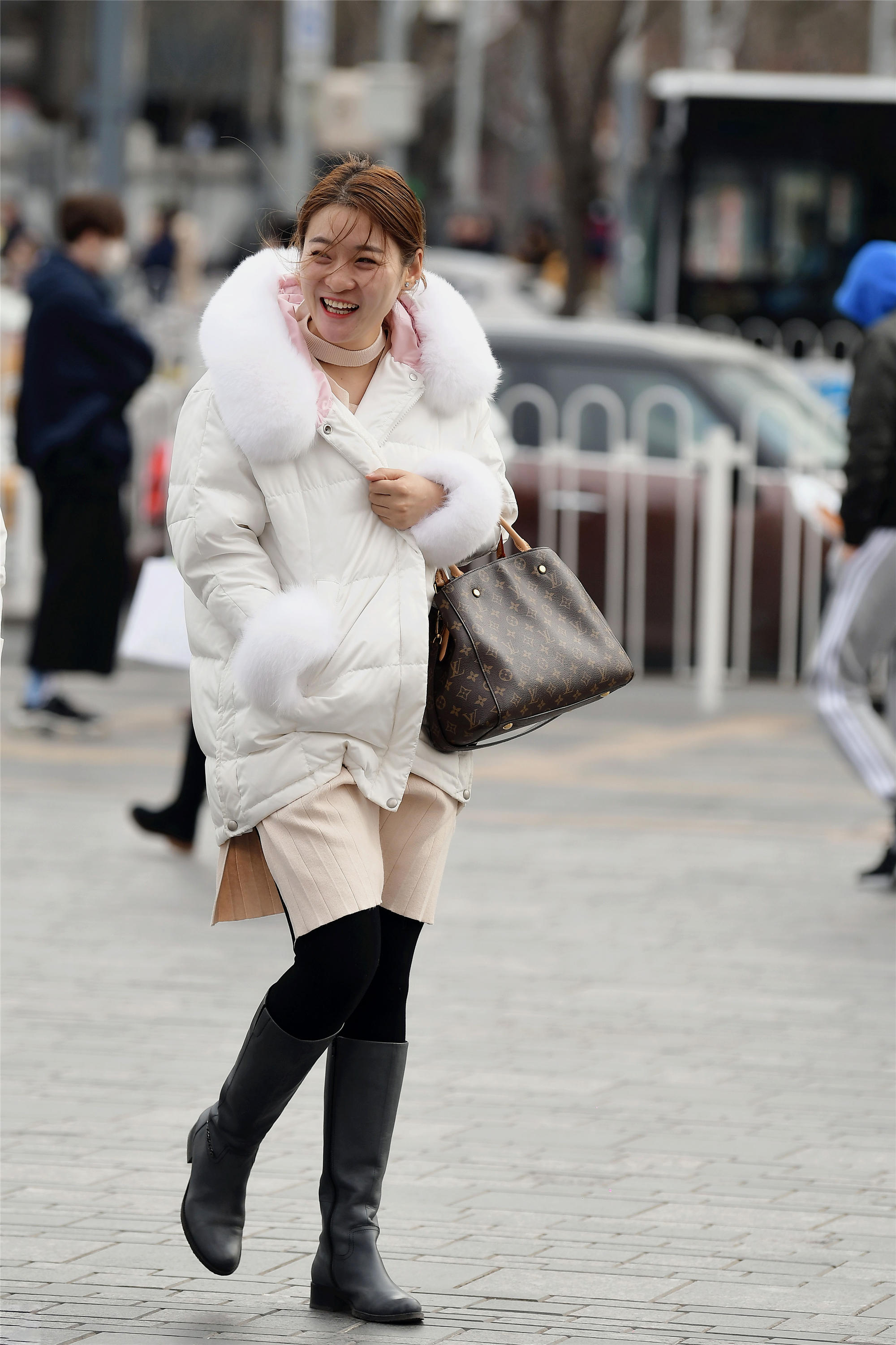 在冬日里,穿搭浅色服装会特别的明显,因为人群中的搭配还是以黑色或者深色系居多,米白色羽绒服,白色的毛边会显得人特别可爱,姑娘一直笑着,会让你更喜欢这个冬天一些,米白色针织裙搭配着黑色高筒靴,保暖时尚,非常值得你借鉴的搭配方式。