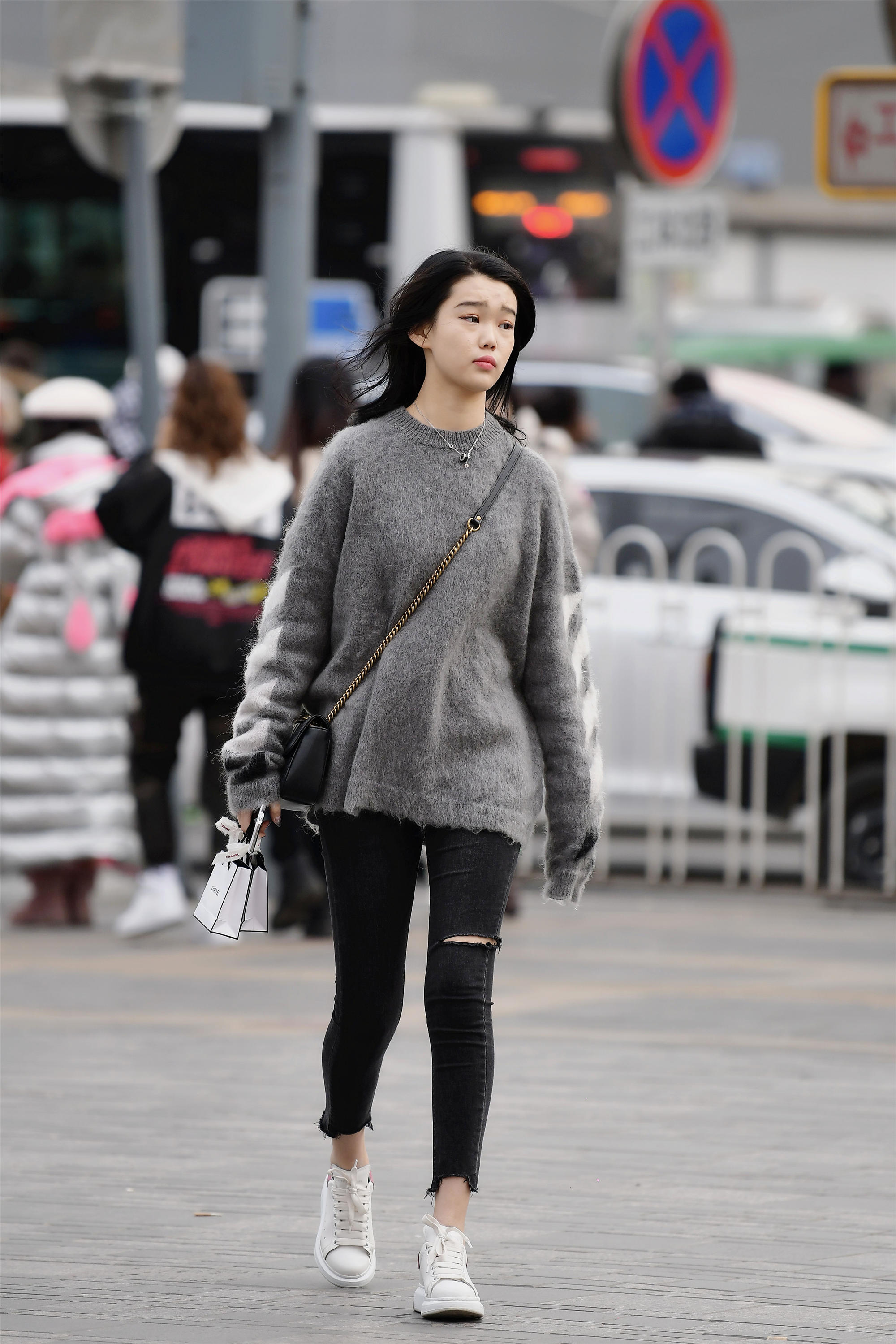 如果你不怕冷,也可以这样搭配,灰色毛衣搭配黑色九分牛仔裤,也可以是破洞的,当然这样搭配都是年轻姑娘才会去选择,更显个性一些,不会在户外时间太长,所以也不会太冷。