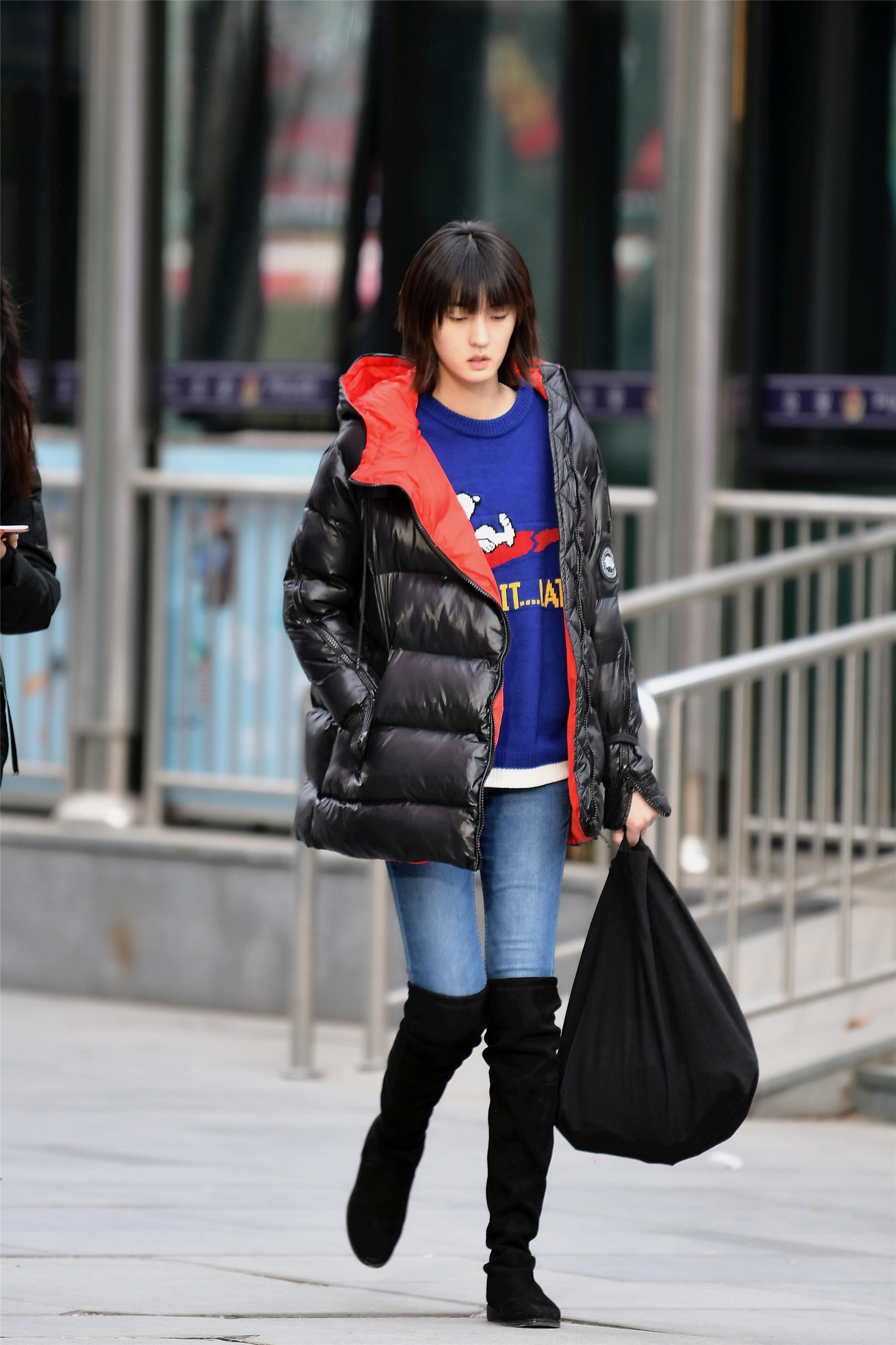 如果能够驾驭色彩,也可以给自己身上增添一些不同的色彩搭配,让这个冬天更富有色彩,黑色羽绒服,衬里是红色的,这应该是双面羽绒服,搭配一件蓝色内衣,色彩对比很好,蓝色牛仔裤和绒面过膝靴靴,显出她的高挑身材。