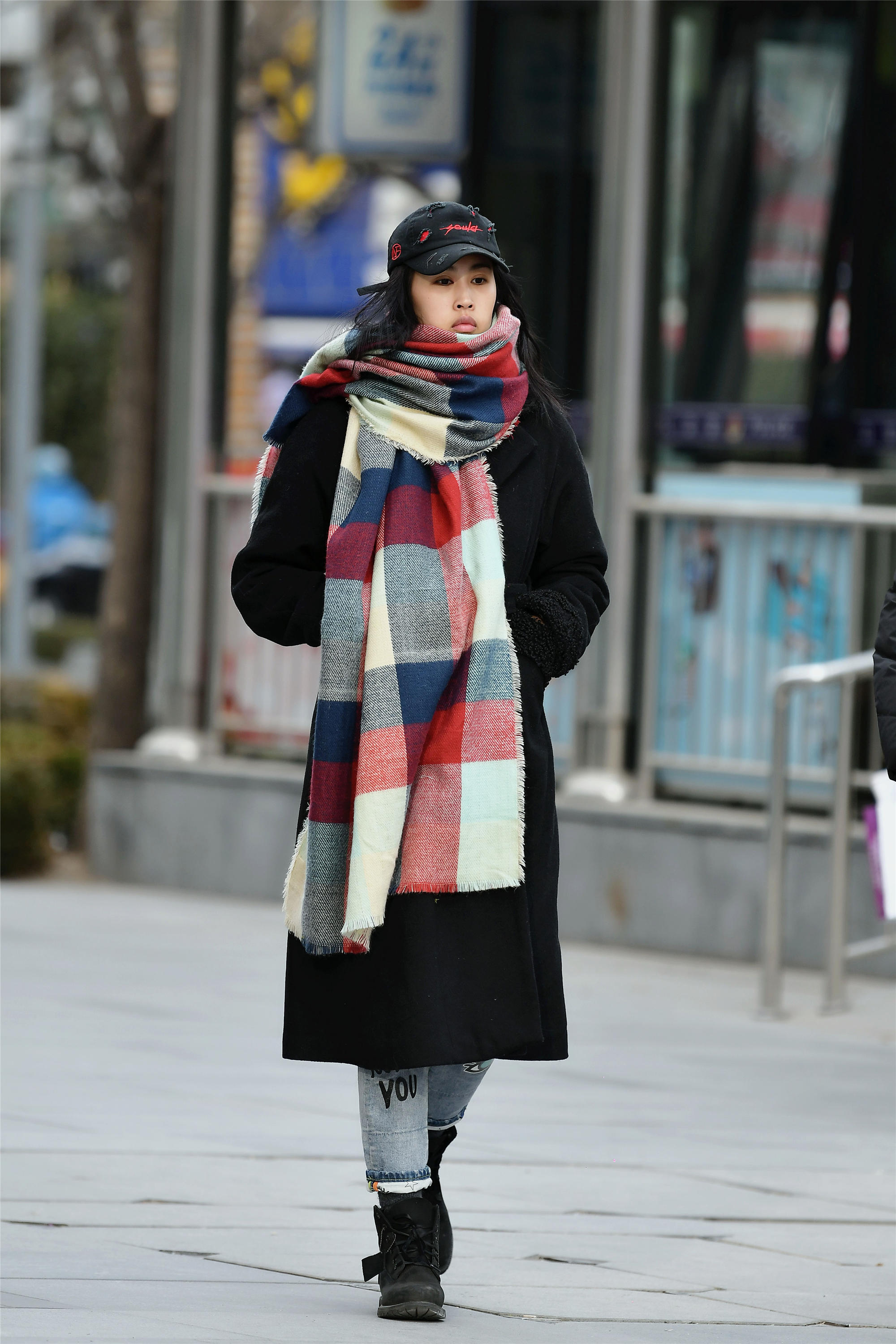 姑娘一身穿搭,却被她的大格子围巾抢了风头,长长的围巾在前面留下很长一段,作为装饰,色彩也很鲜明,让黑色风衣看起来更又层次感,牛仔裤搭配一双黑色磨砂皮短靴,休闲感觉十足。