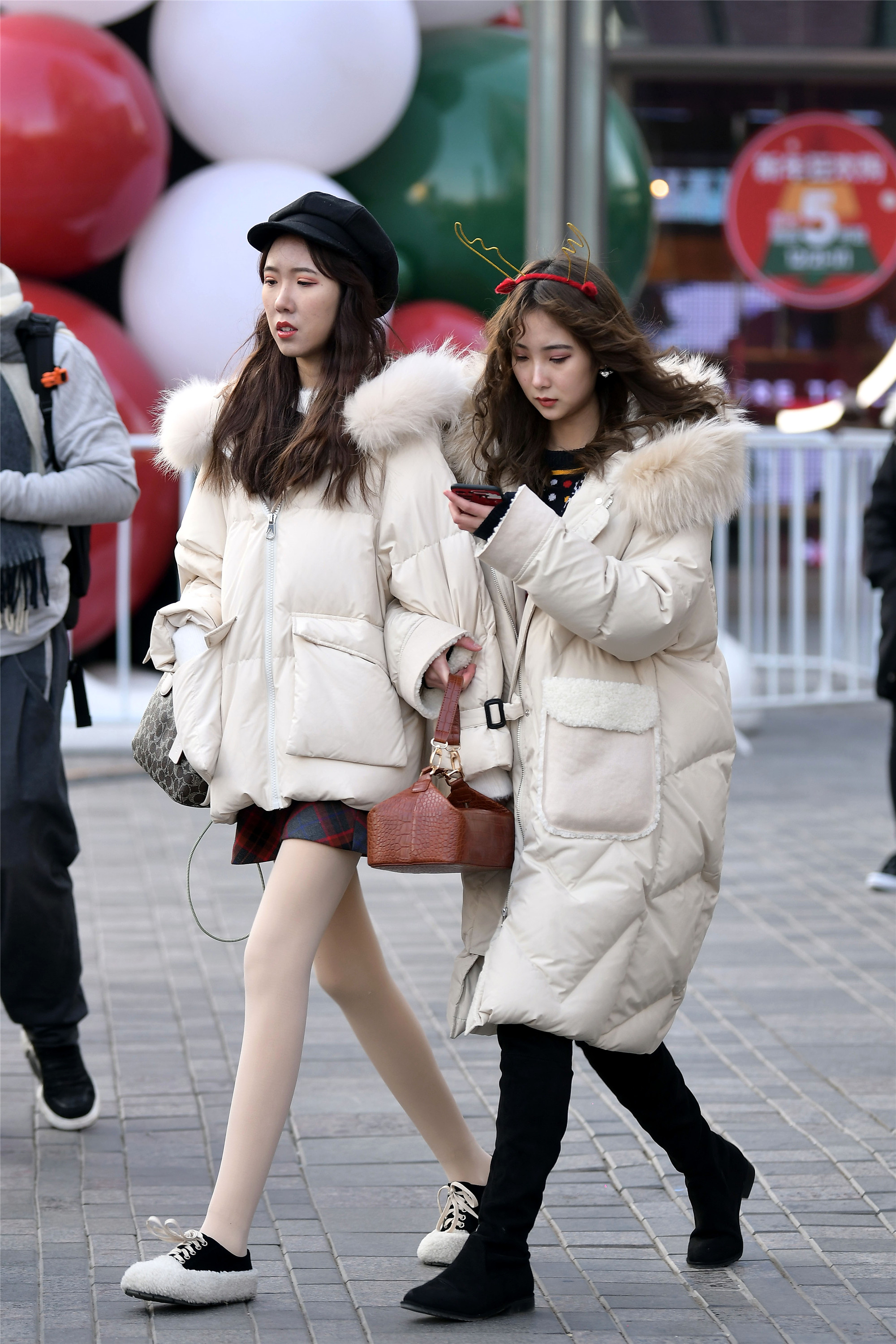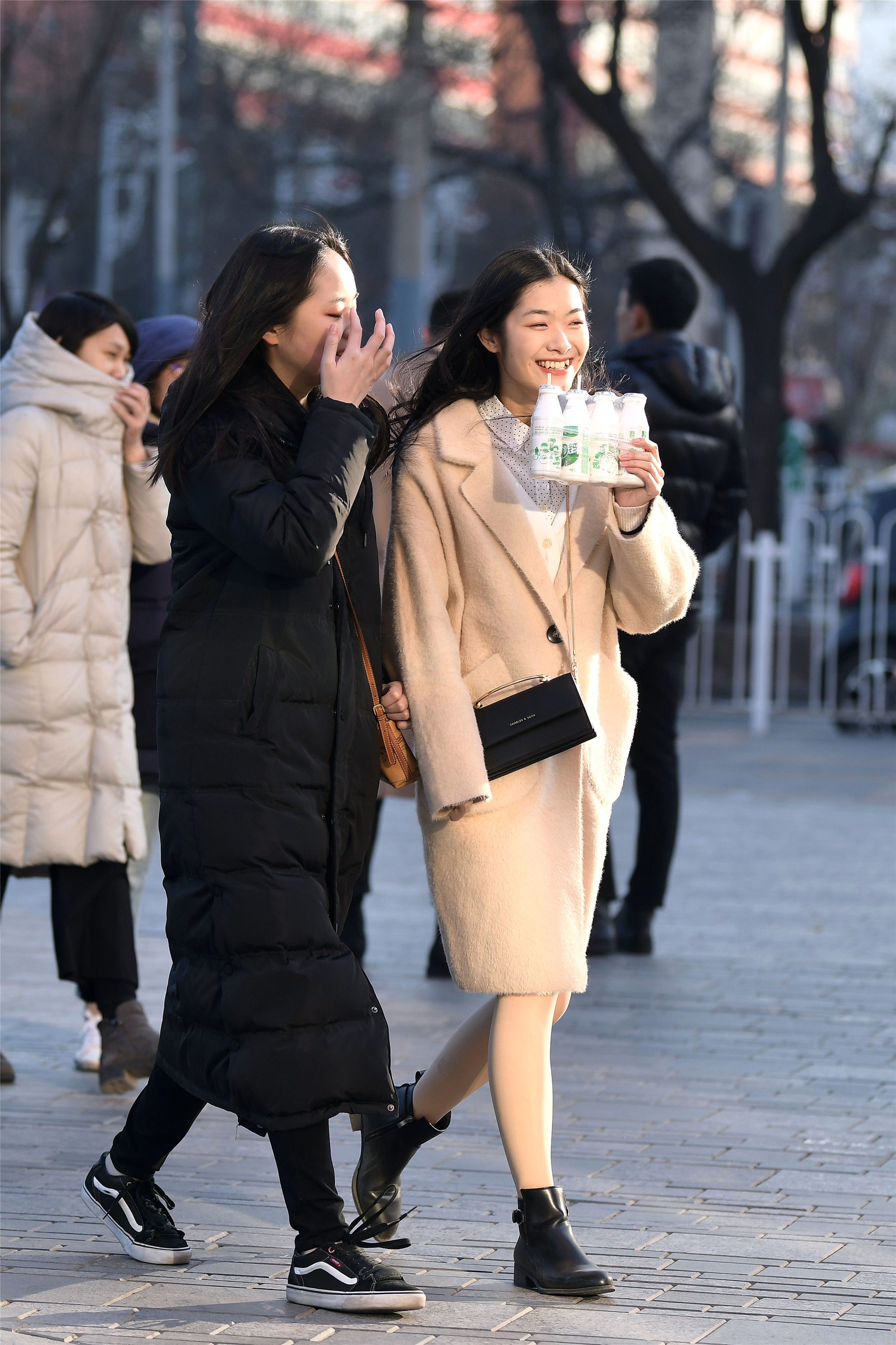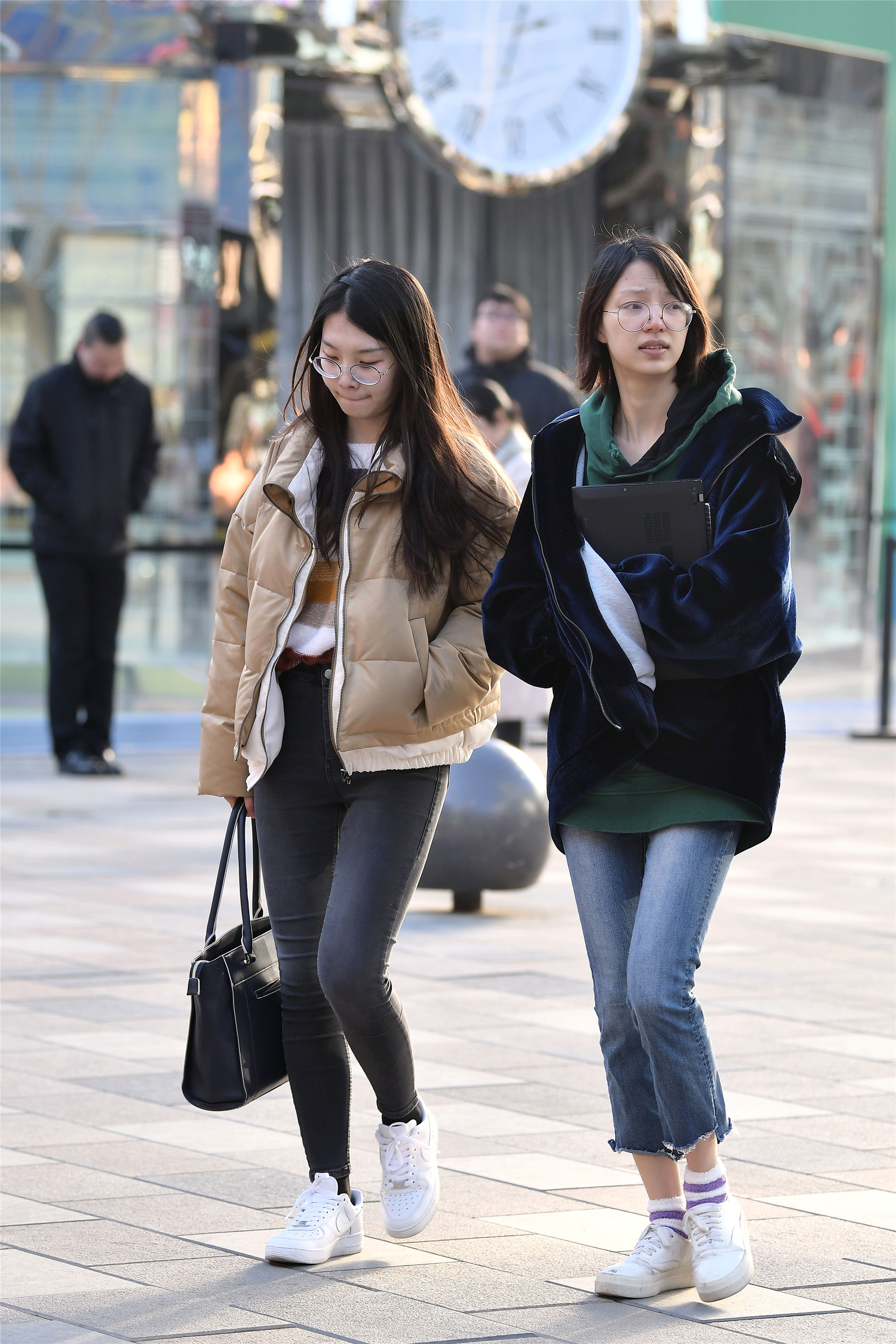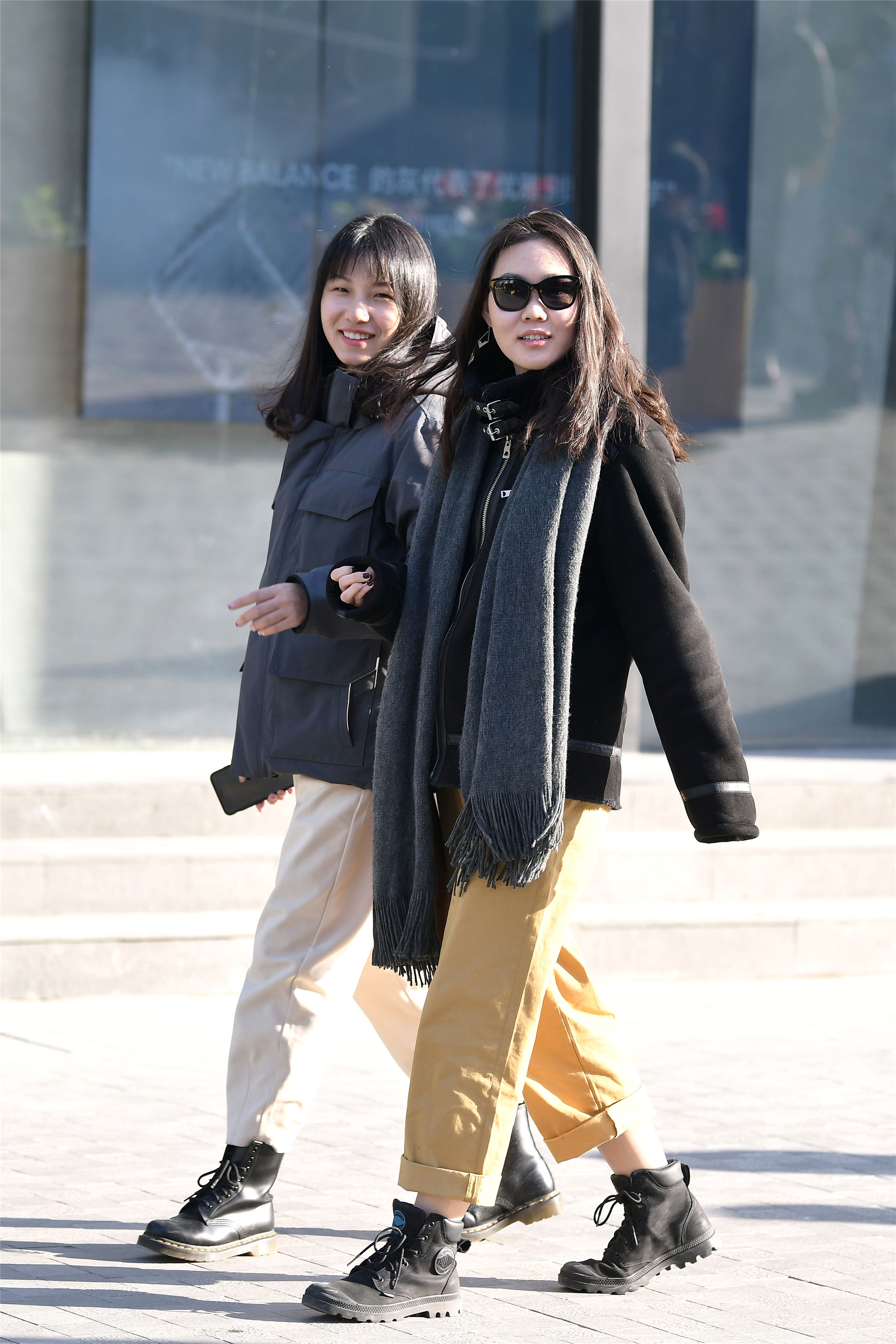 平底鞋也有着不一样的风采,一位是平底踝靴搭配着米色大衣,一位是平底板鞋搭配黑色羽绒服,长款的服装让她们的搭配更轻松自然,她们身材高度也很相似,看她们逛街也是很开心的样子。