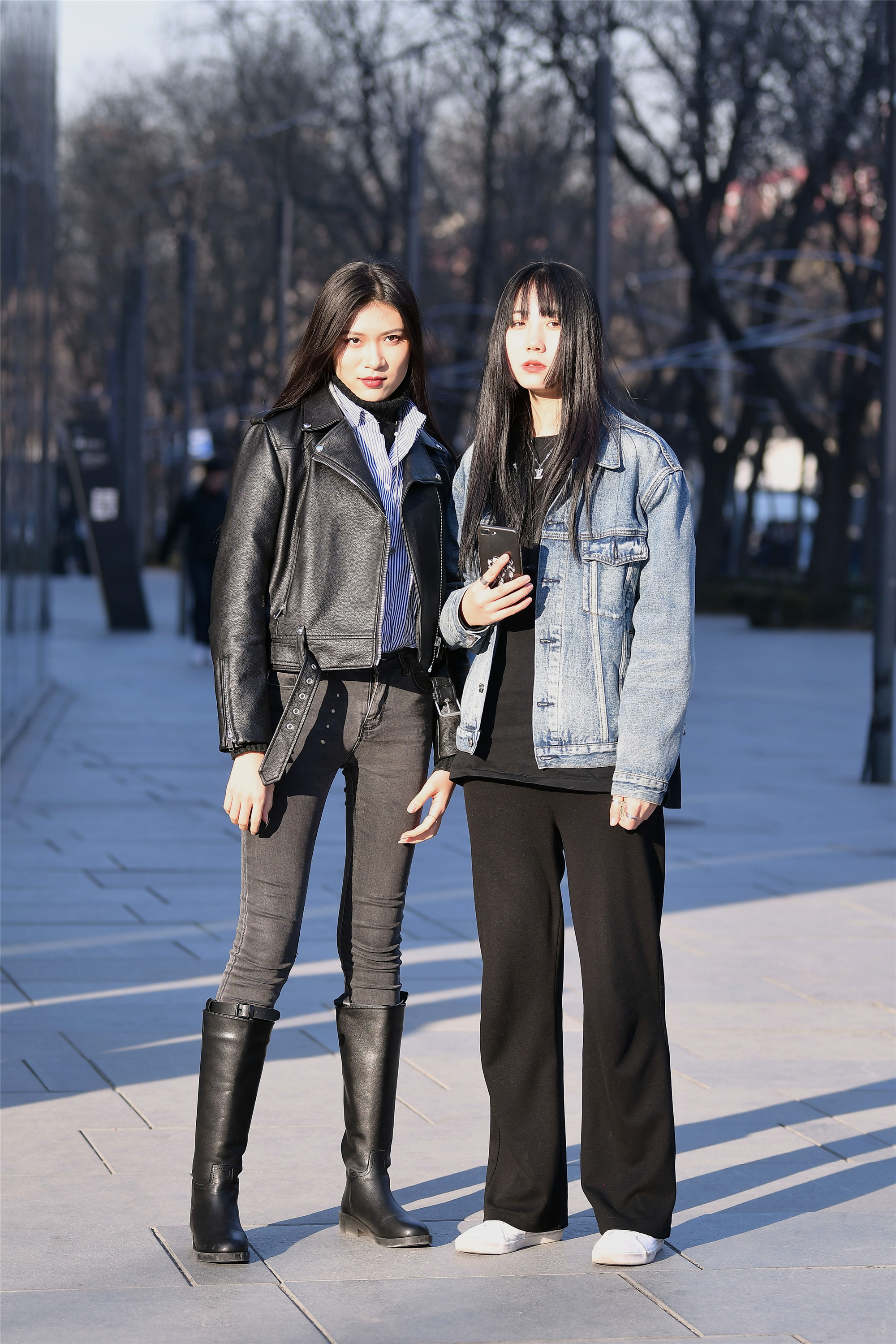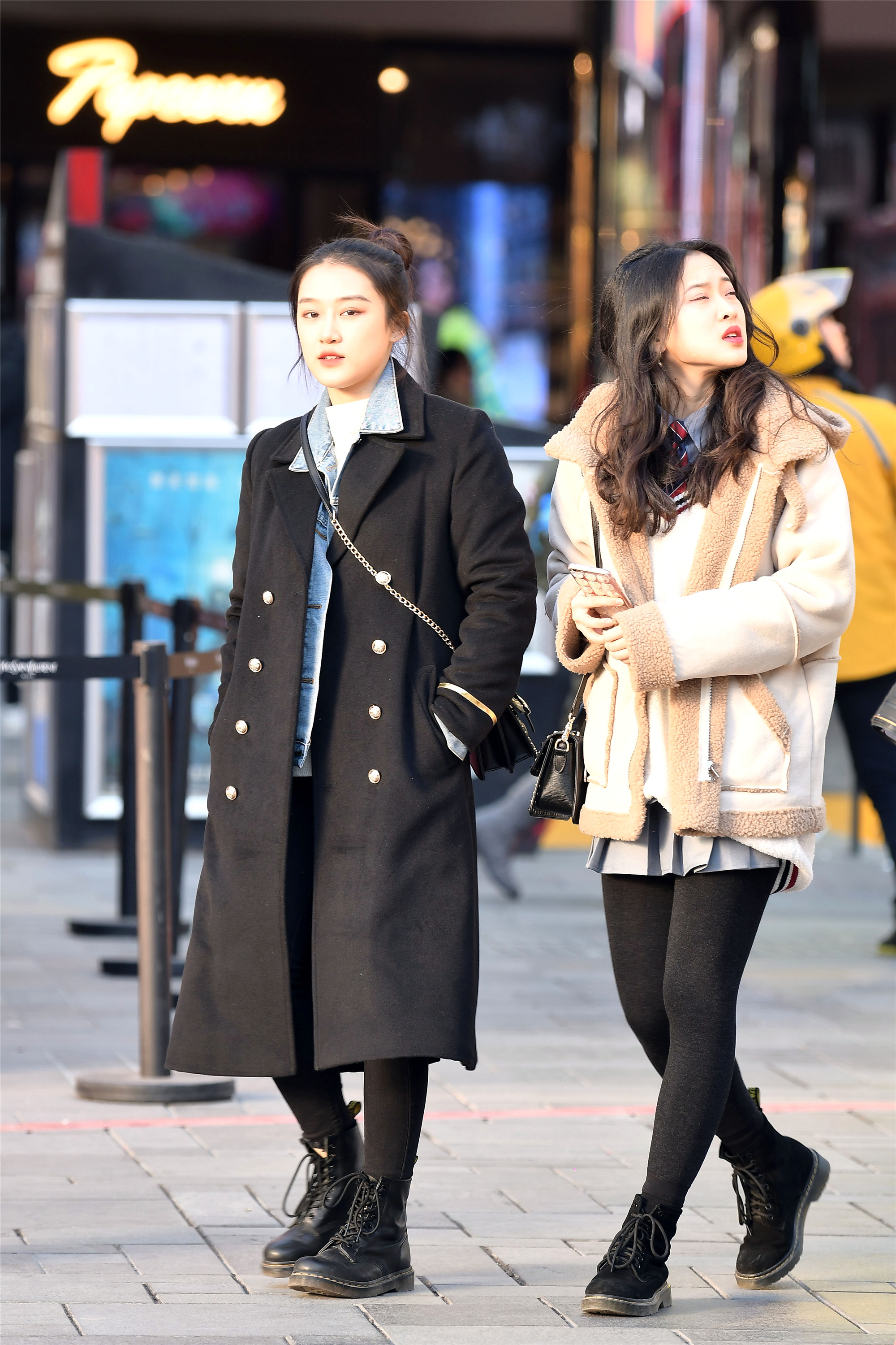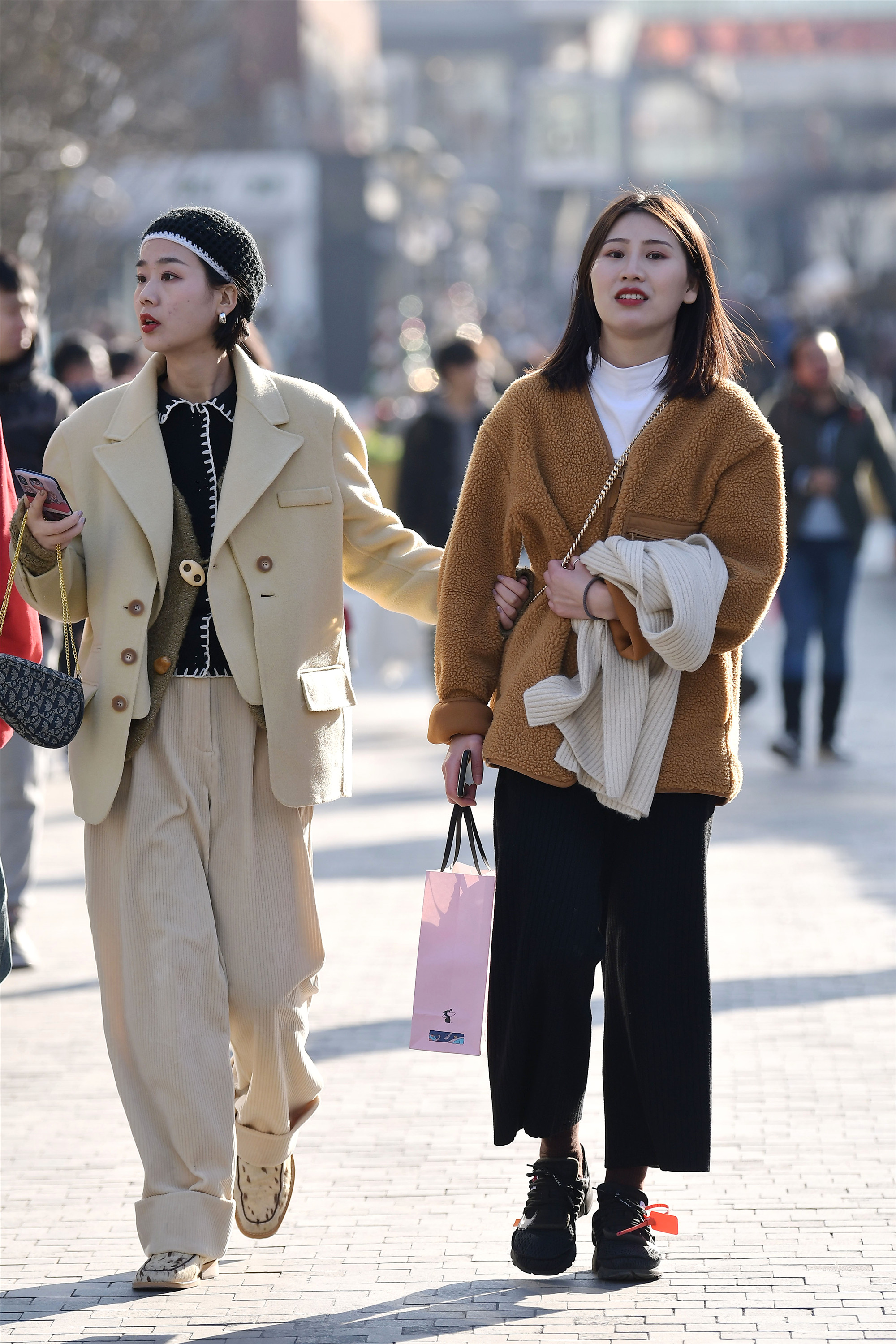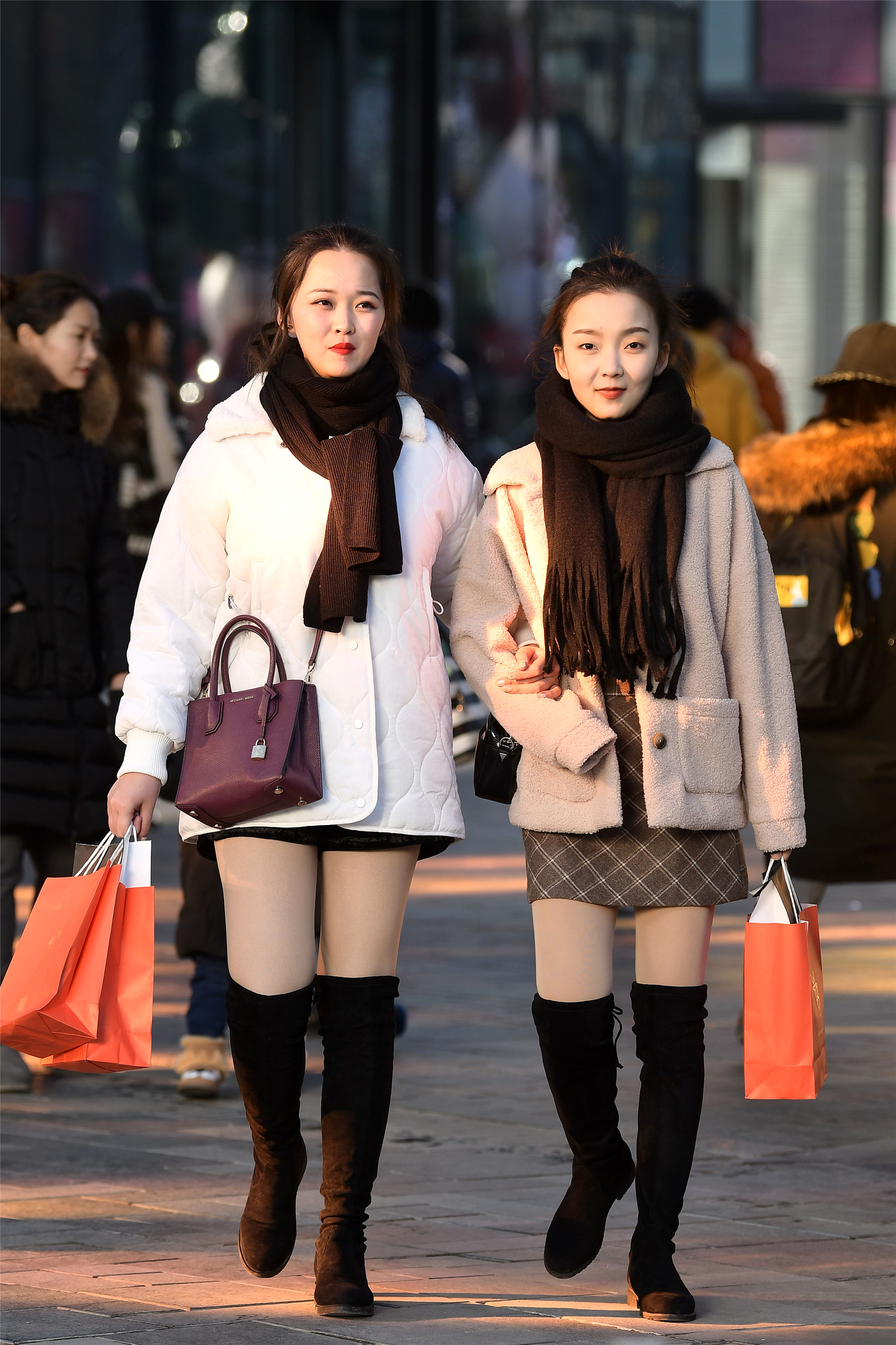 平底鞋也有着不一样的风采,一位是平底踝靴搭配着米色大衣,一位是平底板鞋搭配黑色羽绒服,长款的服装让她们的搭配更轻松自然,她们身材高度也很相似,看她们逛街也是很开心的样子。