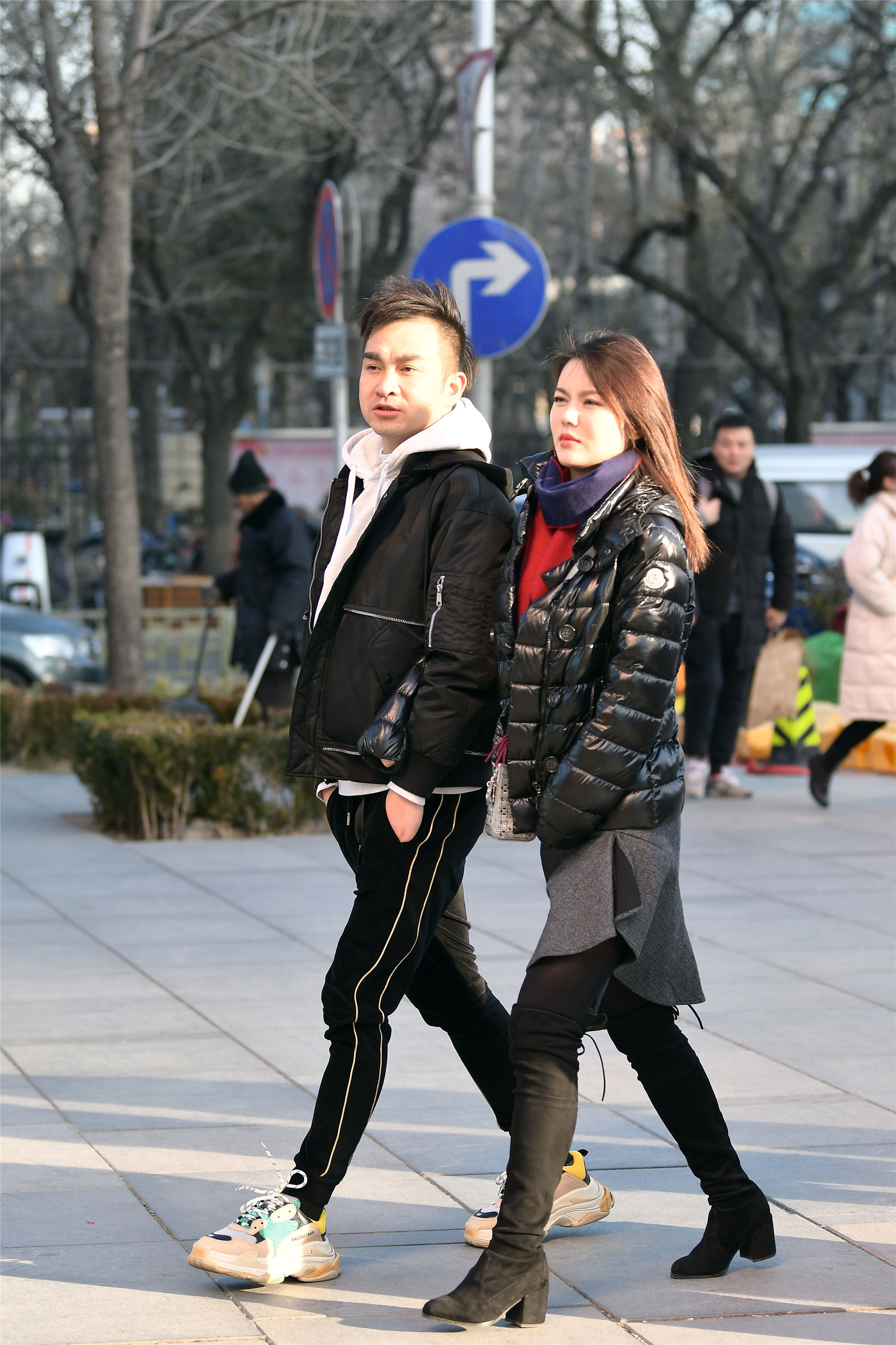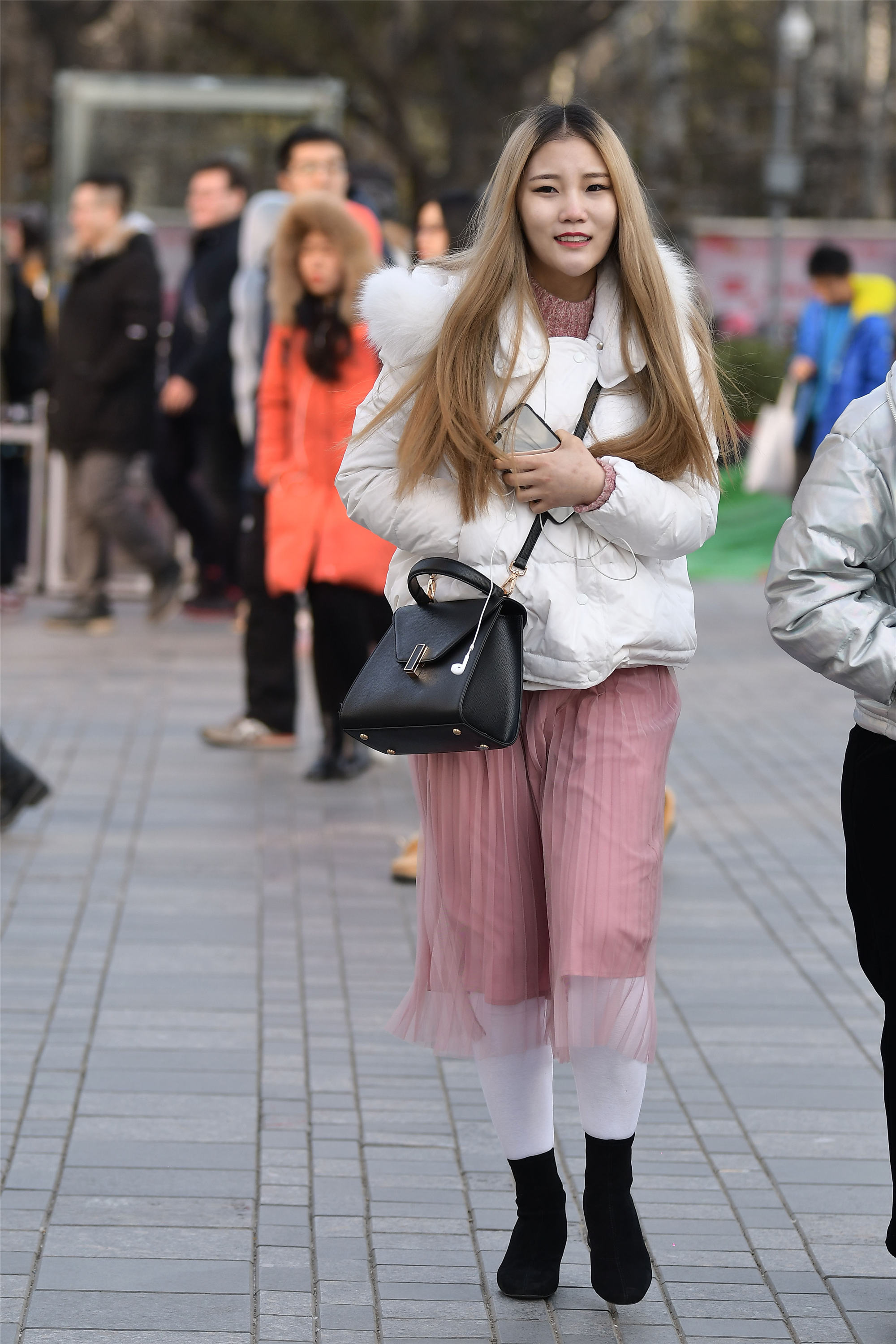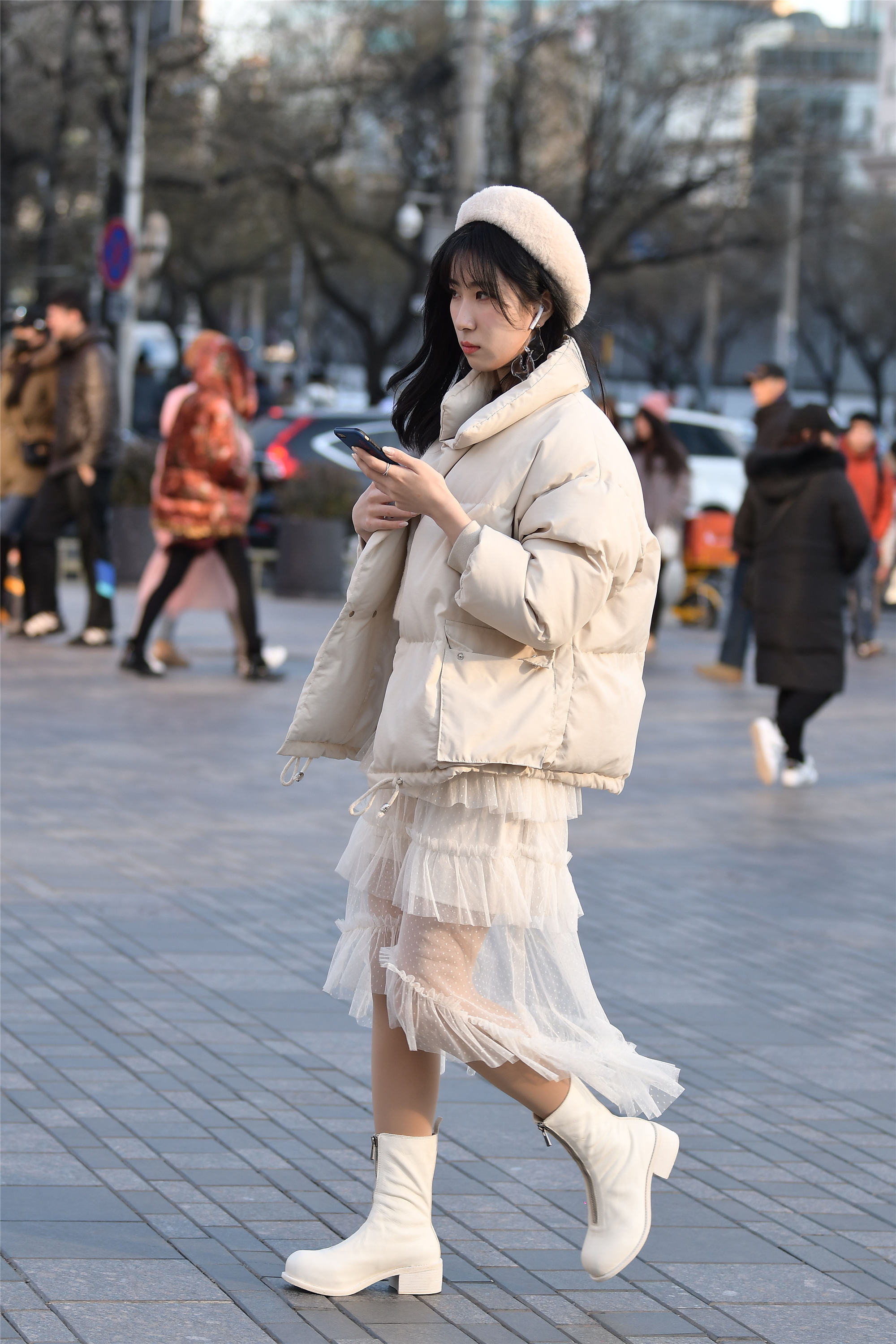 说时尚的姑娘不怕冻,确实在时尚街区有些小姐姐,冬天她们为了时尚,也会穿搭很少的衣服,她们在室外的时间不会太多,所以也不会太冷。