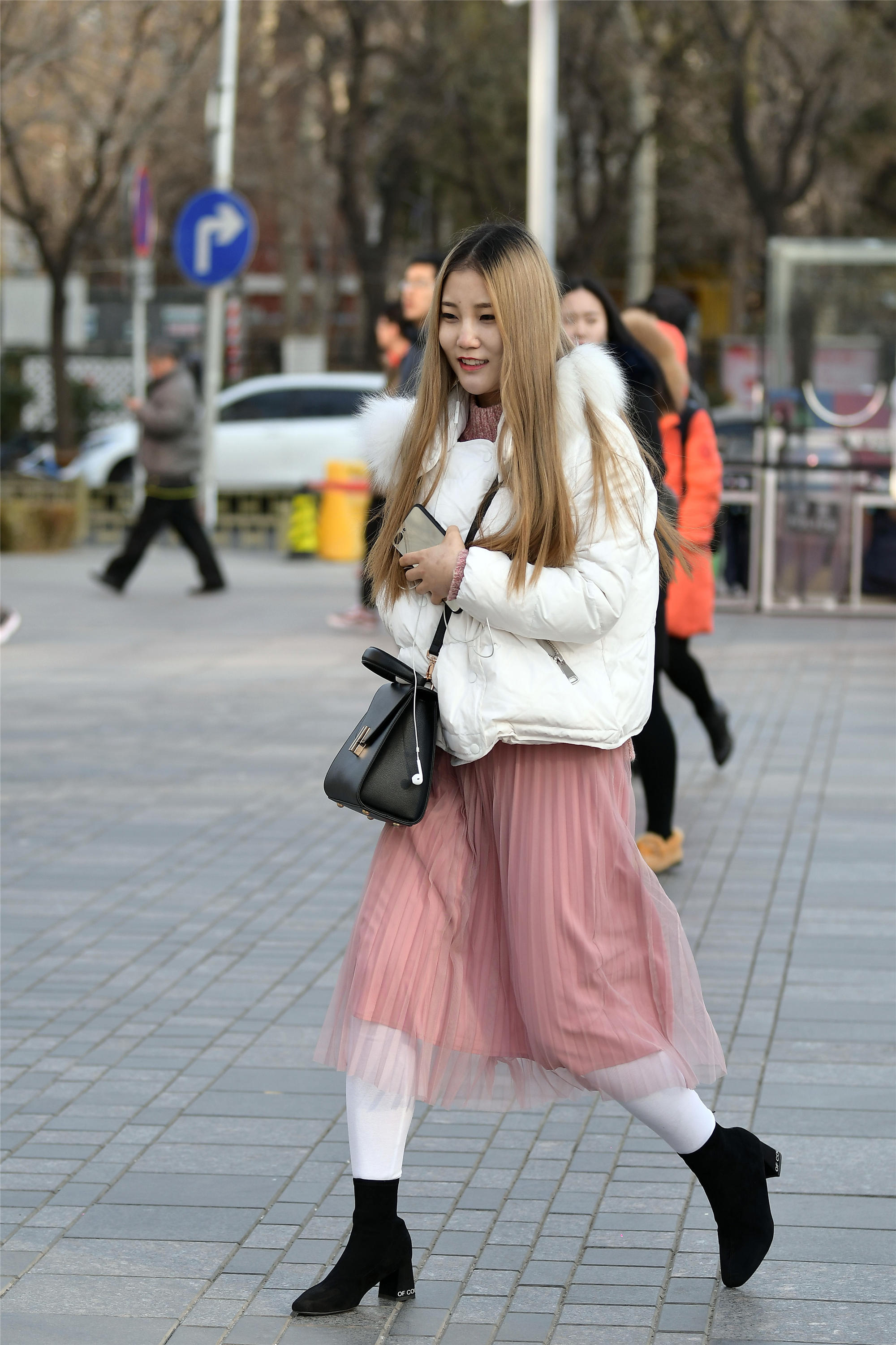 小姐姐的白色羽绒服搭配就是为了保暖,暖色的纱裙怎么看着都不会太保暖,好在有打底裤来御寒,一双黑色袜靴让她逛街更轻松,也会让她腿型显得更纤细。