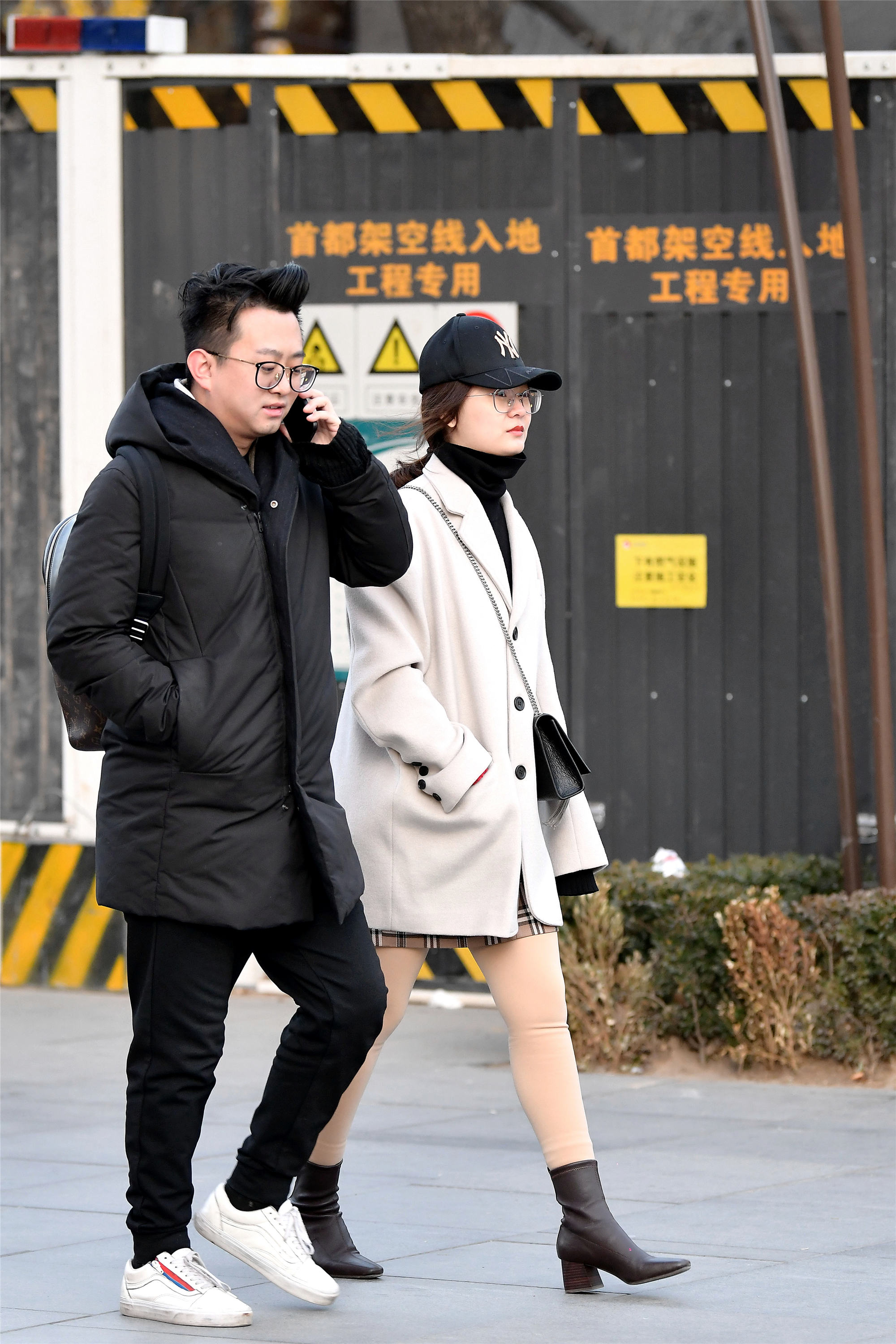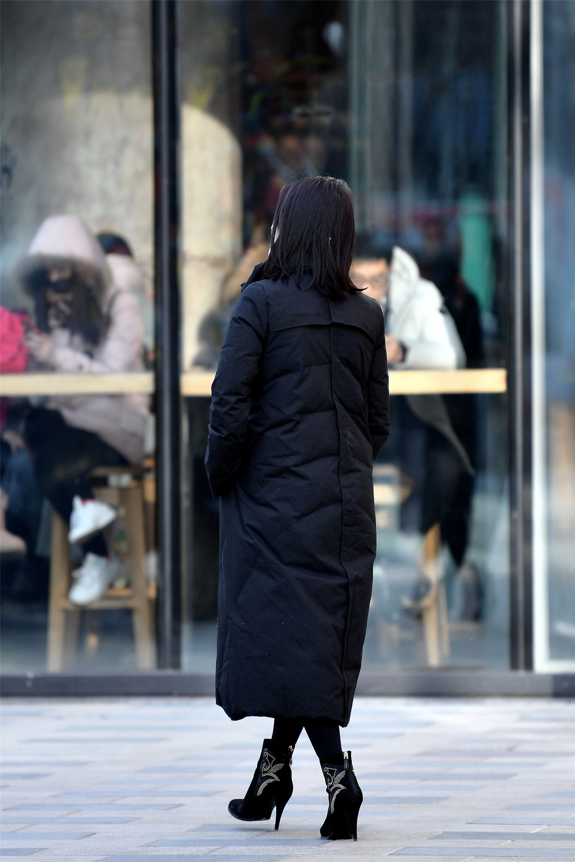 短靴搭配长款羽绒服,也是很好的搭配,简单中透着不一样的时尚感,主要是短靴和小腿怎么搭配出来效果,小姐姐的短靴靴筒略显宽松,深色的打底裤来修饰小腿,还起到保暖作用,这样会显身材骨感。