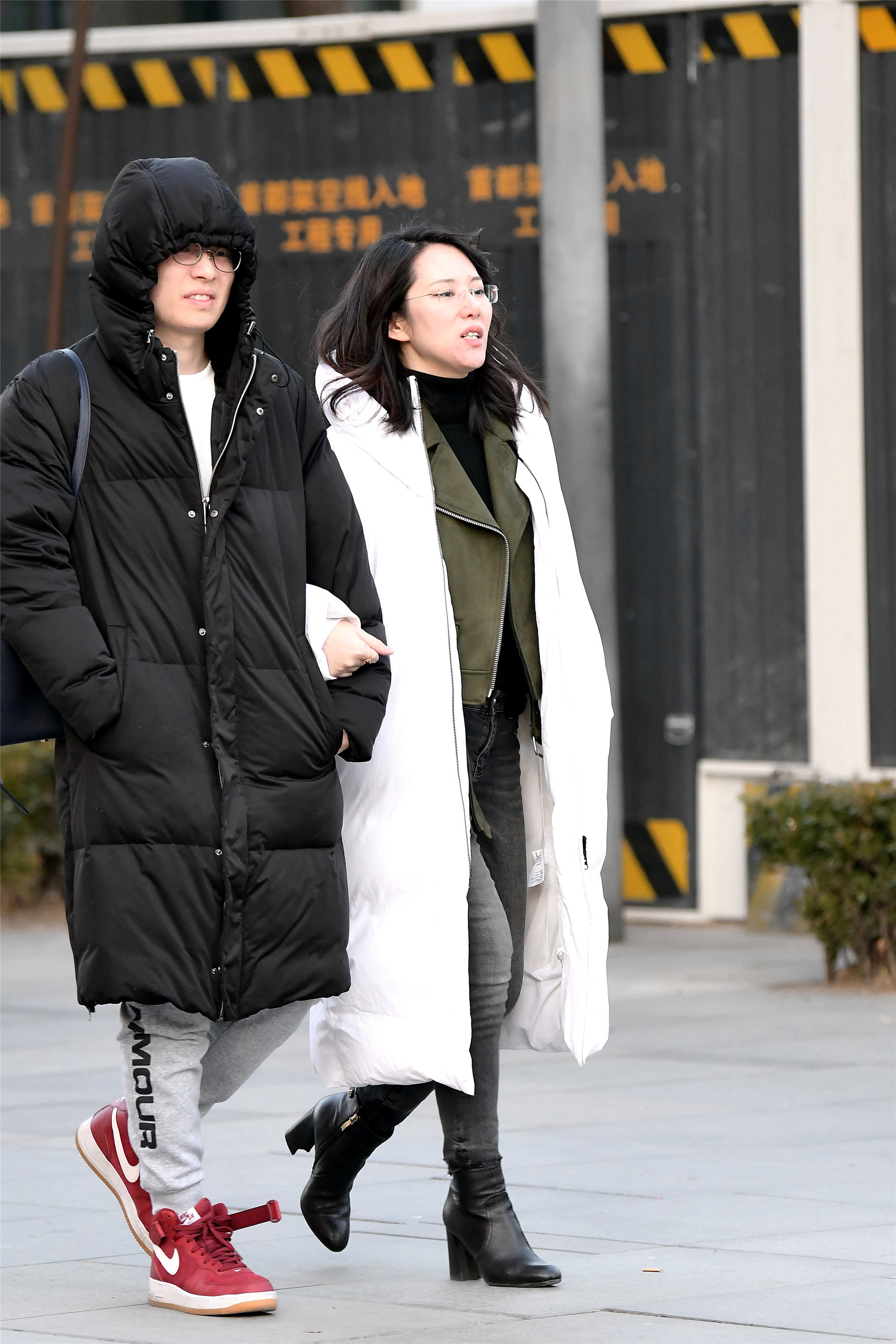说到长款大衣,这位姐姐搭配的是长款羽绒服,白色款式,蓬松的效果,内搭是一件短款夹克搭配牛仔裤,一双黑色粗跟短靴,提升整个人的气质,也增加身材高度。
