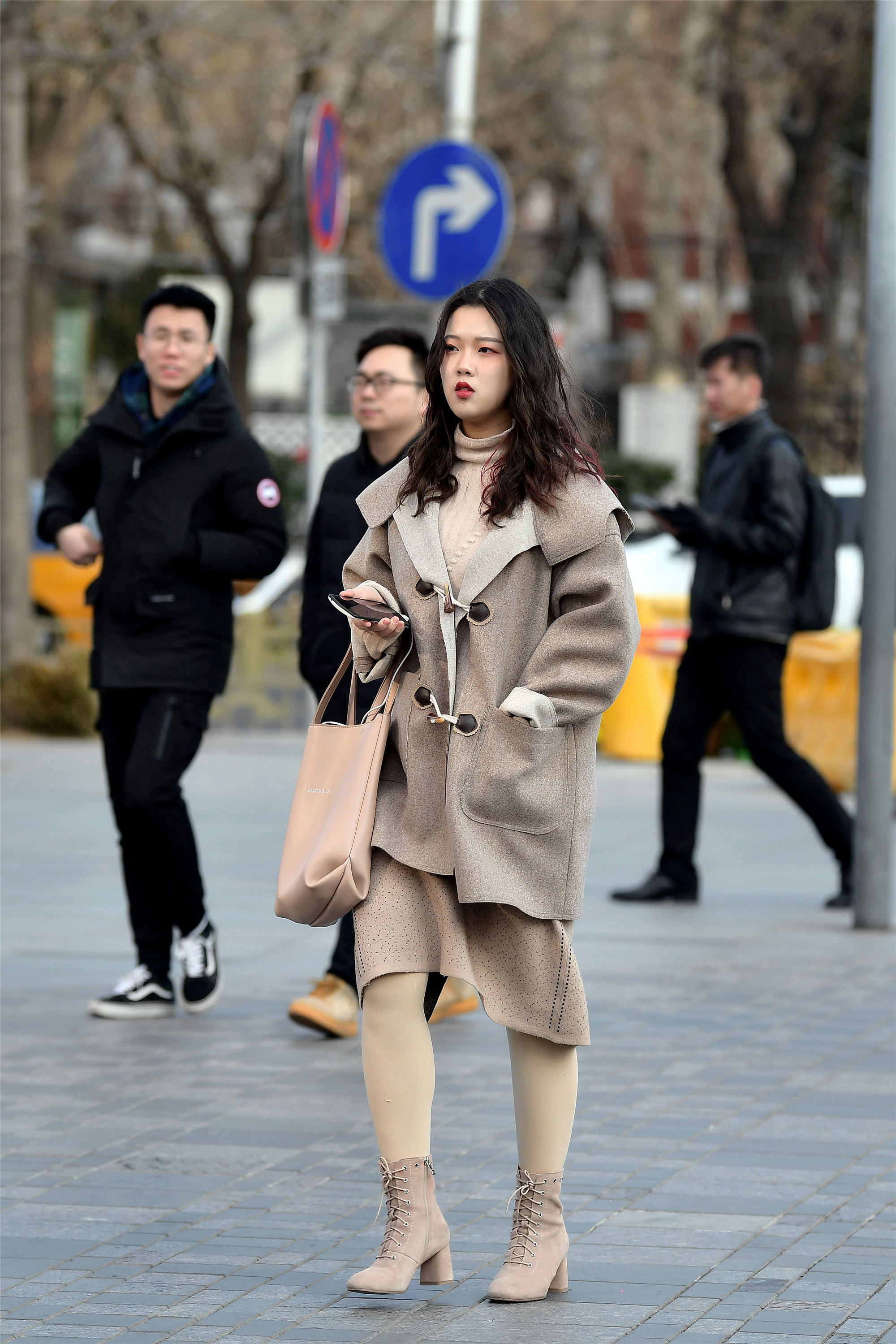 一双杏色短靴,繁琐的系带,更显精致,中款大衣搭配一件毛呢裙子,冬天这样搭配看着很有意思,也很耐看,如果裙子换一款同色的长裙,会有更好的效果。