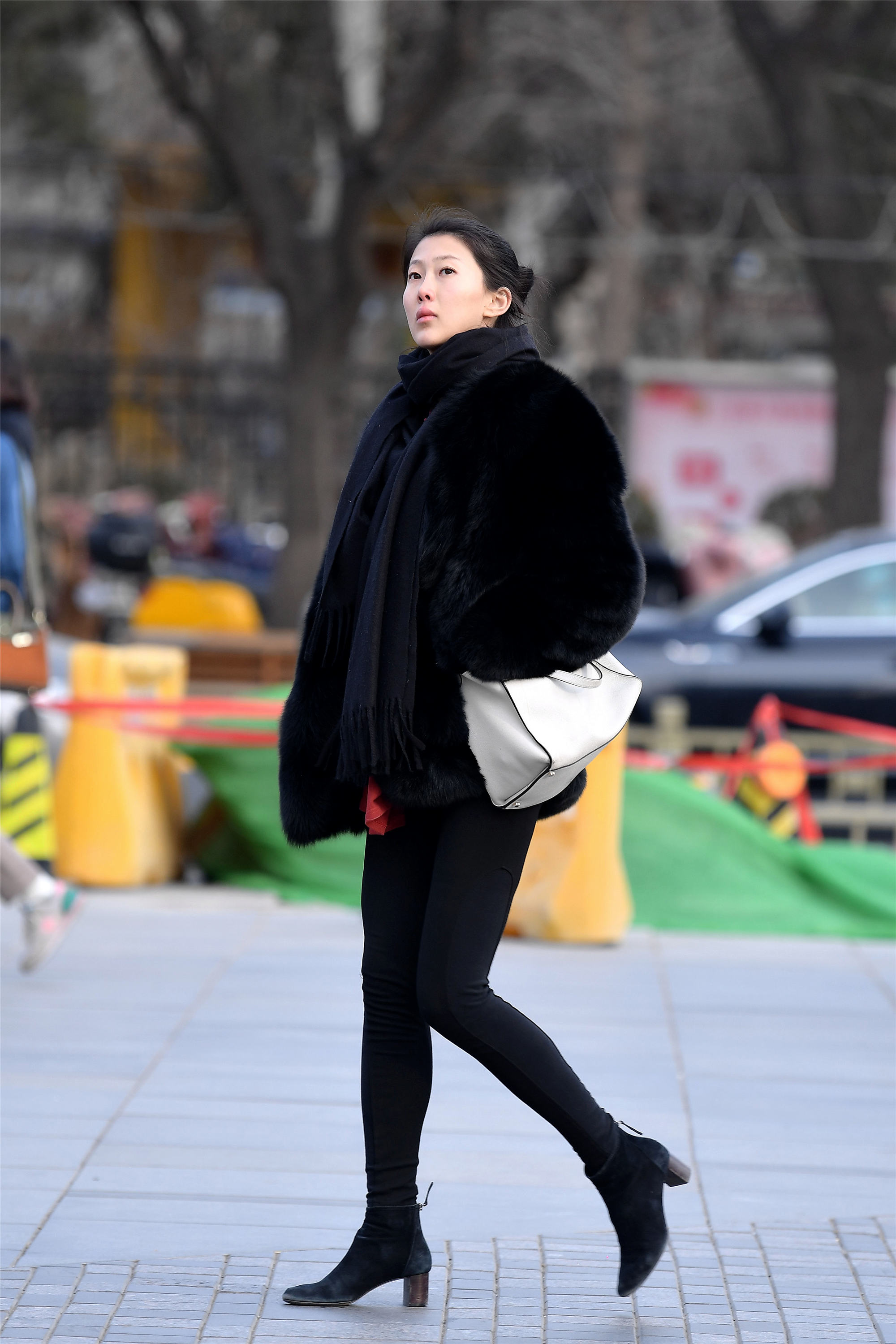 这一双高跟短靴更显秀气,设计的非常漂亮,搭配黑色修身裤子,更显身材纤瘦匀称,黑色仿皮草的大衣,更显端庄贵气,而且迈着优雅的步调,冬天的搭配也可以这么漂亮。