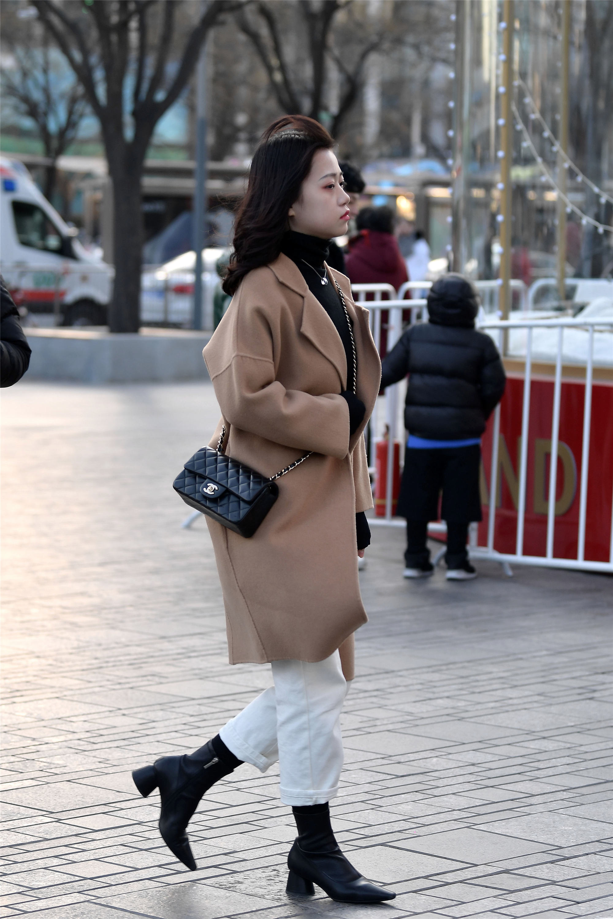 选择漂亮的短靴,黑色漆皮,贴在脚面的软皮,非常漂亮,显瘦效果非常明显,而且短靴也很百搭,深浅色都可以搭配出很好的效果,姑娘搭配的是一件中款大衣,如果是长款大衣也非常漂亮。