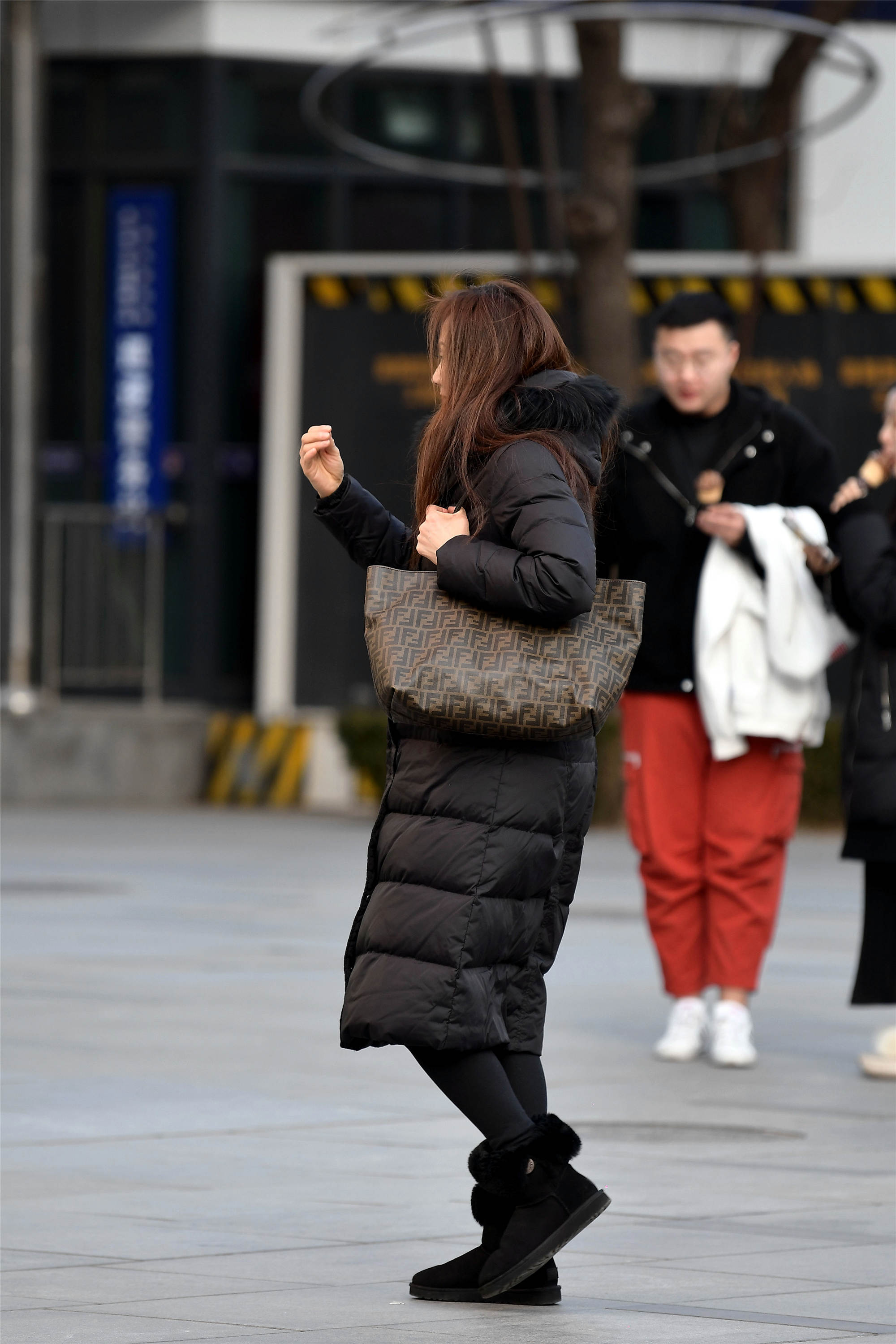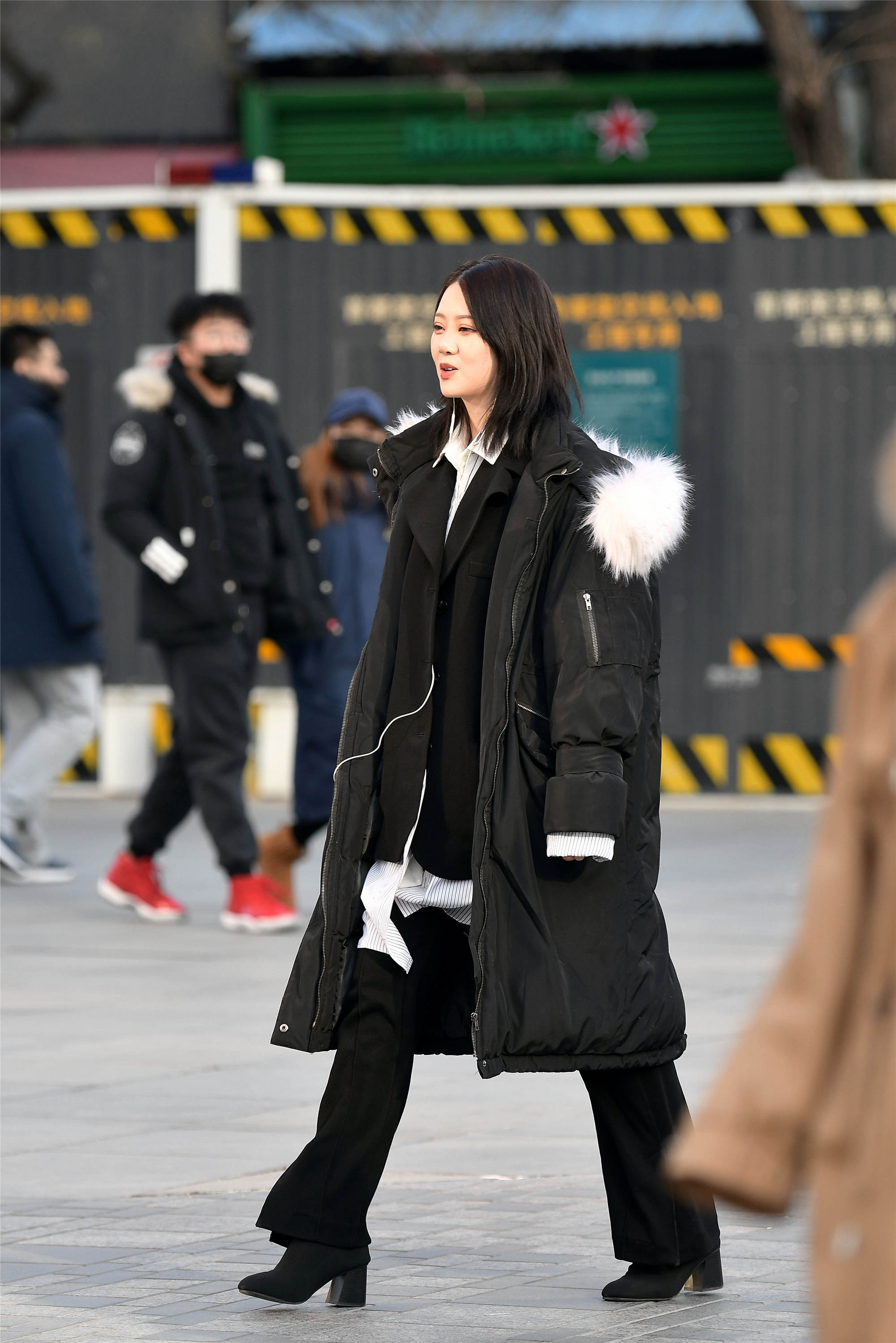 黑色中长款的羽绒服,姑娘敞开衣襟,这样更有个性,雪纺的裤子搭配一双高跟短靴,一身黑色搭配也非常精彩。