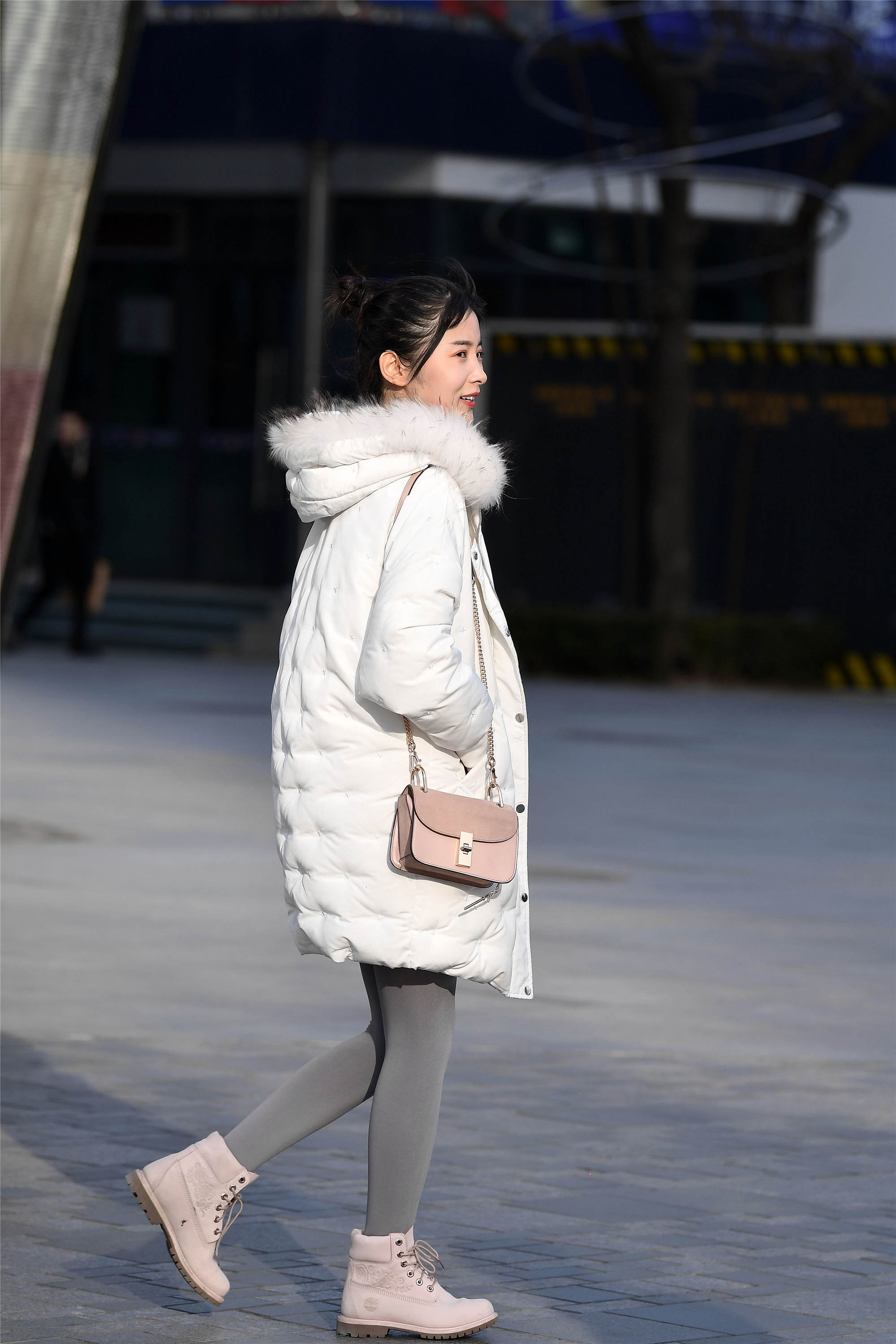 姑娘这款灰白色短款羽绒服,有着塑料的质感,浅灰色打底裤搭配一双米色长靴,浅色系的搭配非常漂亮,冬天穿着浅色衣服的不多,搭配出来的效果也显得很干净。