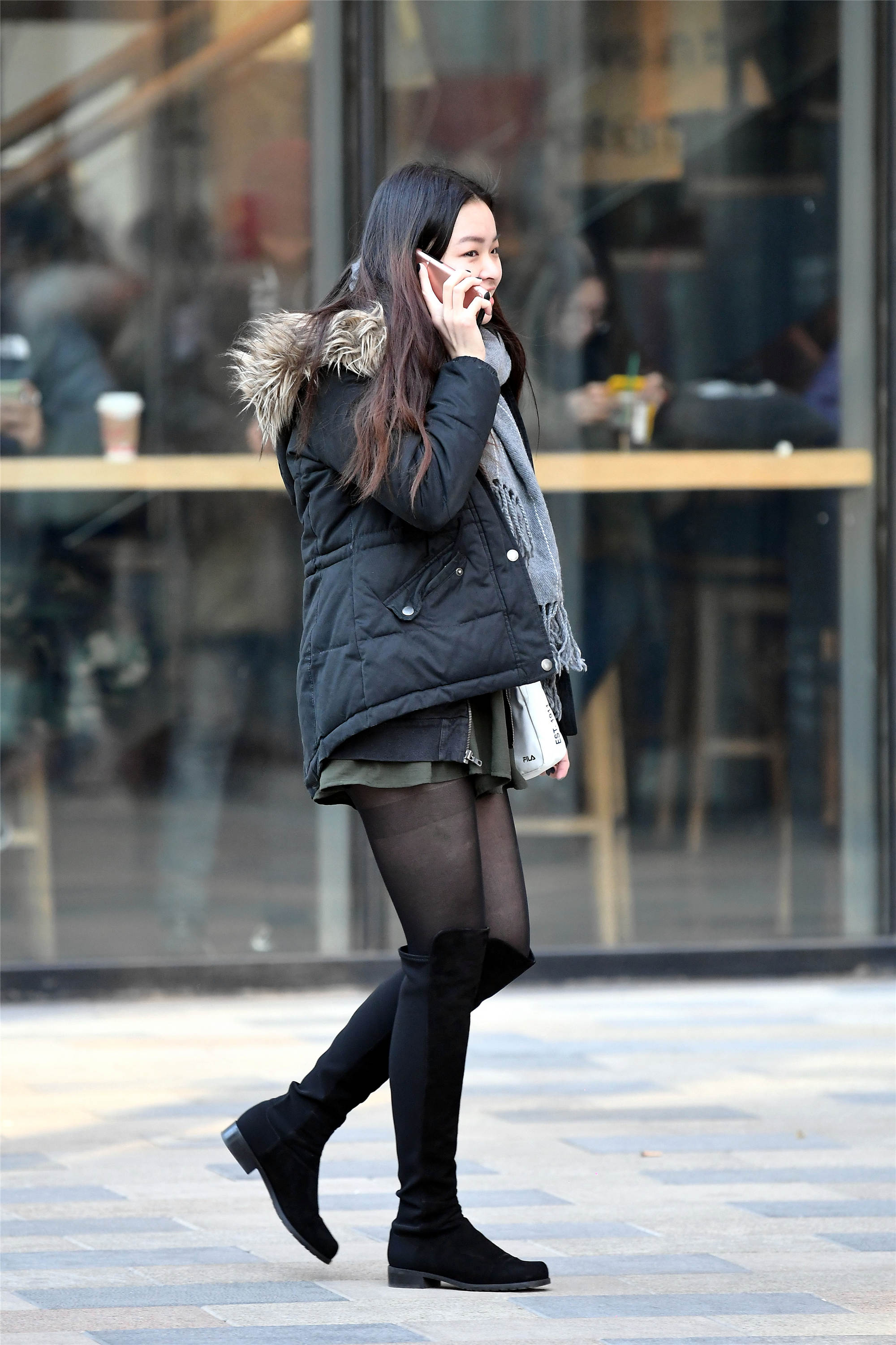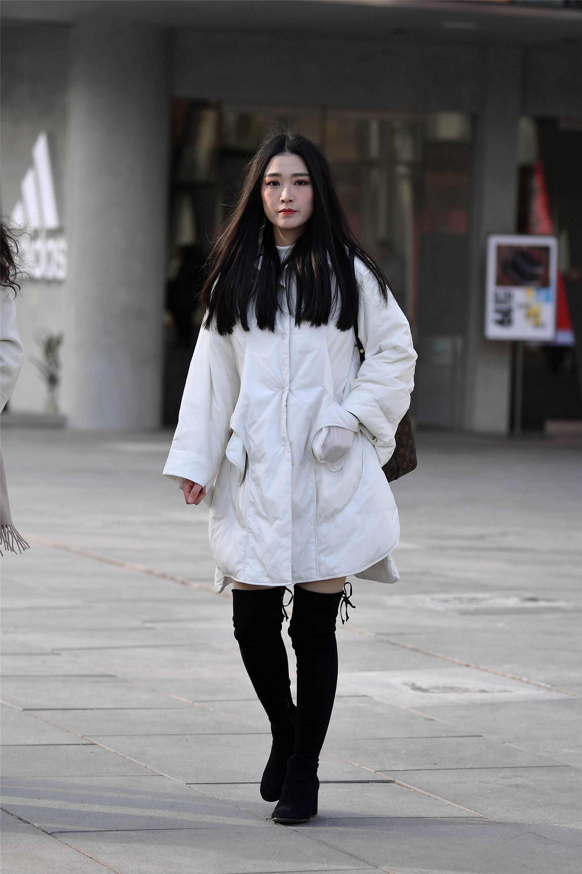 小姐姐一件白色中款羽绒服搭配一件黑色绒面过膝长靴,非常简单的穿搭,头发垂在前面,遮挡部分脸颊,显脸小效果非常不错。