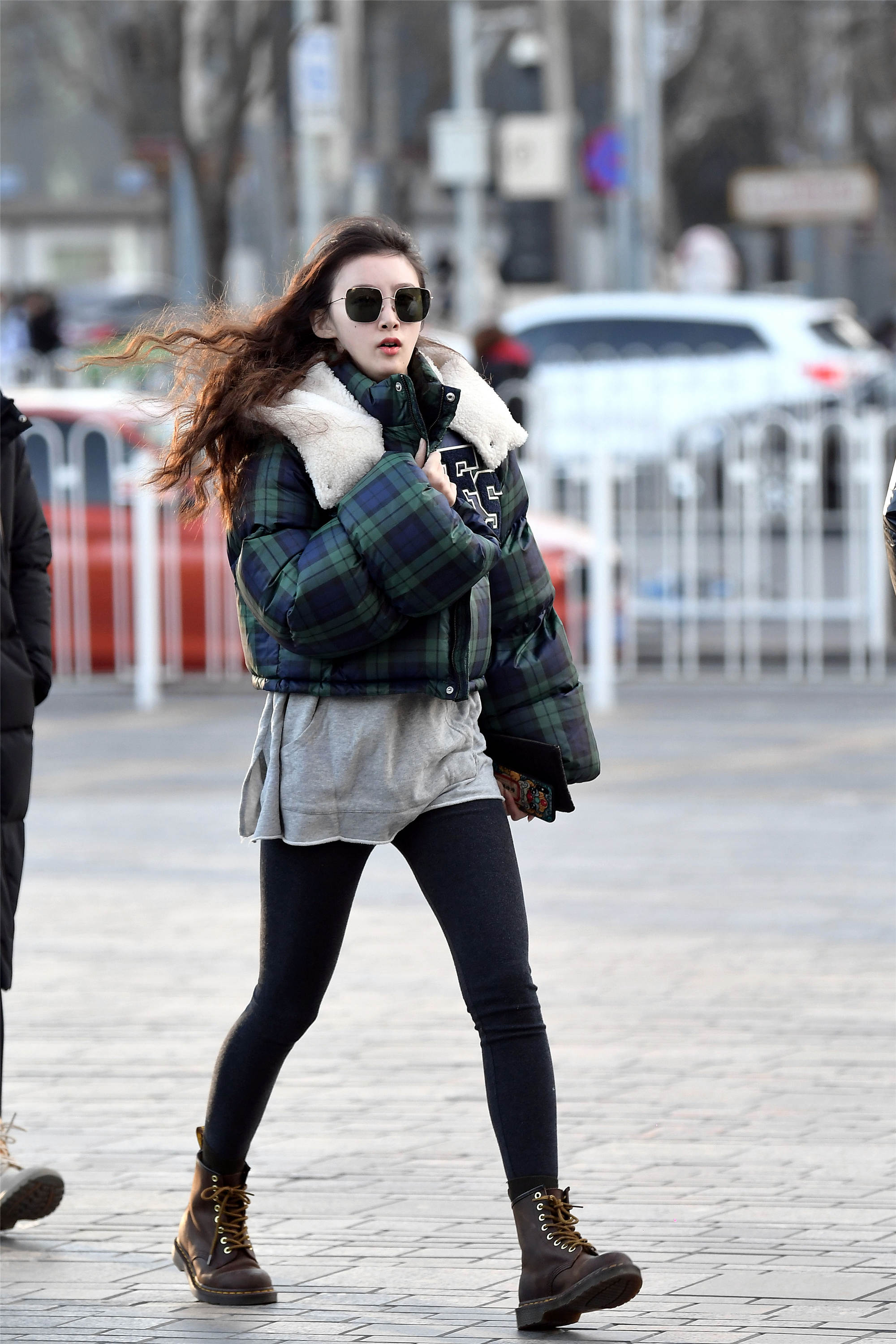 短款的格子羽绒服,浅灰色内搭露在外面,有着裙子的效果,黑色打底裤搭配一双圆头马丁靴,非常好看,小姐姐的秀发飘起来,非常有个性。