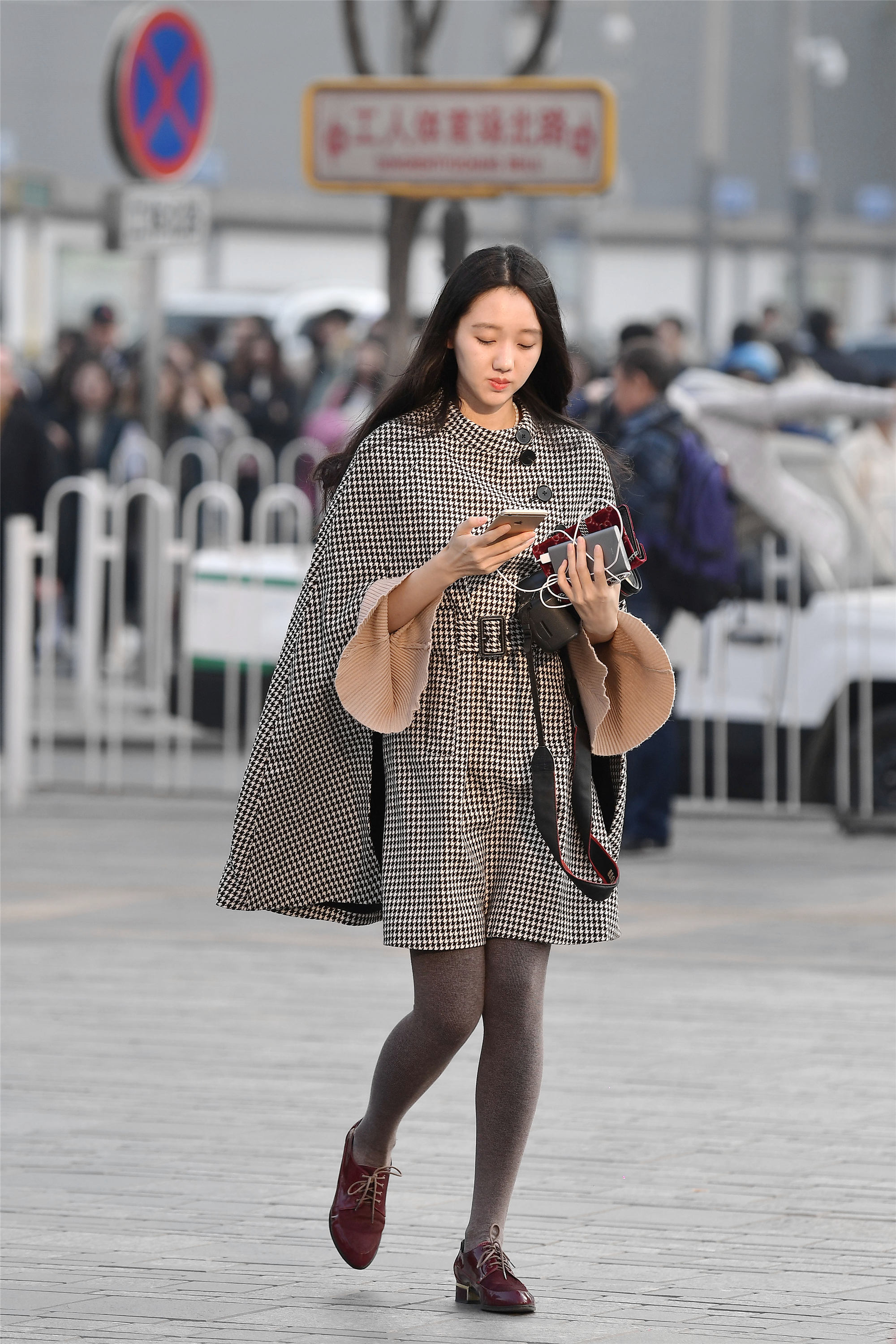 小姐姐这一款蝙蝠样式的千鸟格大衣,非常个性,显得很高级的感觉,深灰色的打底裤搭配一双小皮鞋,非常时尚的感觉,2公分的鞋跟,多余姑娘来说,和平底鞋没有什么却别,而且圆头的鞋子显得非常优雅,更像是小女生才这样搭配的,又有着一种成熟的感觉,似乎带着一种矛盾的搭配。