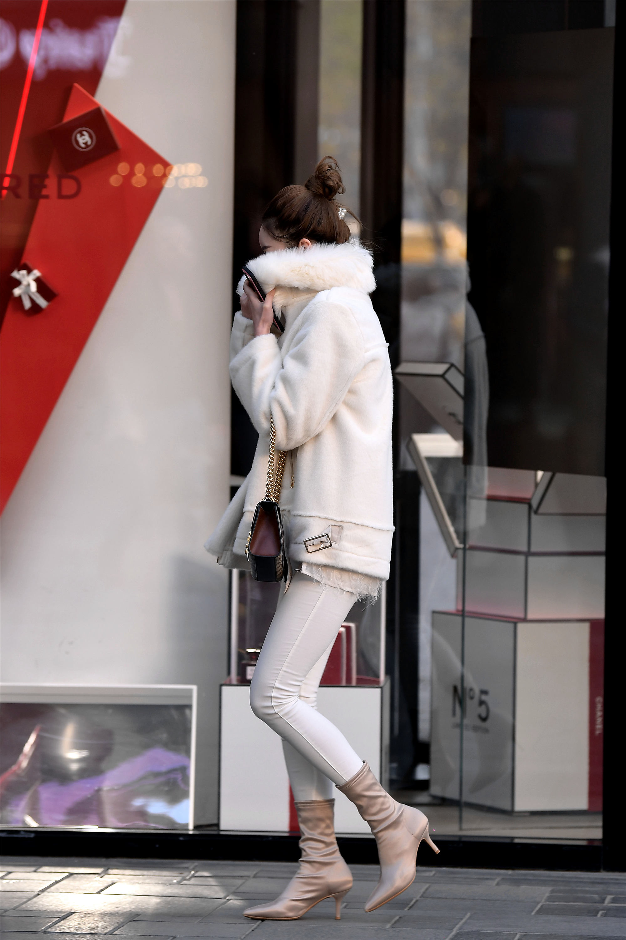 成熟的女士,会搭配出她们心目中的形象,年节到来之际,她们用浅色系搭配出干净成熟的风格,仿皮草的上衣,会让她显得很贵气,而且色彩很统一,看着很漂亮,白色修身裤,更显出她优美的腿型,借助一双尖头细跟短靴,脚踝处更显得纤细,这样的搭配可以看出姑娘身材略显骨感,这样一身搭配,在时尚街区也是非常好看的。