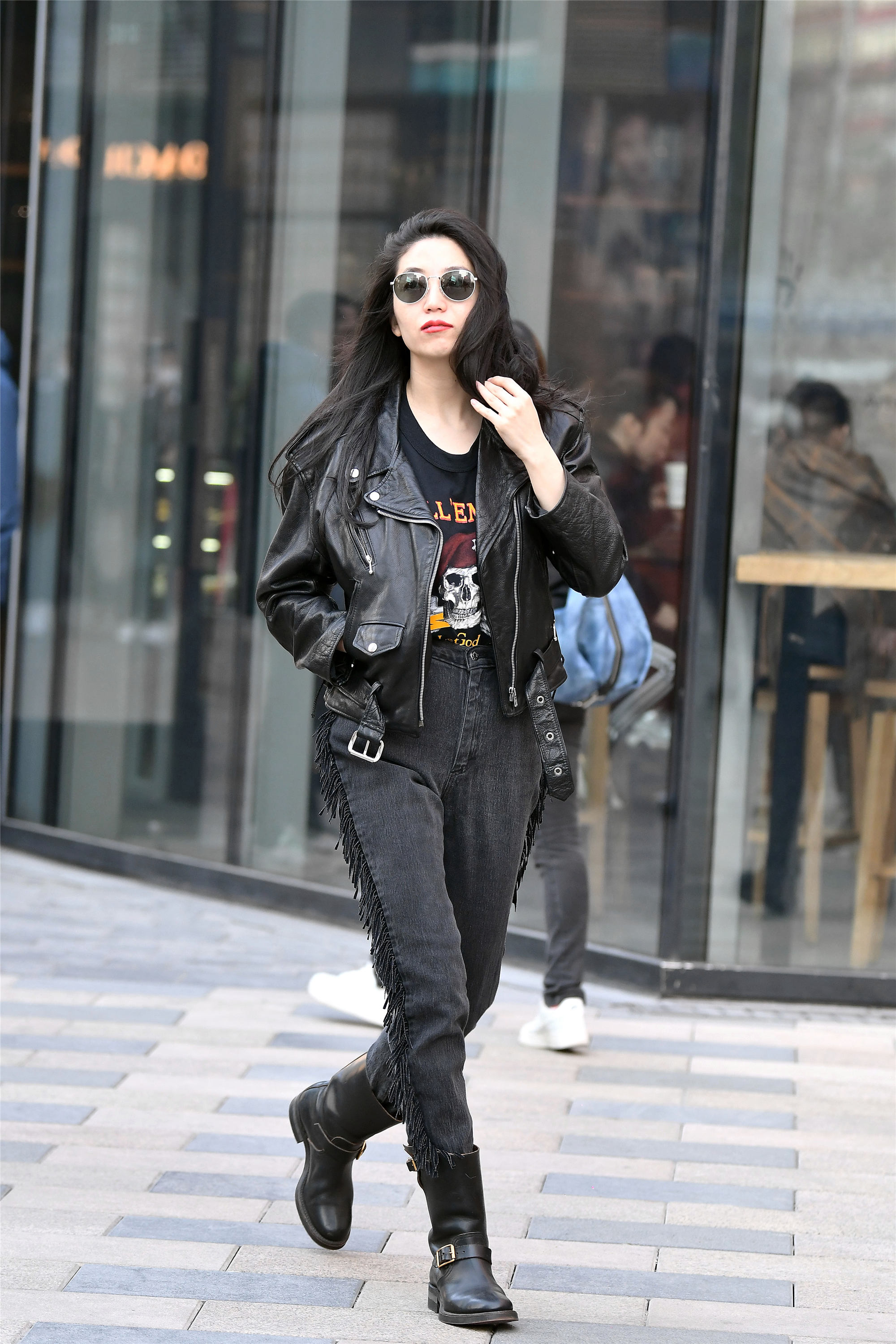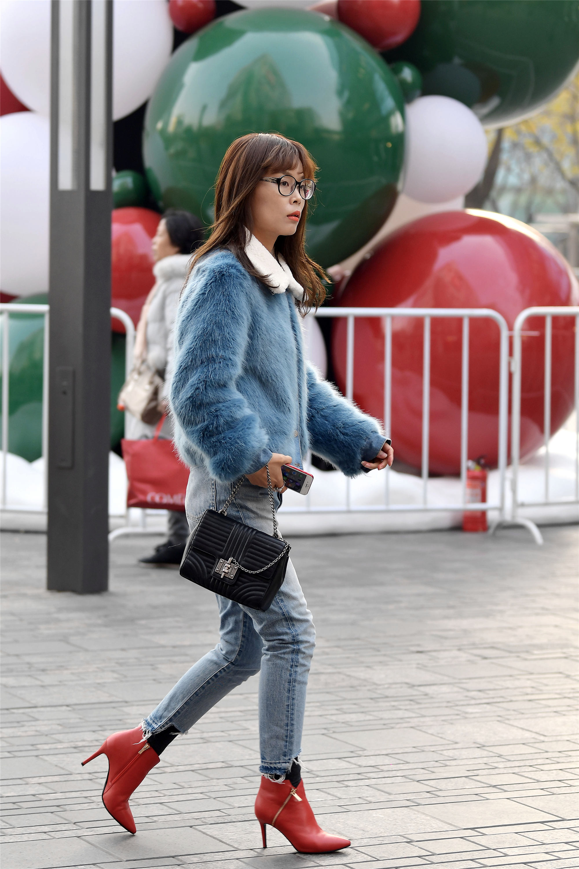蓝色皮草上衣,远远看去,非常低调的搭配,仔细看一下,还觉得非常漂亮,蓝色牛仔裤,姑娘选择的这条牛仔裤非常漂亮,虽然不是修身的,却很显身材,裤脚处被自己处理一下,毛边中又带着不对称的设计,更好的衬托了她脚下一双红色尖头细跟短靴,这款靴子在年节期间穿搭,非常个性,而且红色鞋子也很好搭配,有很显眼,会带着新年的喜庆感觉。