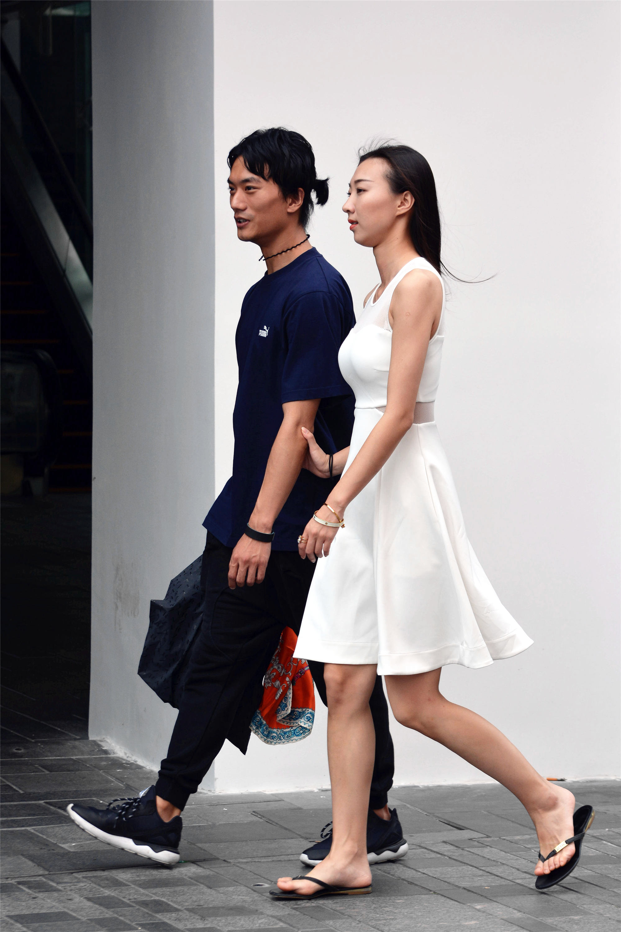 这一对闺蜜,她们都穿着平底鞋,一位是人字拖,一位是平底单鞋,而且她们也很好的搭配出长腿的优势来,白色牛仔短裤搭配一件黑色长袖,黑白的对比,有很好的展示了身材比例,她的闺蜜是黑色短裙搭配一件吊带背心,还特意露出一点腰线位置,看着很自然的搭配,却有着很好的比例和显瘦的效果。