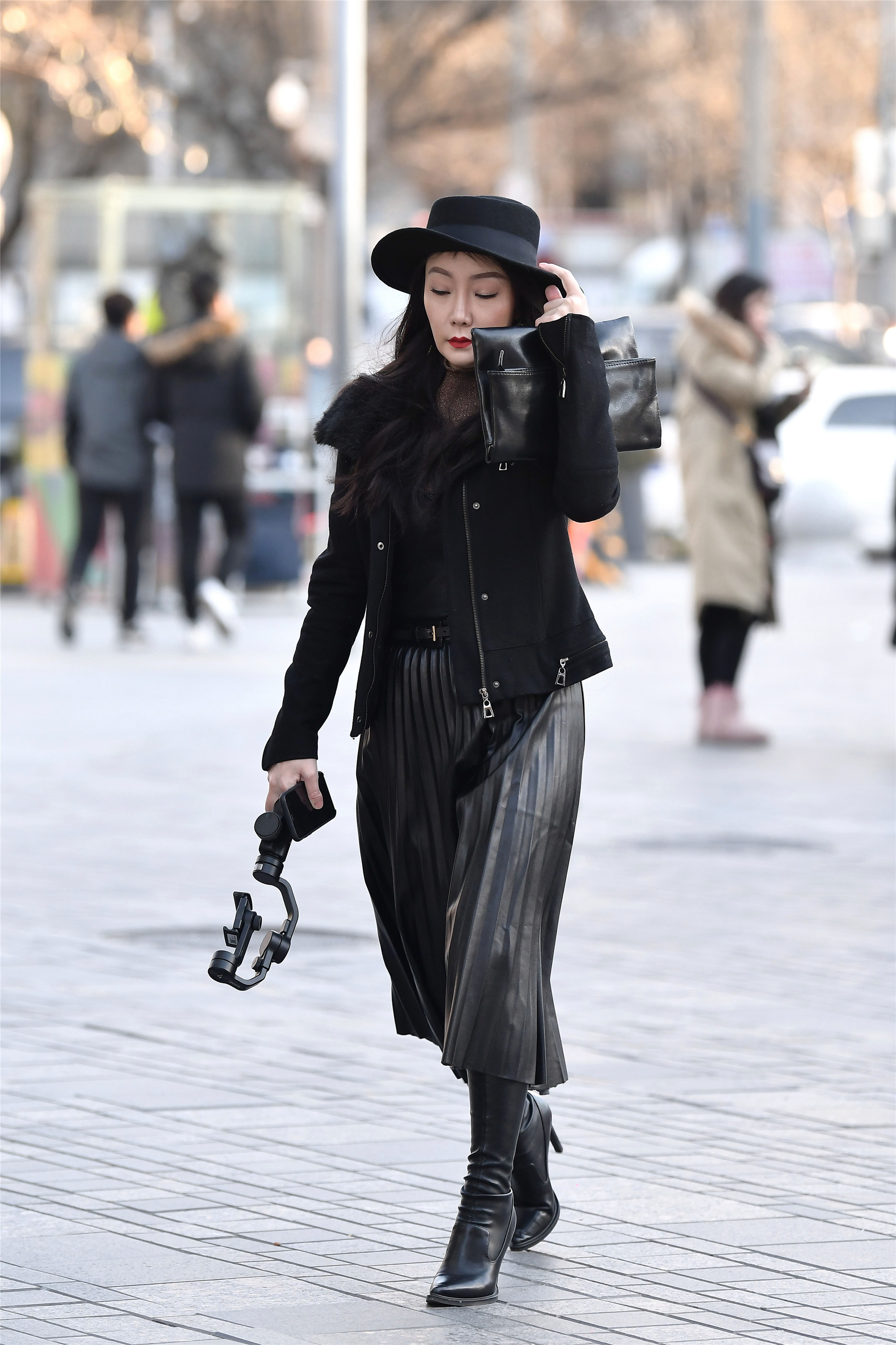 一位时尚的姑娘,她们的搭配是不分季节的,即使到了冬天,她们的搭配依旧非常漂亮,看一下这位小姐姐,冬天也可以穿着裙子出来,这款压褶的长裙,非常漂亮,一双尖头细高跟靴子,修身效果很好,也显得身材高挑,黑色短夹克搭配,这样更有层次感,而且带着帽子非常漂亮,让她看着很优雅。