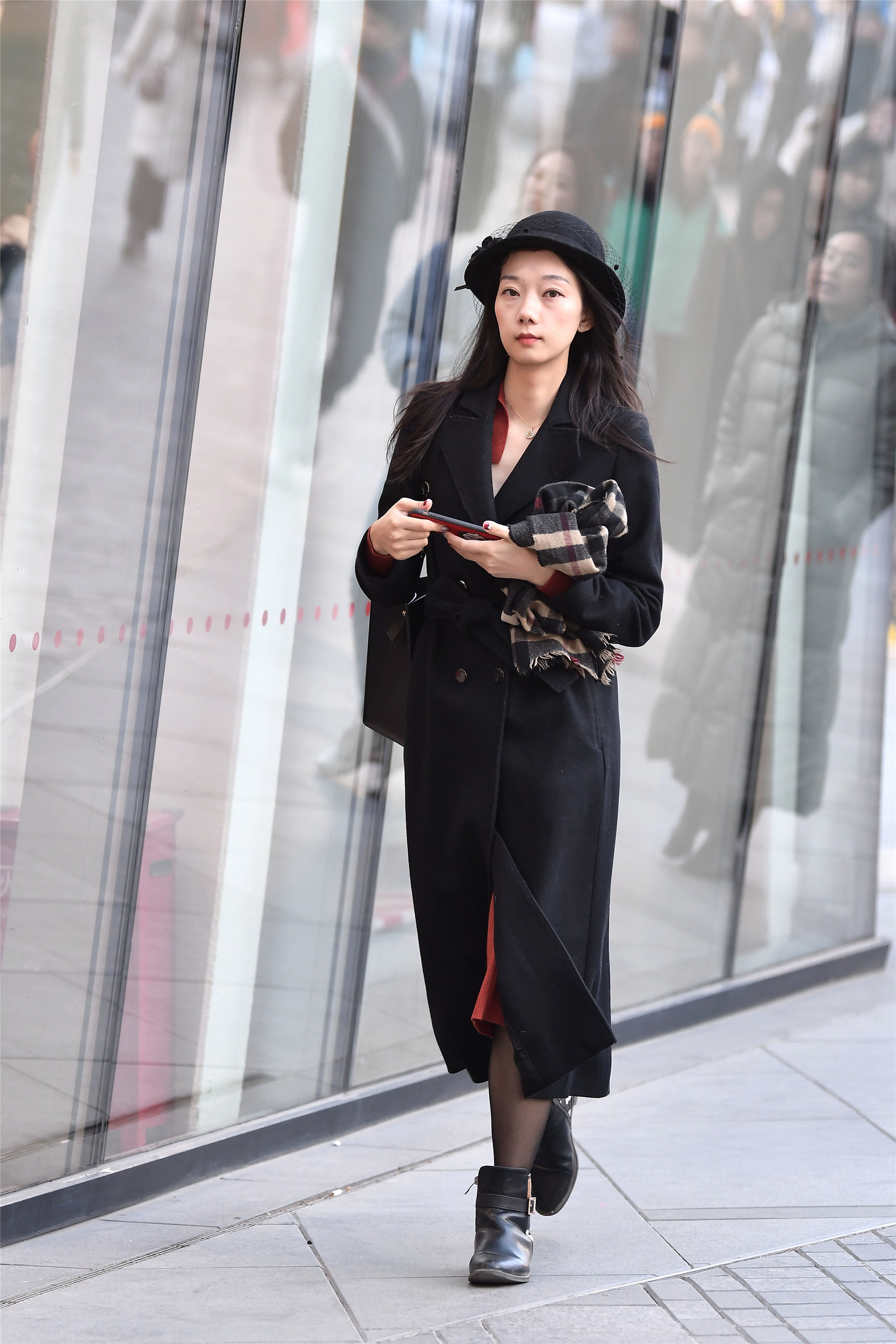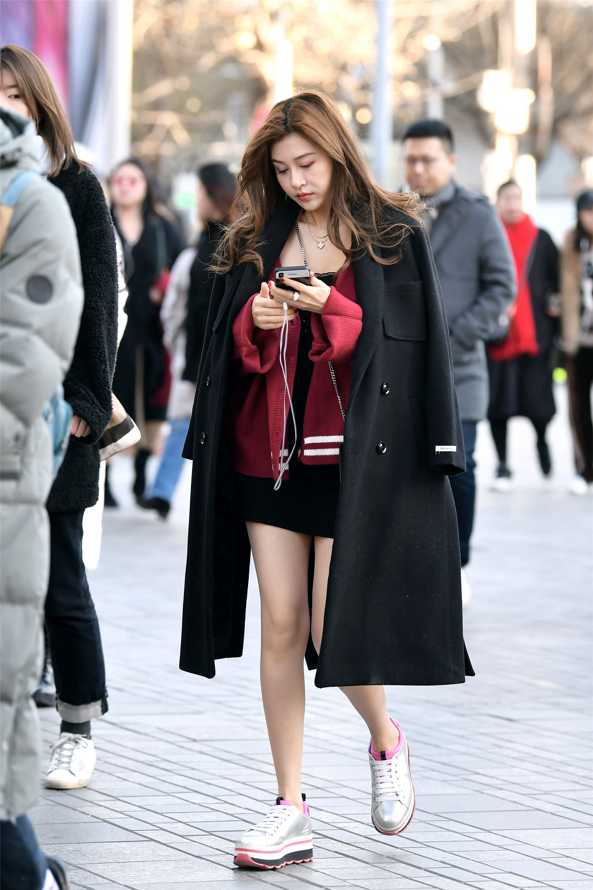 小姐姐身材高挑,所以也很会搭配,年轻就是不怕冷,一件黑色短裙,光腿出门搭配一双银色厚底鞋,红色针织内搭也很漂亮,黑色呢子大衣披在肩上,长发自然垂下,而且小姐姐的五官非常精致,而且这样走路穿搭非常有范。