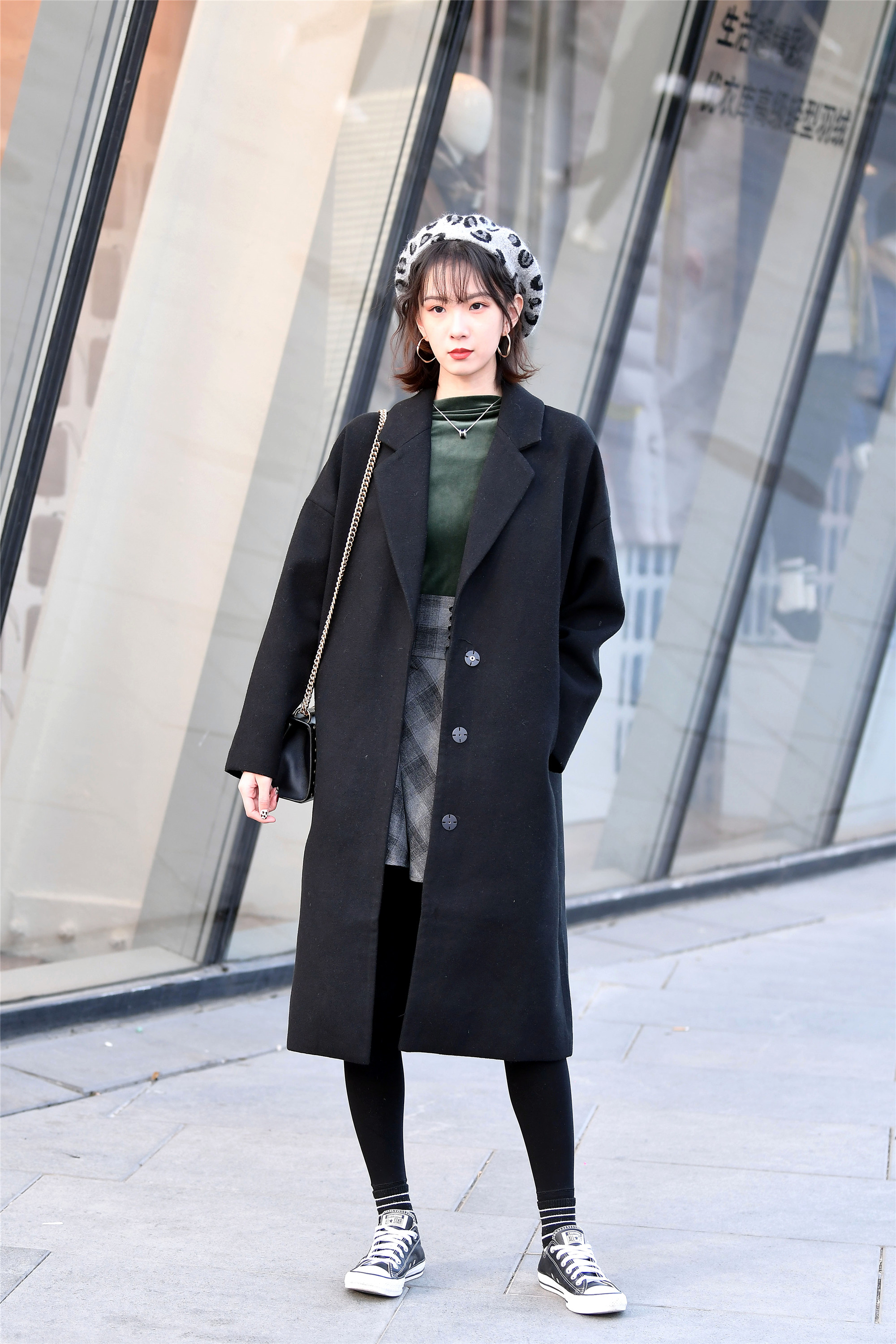 这位小姐姐是简约风格,黑色风衣搭配墨绿色小衫和一款灰色格子裙,黑色打底裤和一双平底帆布鞋,非常个性,有着时尚女孩的感觉,她的帽子起到了很好的装饰作用,让她看起来更加精致。