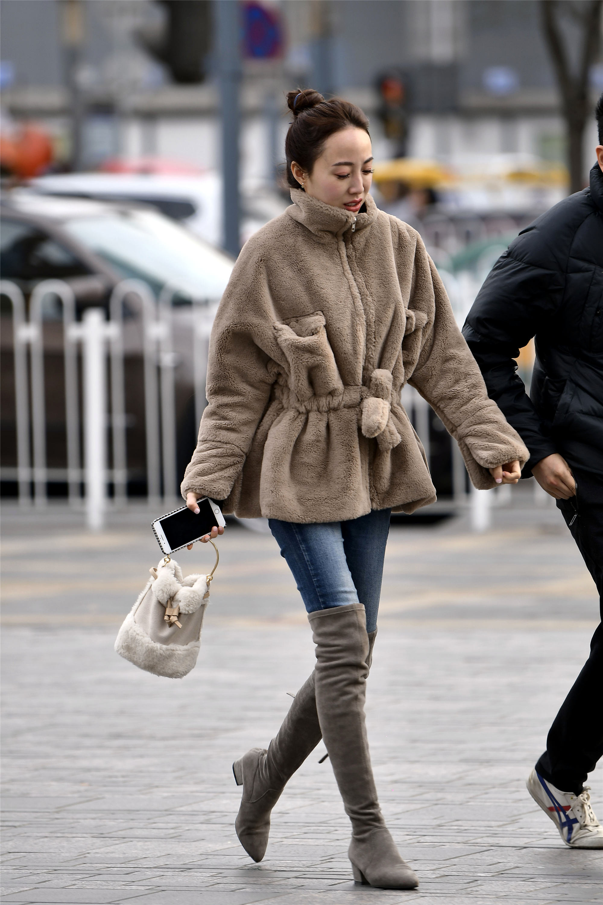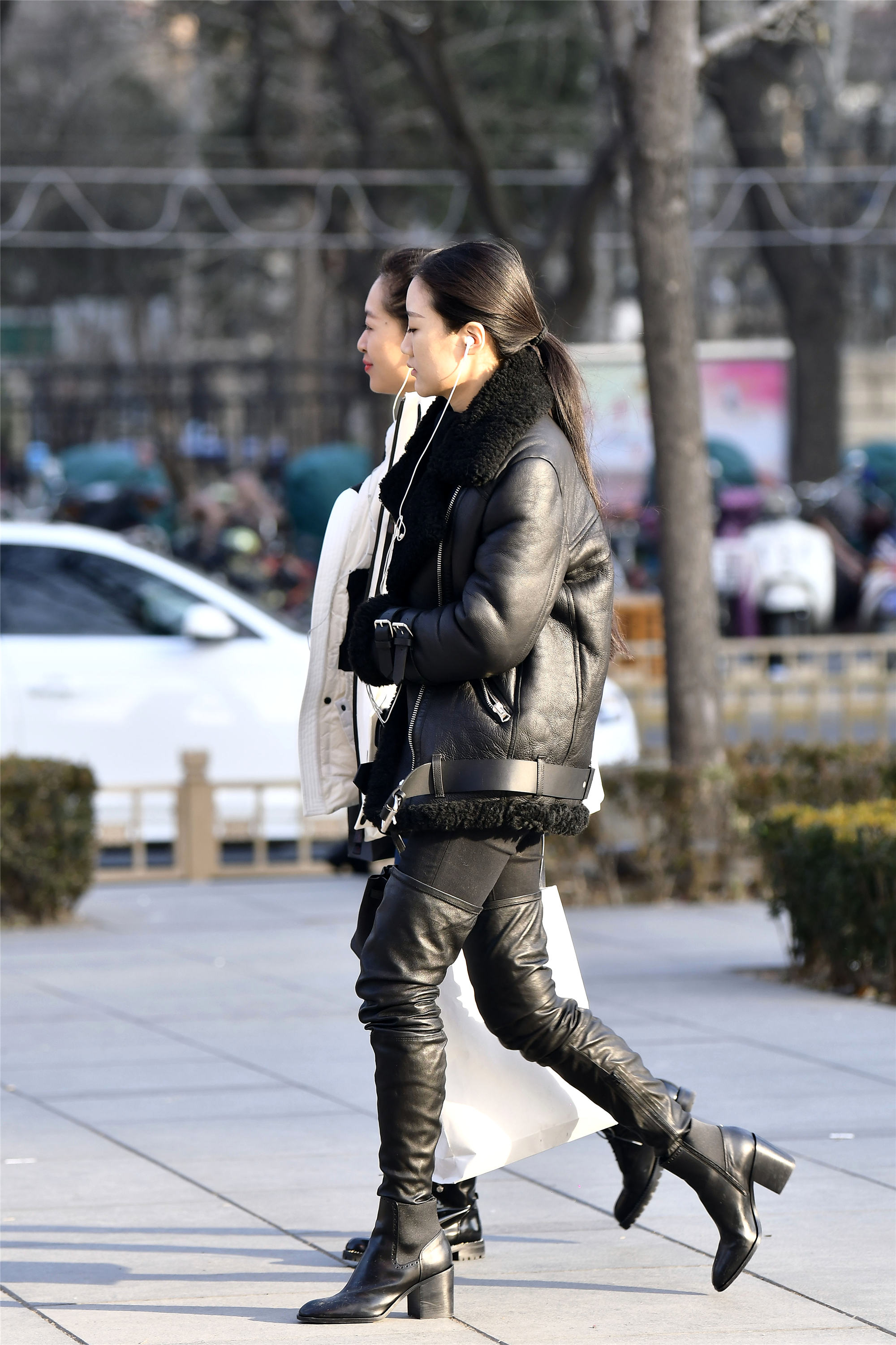 很多小姐姐冬天很会搭配服装,她们将自己搭配的很漂亮,现在是时尚姑娘,她们都追逐自己的个性,选择衣服和搭配服装的时候,都会按照自己的个性去选择服装与搭配,这位小姐姐非常会选择衣服,一件厚实的羊羔毛皮夹克搭配一双皮靴,过膝的长度非常漂亮,鞋型也非常显瘦,这样长度靴筒,不是谁都可以驾驭的,保暖效果应该非常不错。