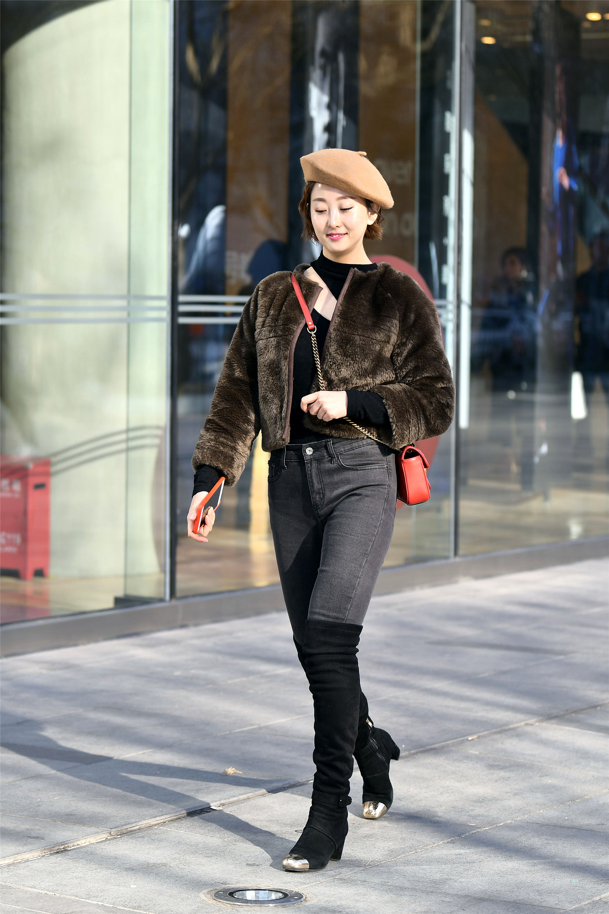 冬天很多的时尚姑娘,更喜欢搭配一双长靴,而且要选择高跟鞋,无论是粗跟还是细跟,都可以搭配的非常漂亮,因为她们很会选择衣服,看一下这位小姐姐,一双绒面过膝靴,鞋尖位置是金属头设计,非常个性,搭配着黑色牛仔短裤,深色小皮草非常漂亮,在阳光下更有一份优雅,而且很显身材高挑,头上的帽子非常个性,也是很漂亮的款式,这一身搭配非常漂亮。