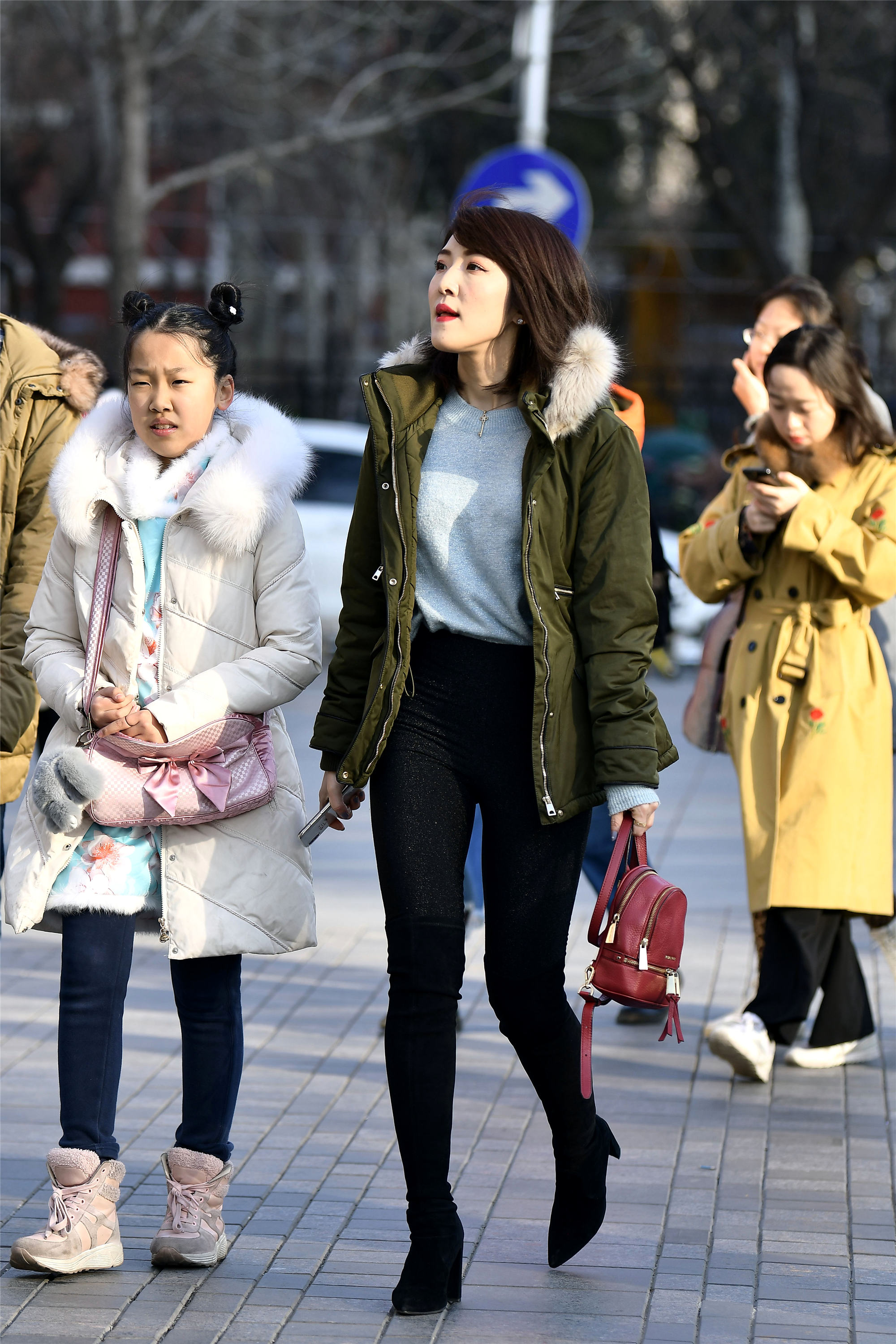 到了时尚街区,穿着长靴,因为衣服搭配的不同,所以搭配出来的风格也不同,搭配处自己的个性,才是最好的,看一下这位姑娘,她选择一件中短款的棉服,敞着怀是为了展示内搭,黑色尖头粗跟过膝靴,搭配着黑色修身高腰裤,让身材比例特别好看,而且也显出腿的纤细修长,浅灰色小衫有非常不错的搭配。