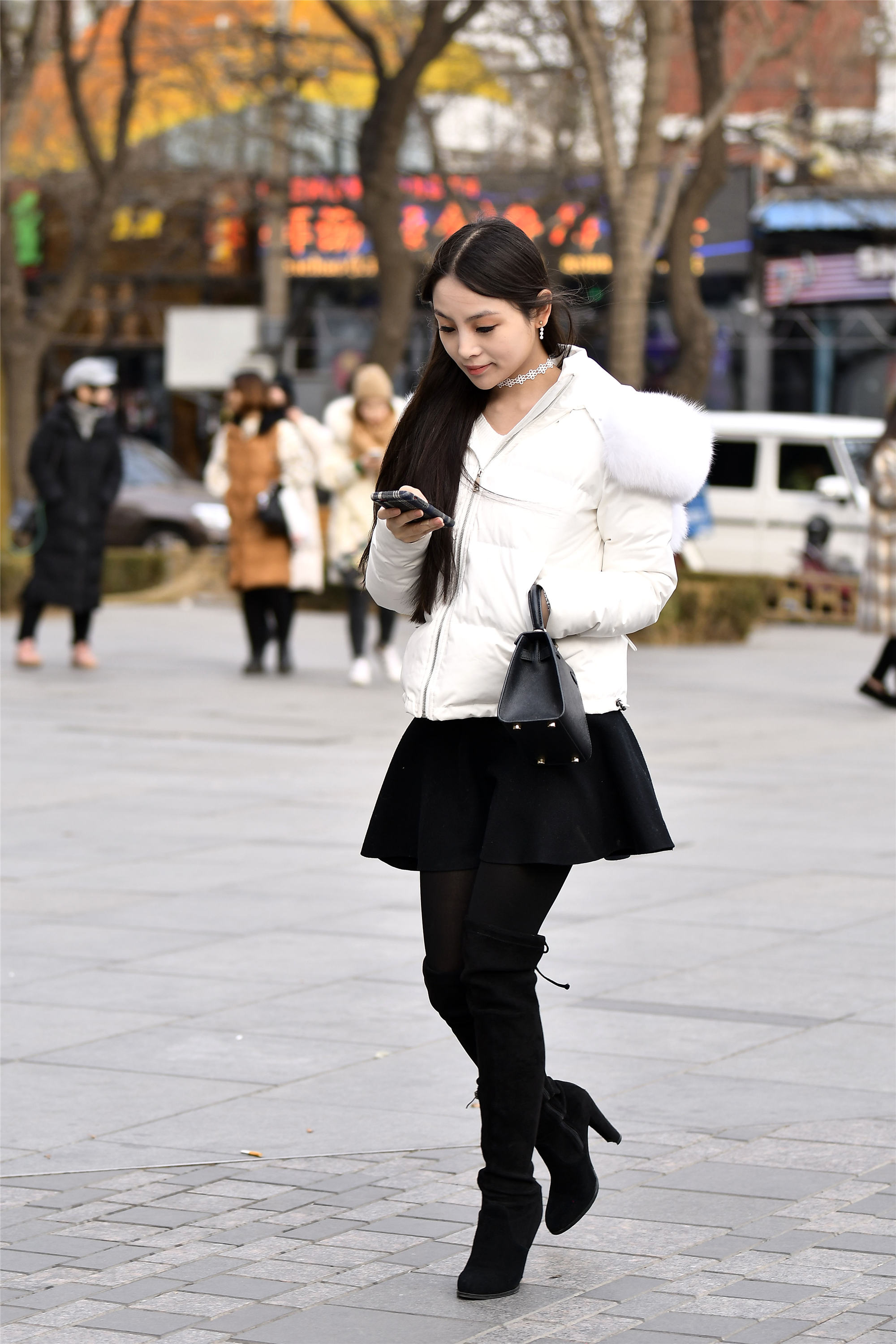 在冬天,身材骨感的姑娘,穿着过膝靴会更漂亮,也可以很好的展示自己身材,也有着很好的搭配效果,白色短款羽绒服,搭配着黑色短裙,黑色打底裤搭配着黑色长筒靴,过膝的款式让她看起来更显瘦,而且高跟的款式让她看起来高挑一些,而且也很有简约的风格。