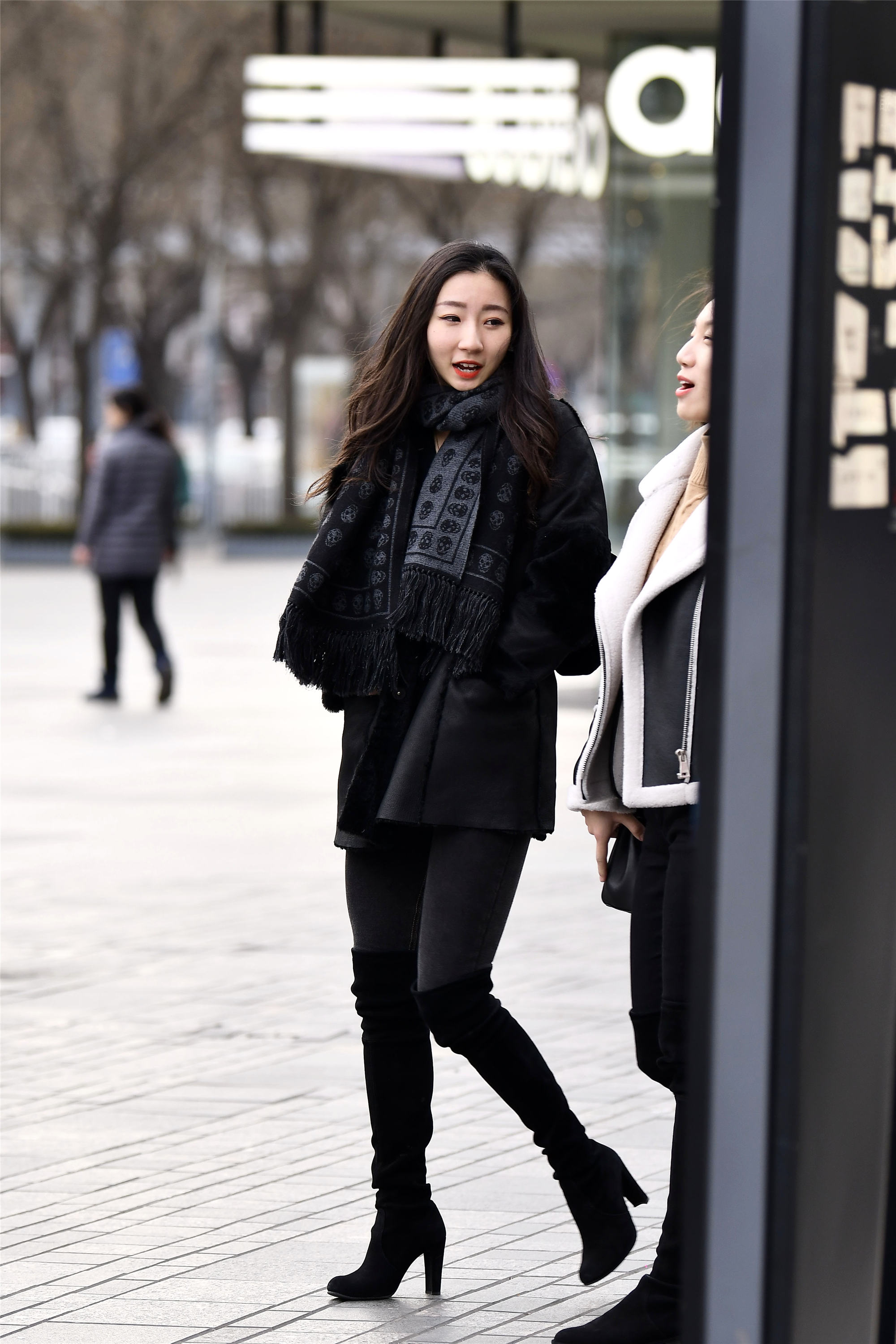 一身黑色的搭配,也会搭配的很漂亮,而且小姐姐也很会搭配,黑色短款上衣搭配出处很不错的保暖效果,黑色打底裤搭配着一双黑色过膝长靴,姑娘身材显得匀称纤细,要不然也不会有这么漂亮的效果,粗跟款式,让走路更加平稳,弧度也特别的好看,这才是冬天最美的搭配。