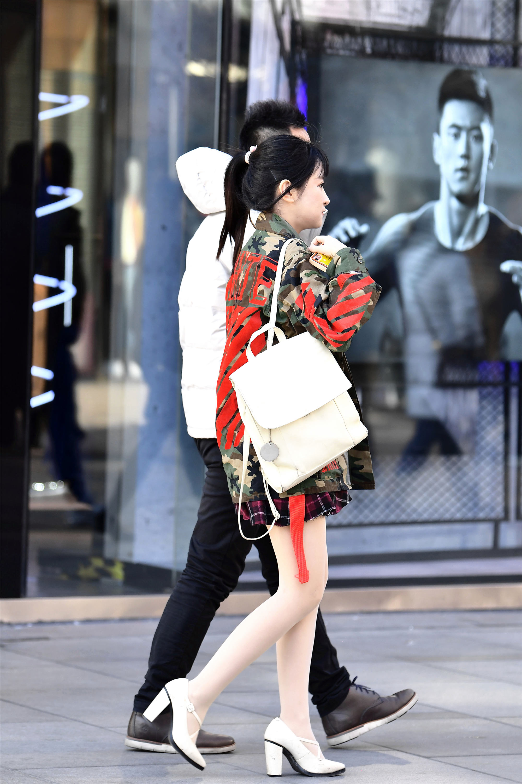 冬天还爱出门逛街的,大部分是北方的姑娘,她们可以把自己搭配的很漂亮,到步行街逛街,就要展示自己的美,也让别人去看自己的搭配,一身漂亮的衣服,让逛街的姑娘更自信,看一下这位小姐姐一件中短款的迷彩棉服,搭配一双白色厚丝袜,很不错的保暖效果,一双白色高跟鞋,而且姑娘身材挺拔,这样穿着高跟鞋才有气质。