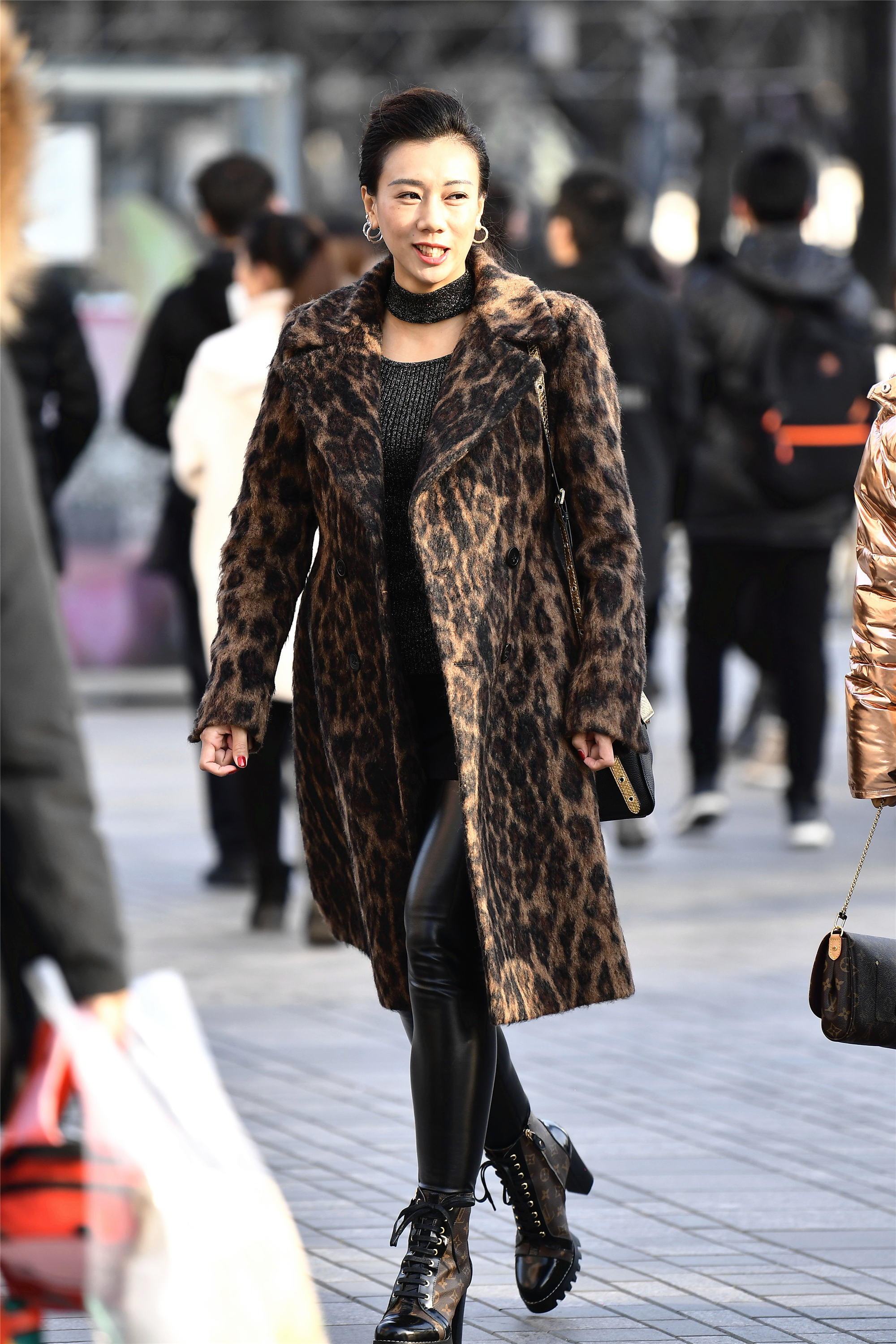 有些姐姐特别会选择衣服,冬天也可以穿搭出简约流畅的风格,她们穿的不多,却也不是特别的冷,姑娘这一身大衣,豹纹的款式,有些皮草的感觉,非常不错,针织内搭非常不错,一条黑色而皮裤,让姑娘身材看起来更加漂亮,一双粗跟的皮鞋,也是非常漂亮,色彩和质感都非常漂亮,姐姐这一身搭配是暗色调,看似很低调,却很有质感的一身搭配。