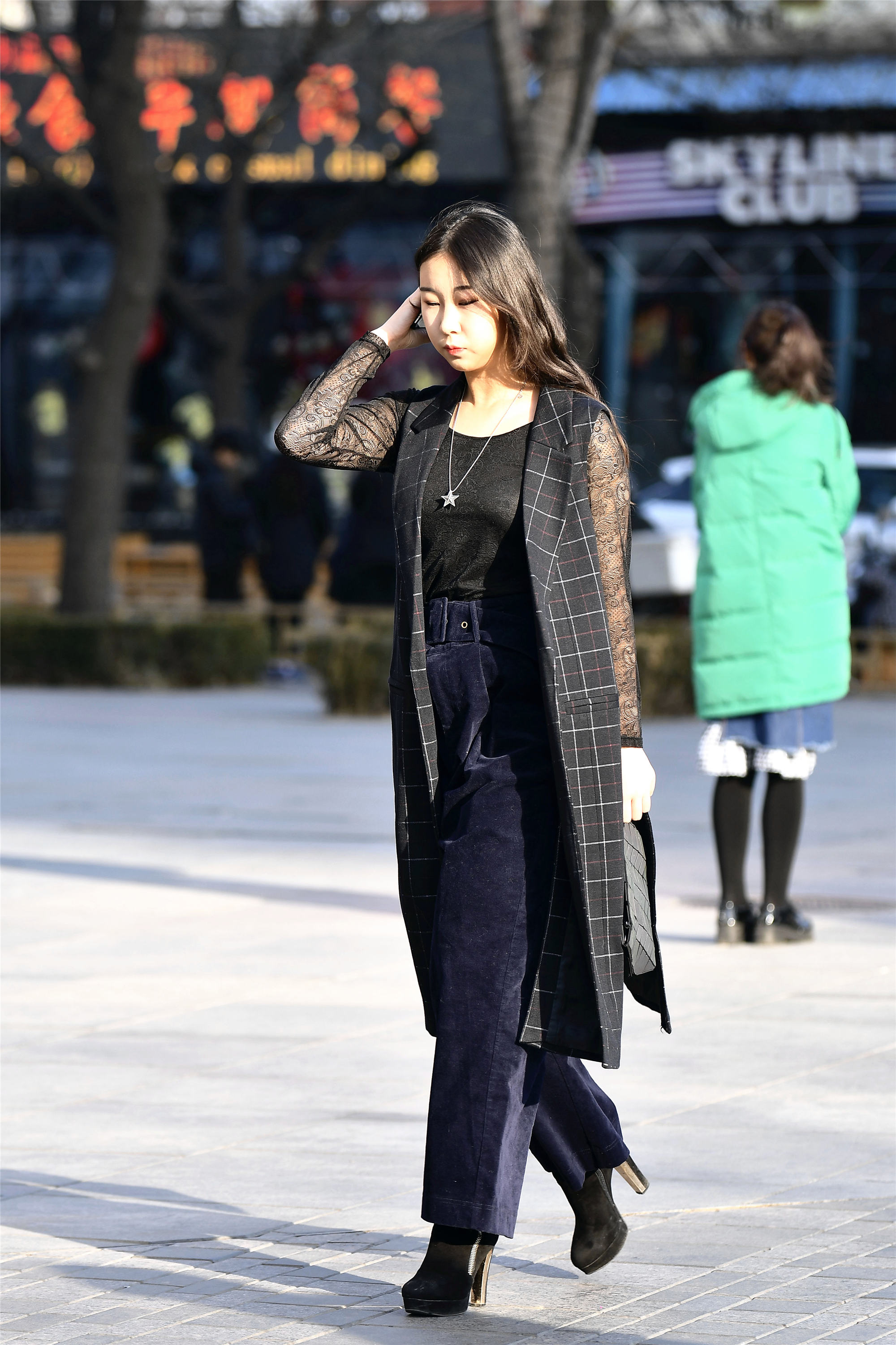 冬天到底有多冷,时尚街区的姑娘会用搭配来给你不同的答案,在这里可以看到穿着羽绒服逛街的,也有穿着透视装逛街的,每一位时尚姑娘的体质不同,才会有着不同的搭配出现,看一下这位姐姐,她的搭配非常个性,一件无袖格子长衫,搭配一件透视长袖,深蓝色的高腰宽松裤子,一双粗跟二棉鞋,小姐姐走路步子不大,却非常漂亮。