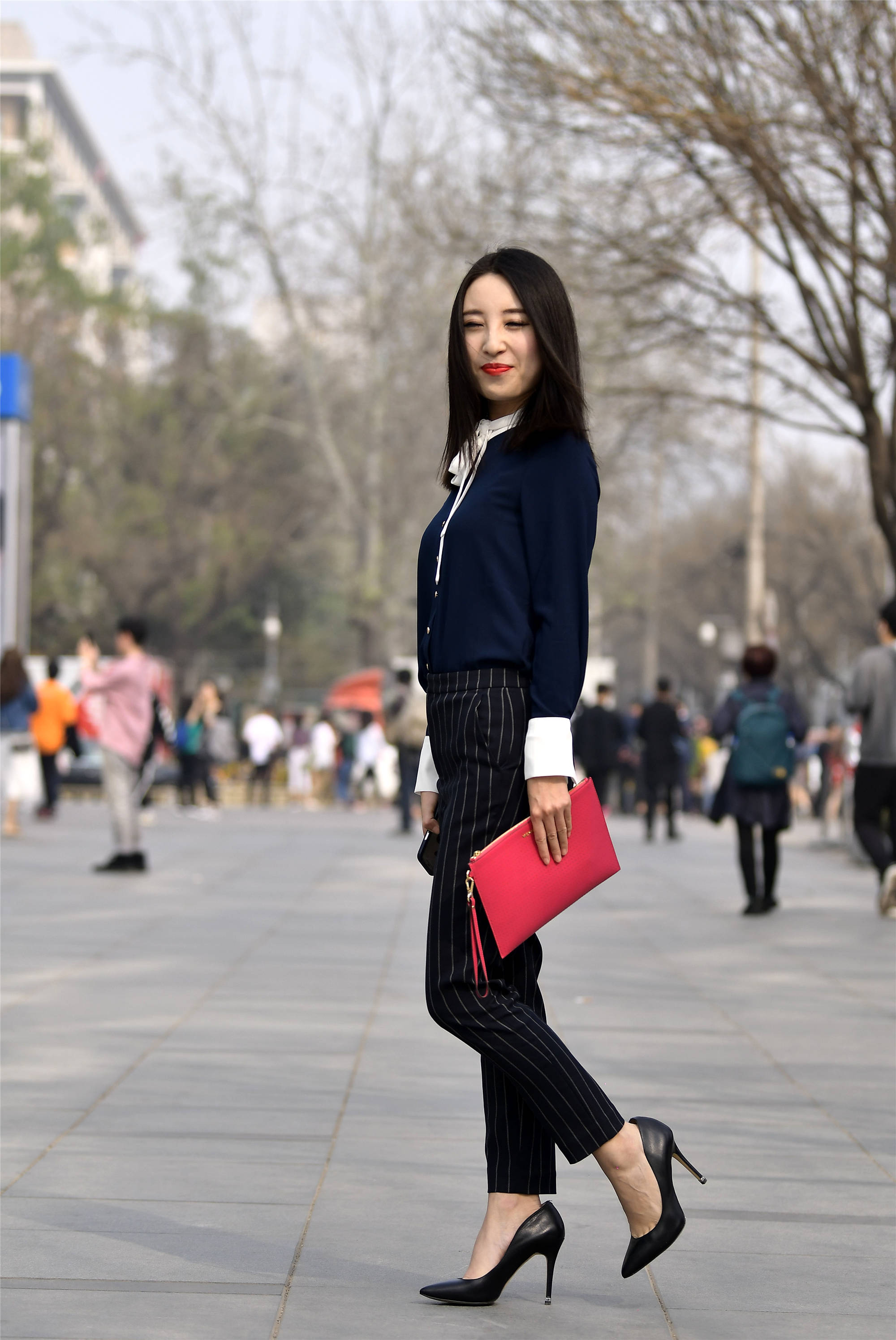 能够穿着尖头细跟鞋的姑娘,她们的搭配也都非常漂亮,而且很有色彩和层次感,白色衬衣搭配一件深色花纹筒裙,高腰款式更显身材高挑和比例,裙子上面的提花,让裙子显得很高级和贵气,一双蓝色尖头细跟鞋,斜面的压花特别的漂亮,而且着一双鞋也很好的提升气质。